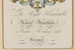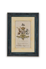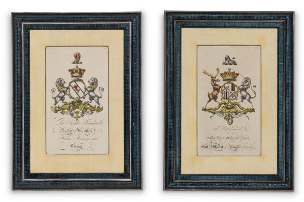 9 English Georgian (18th Cent) hand-colored copper plate engravings of coat of arms in blue with gold trimmed frames (by Joseph Edmondson, 1770) (PRICED EACH)