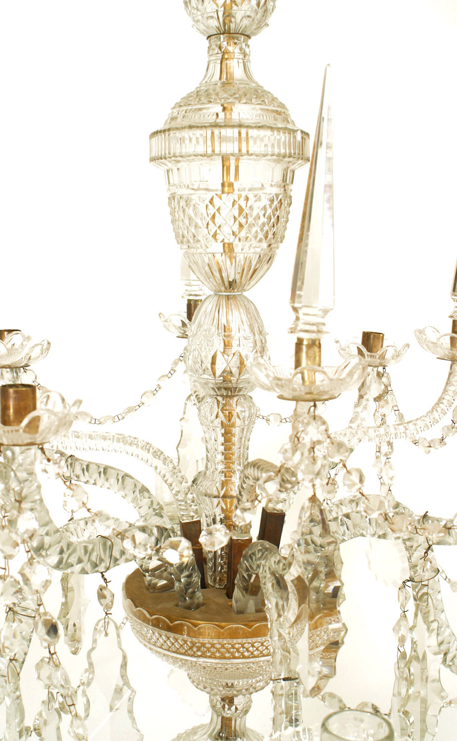 English Georgian (18th Century and latter additions) 8 scroll arm cut crystal chandelier on 2 tiers with 4 arms with obelisks and 3 tiers of swags with a ball finial bottom