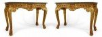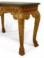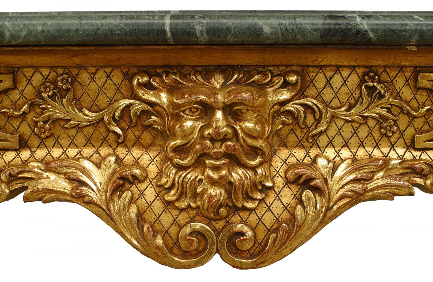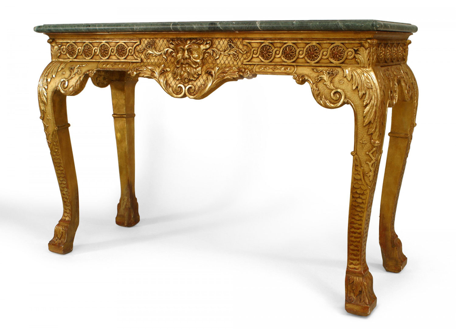 PAIR of English Georgian-style (19/20th Century) gilt carved console tables with mask design on apron with green marble top