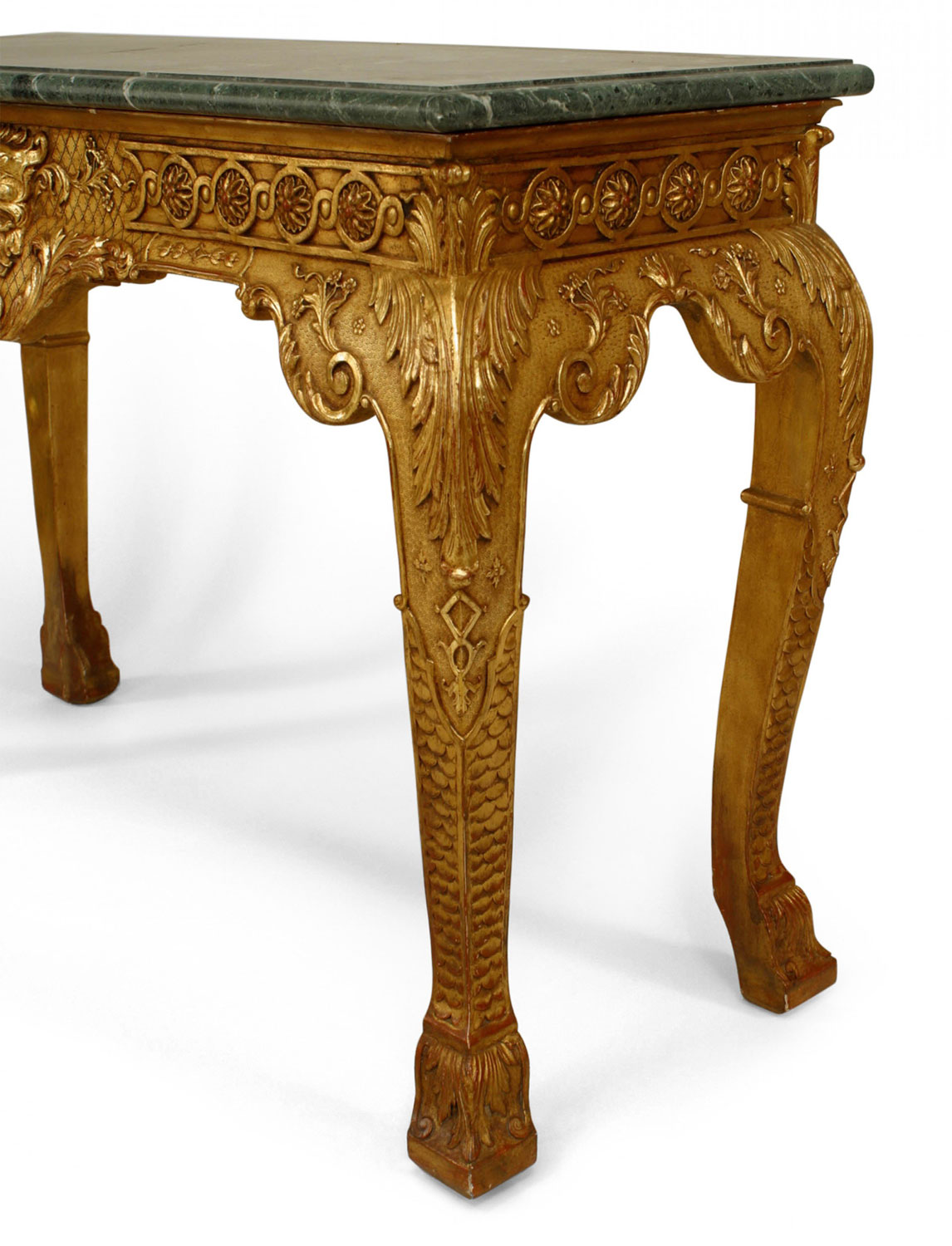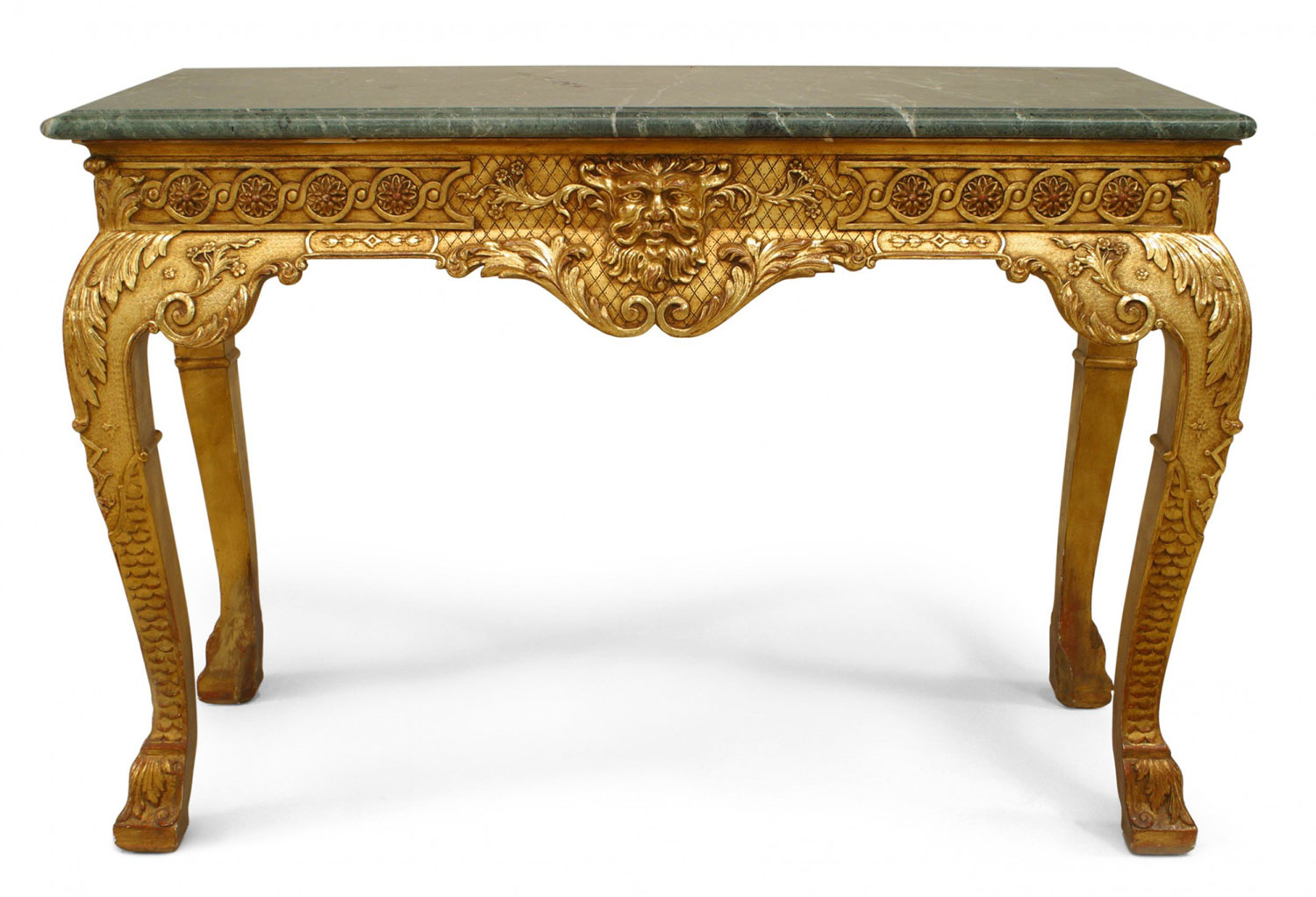 PAIR of English Georgian-style (19/20th Century) gilt carved console tables with mask design on apron with green marble top.