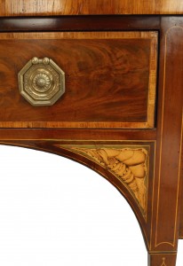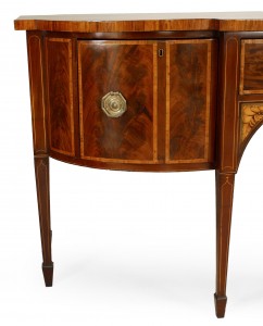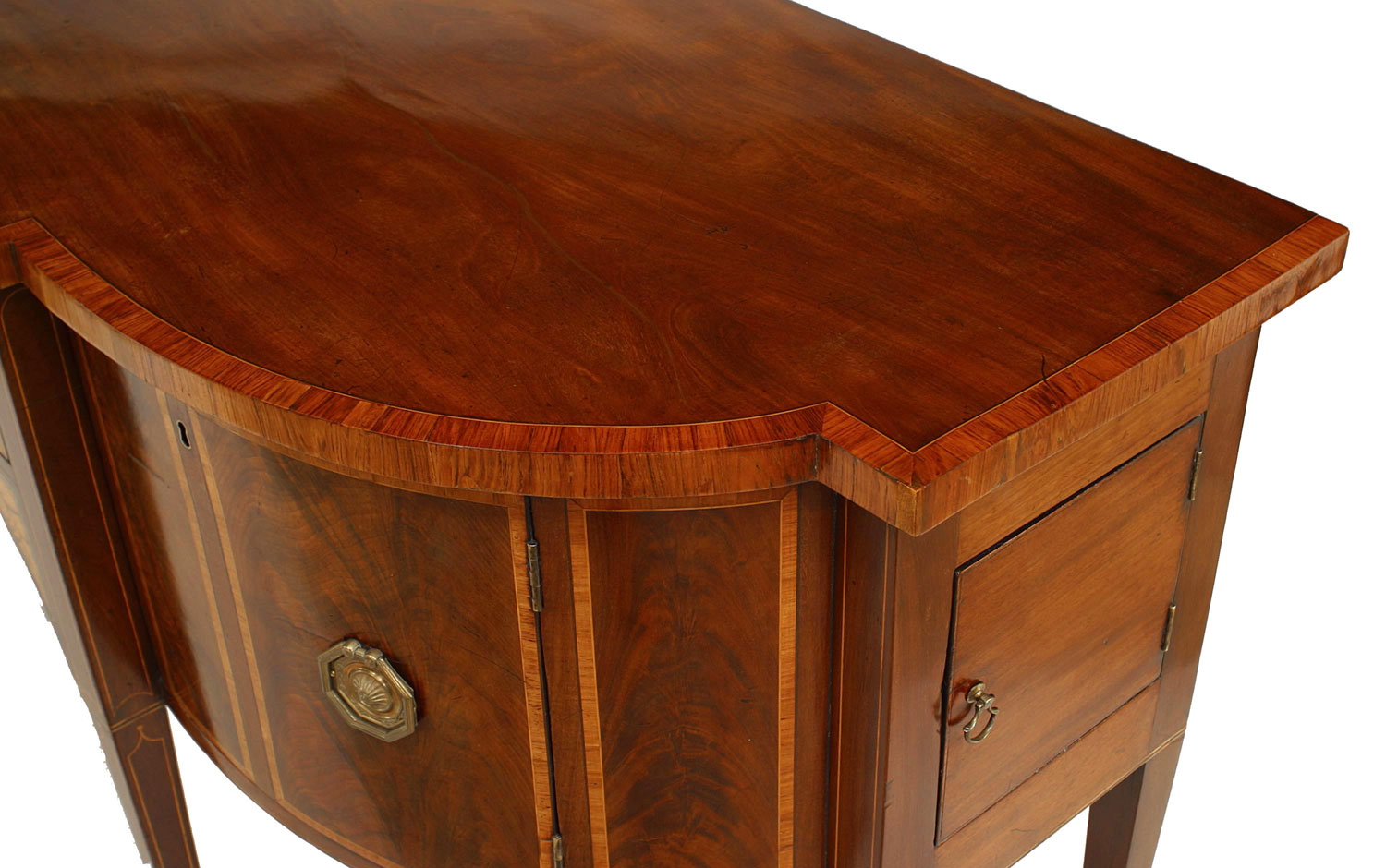 English Georgian mahogany sideboard with bow shaped front and inlaid with cross-banding and panels on either side of center front drawer..
