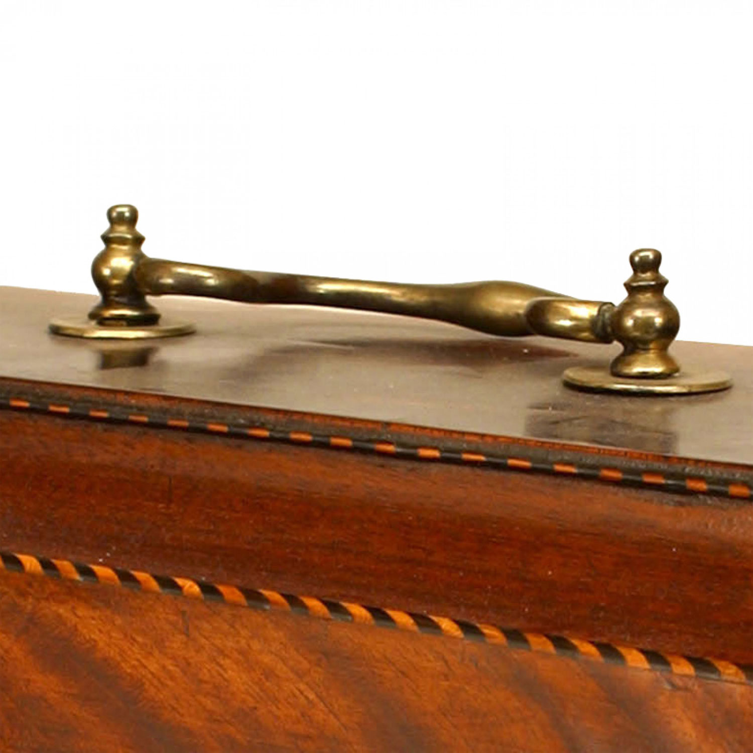 English Georgian (18/19th Century) mahogany tea caddy box on bracket feet with inlaid satinwood and ebony banding and a hinged stepped up top with a brass handle and escutcheon