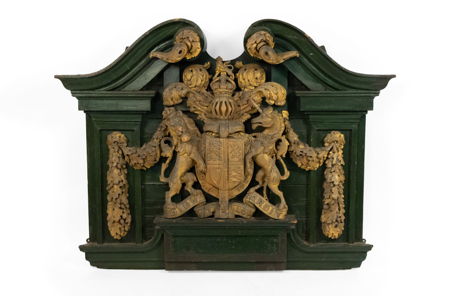 English Georgian (18/19th Century) green painted and carved gilt wall plaque of coat of arms with unicorn & lion and broken pediment top..