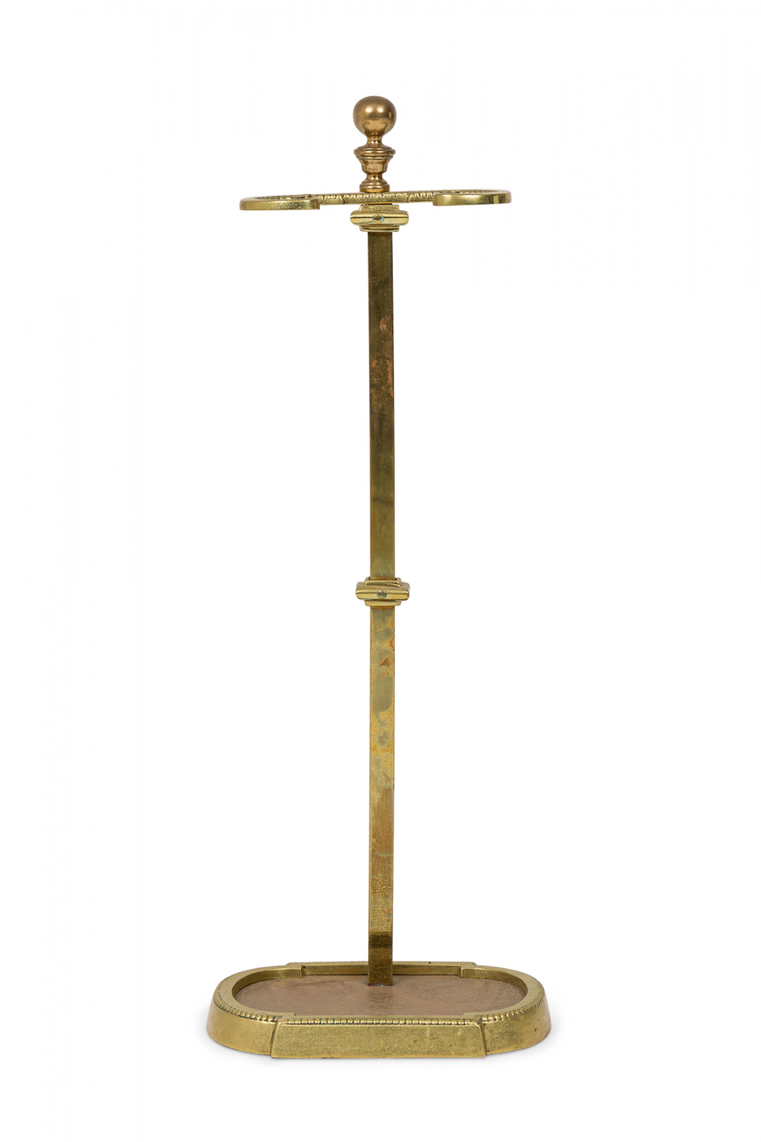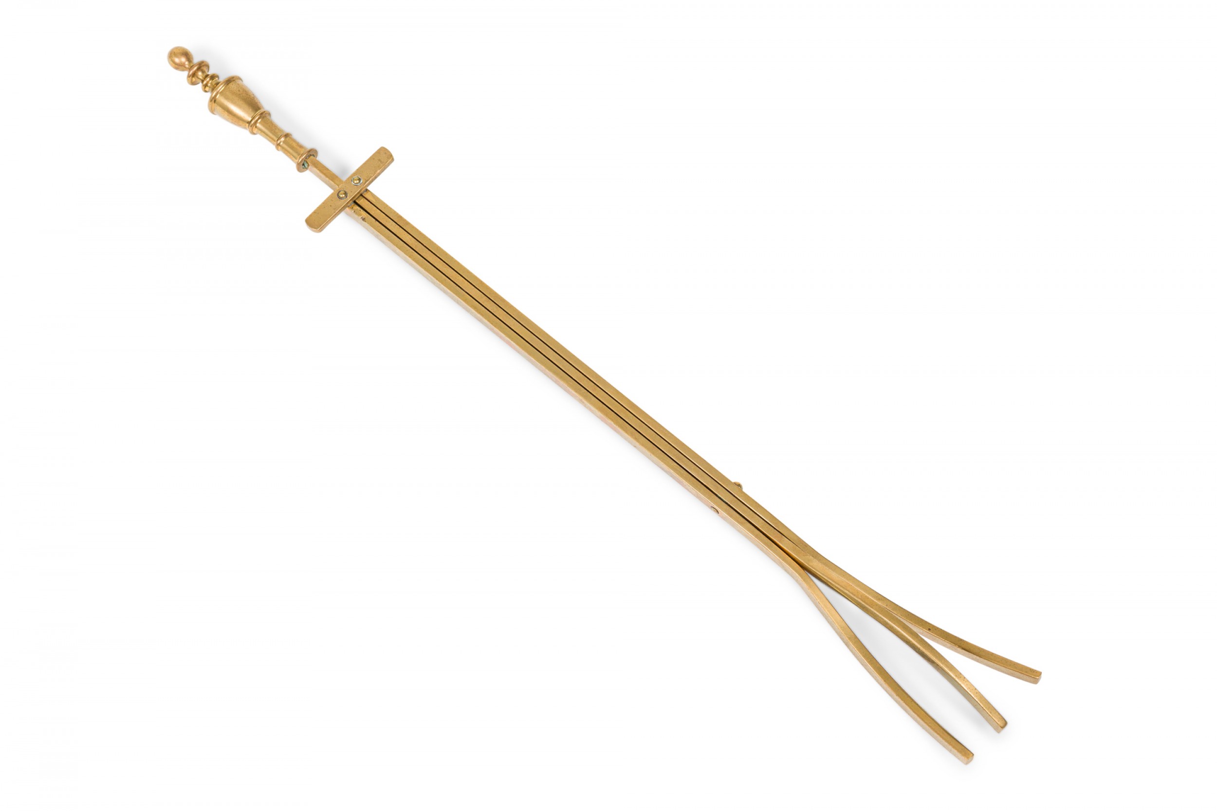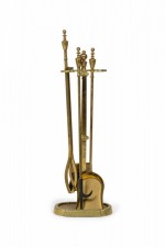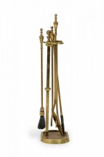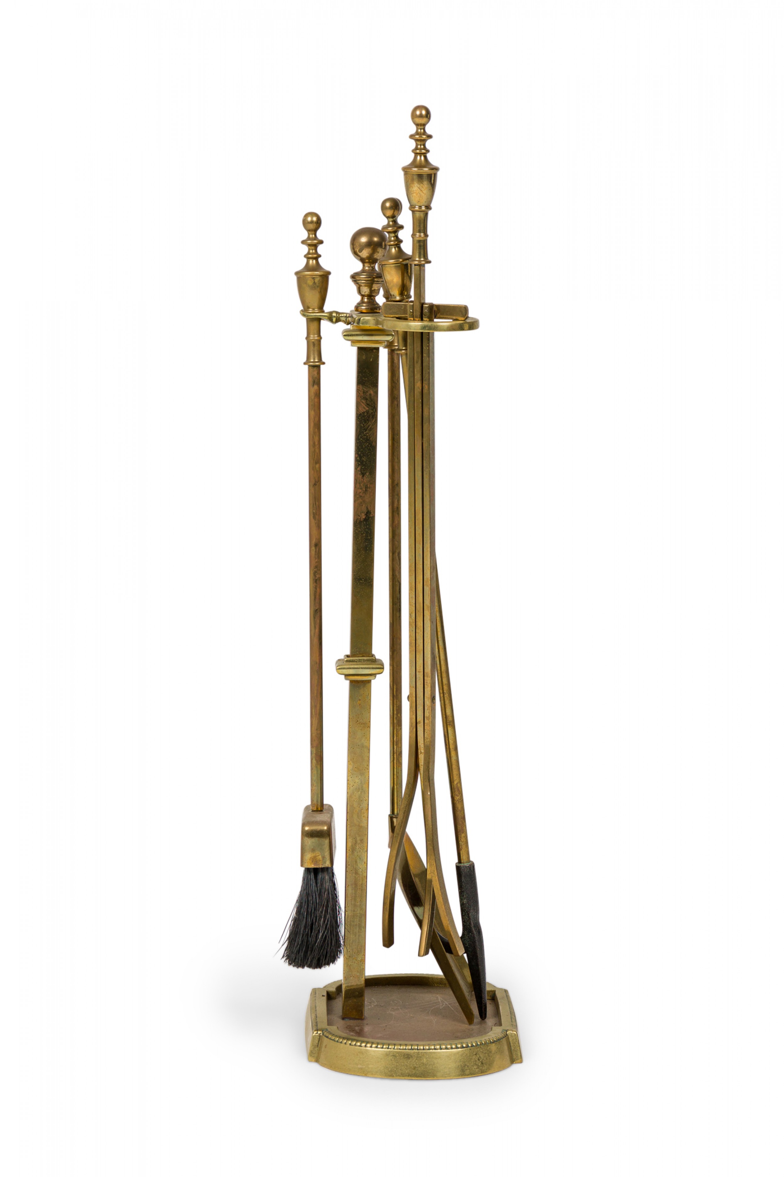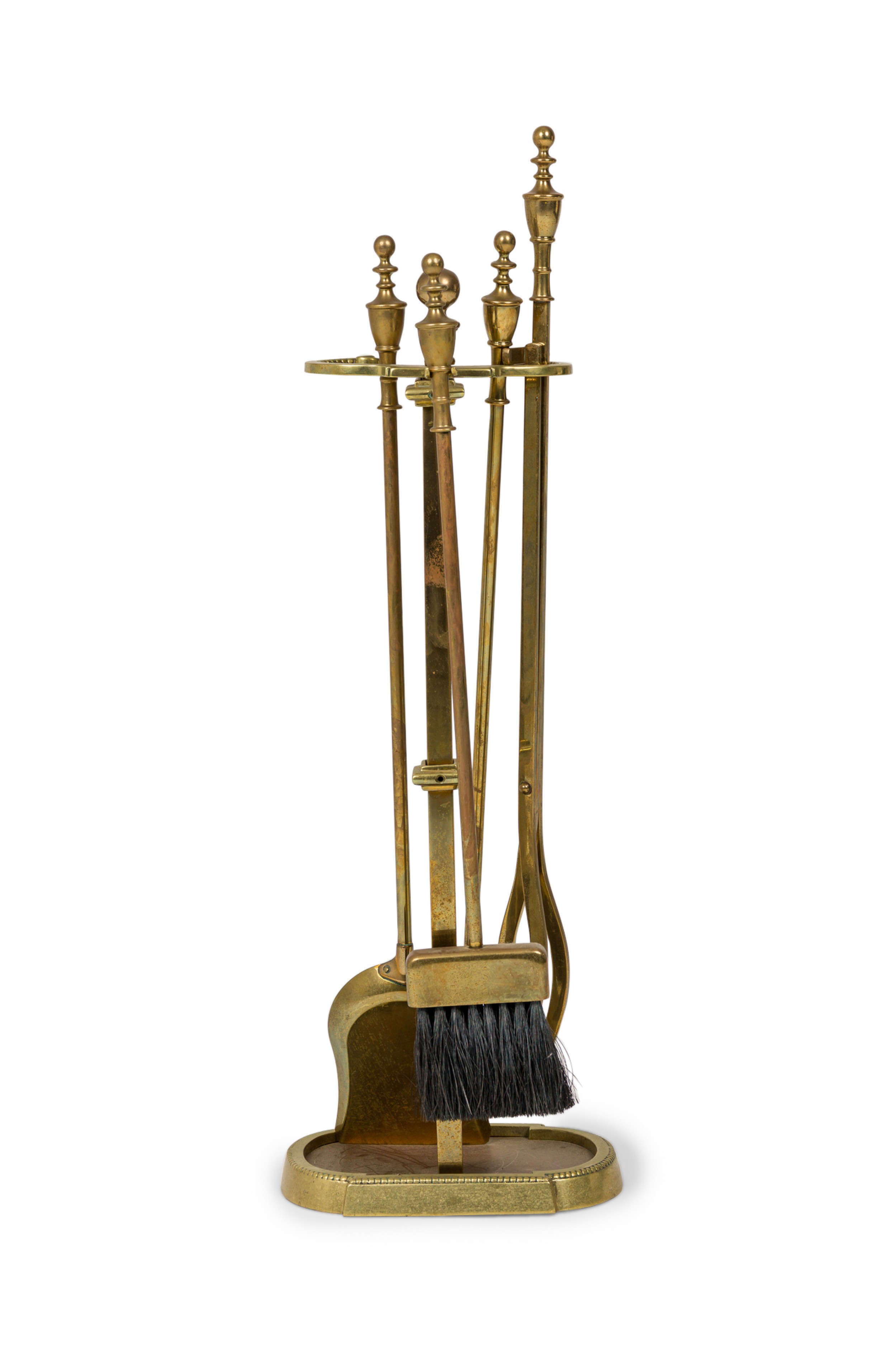 English Georgian-style fire tool set comprised of a brush, shovel, poker and tongs with brass finials, supported in a brass rack with and oval base..