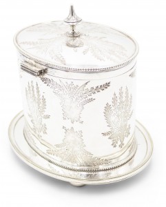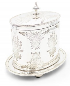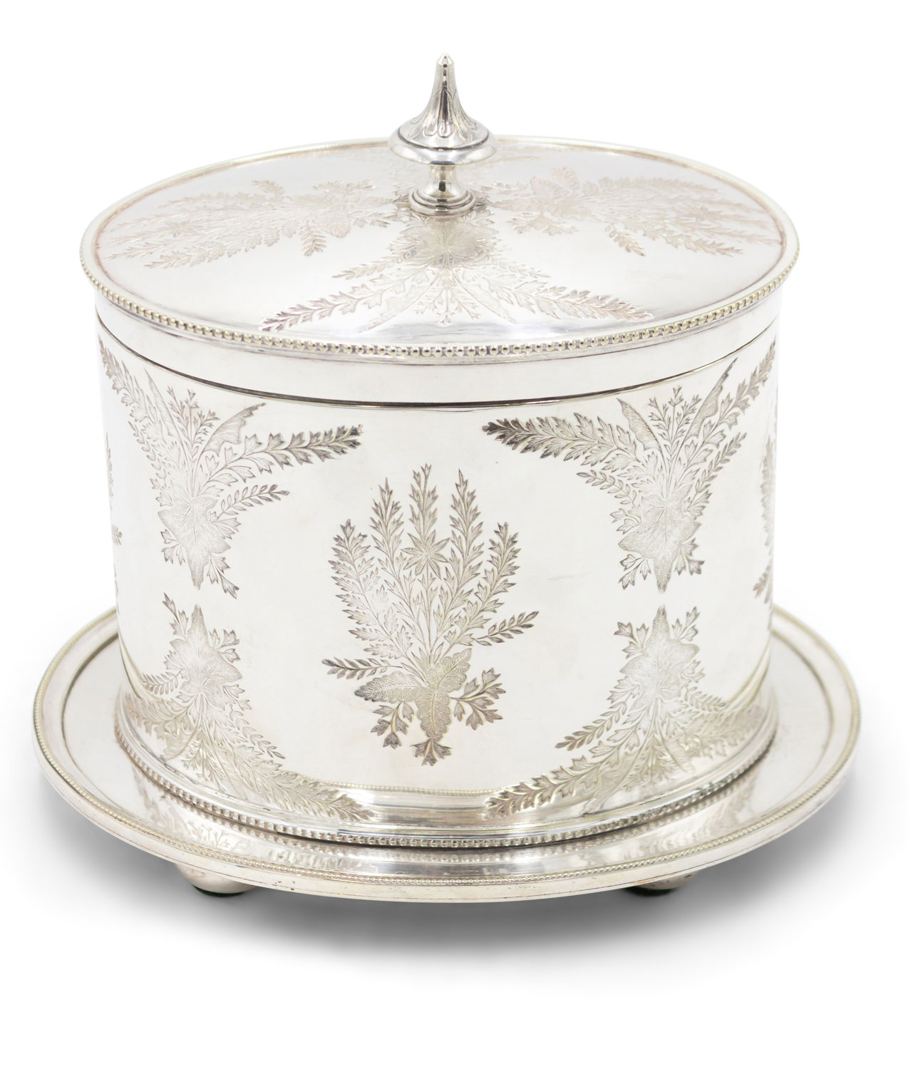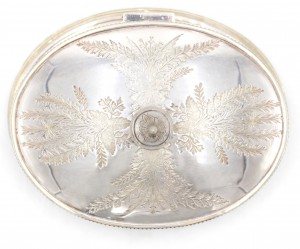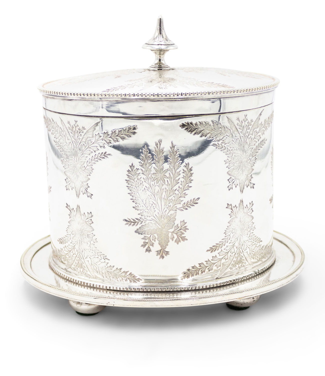 English Georgian-style (19/20th Century) oval silver-plate box (tea caddy) with etched floral details and finial top on an oval tray base (with hallmarks).