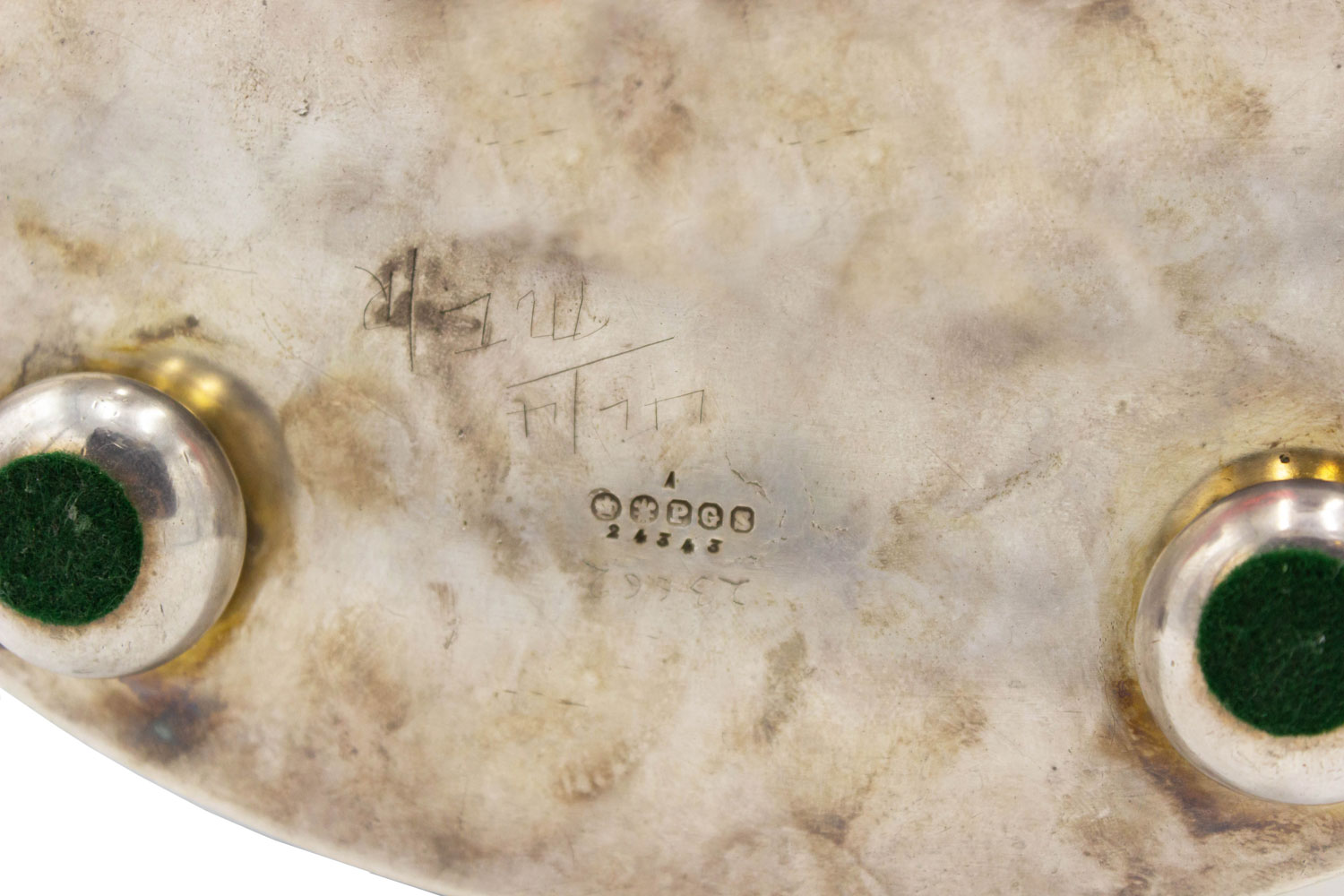 English Georgian-style (19/20th Century) oval silver-plate box (tea caddy) with etched floral details and finial top on an oval tray base (with hallmarks)