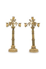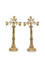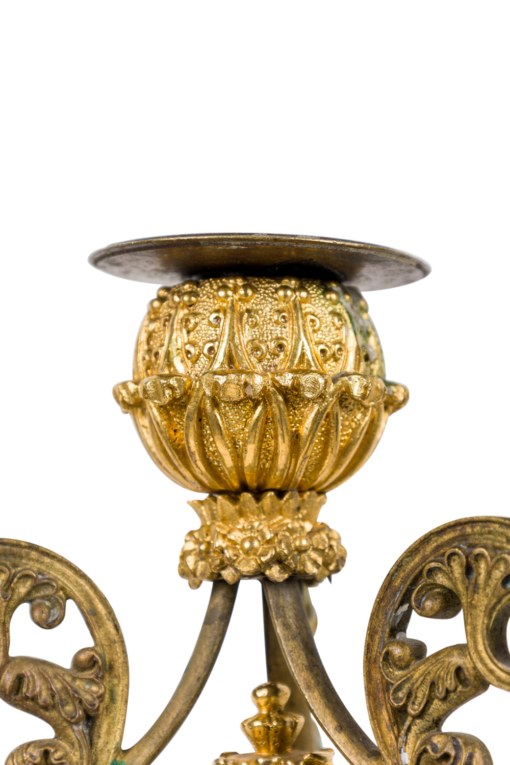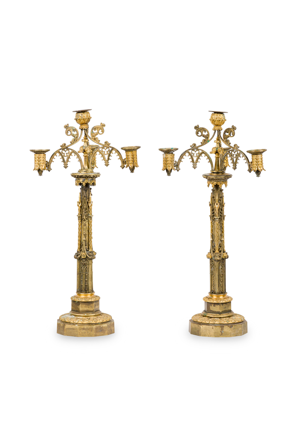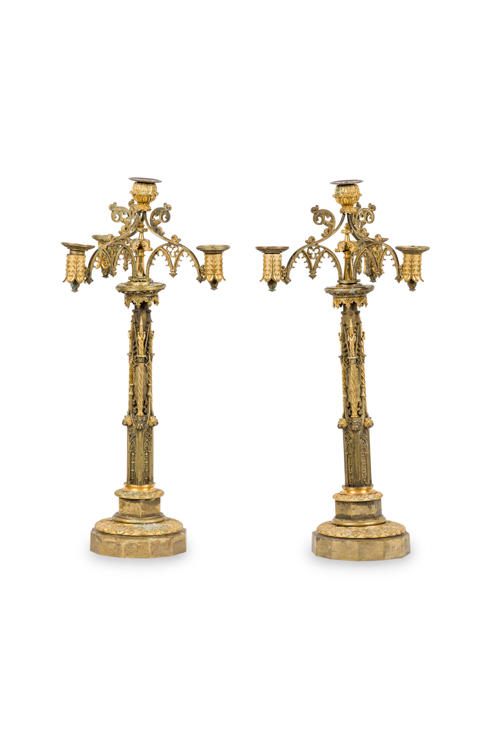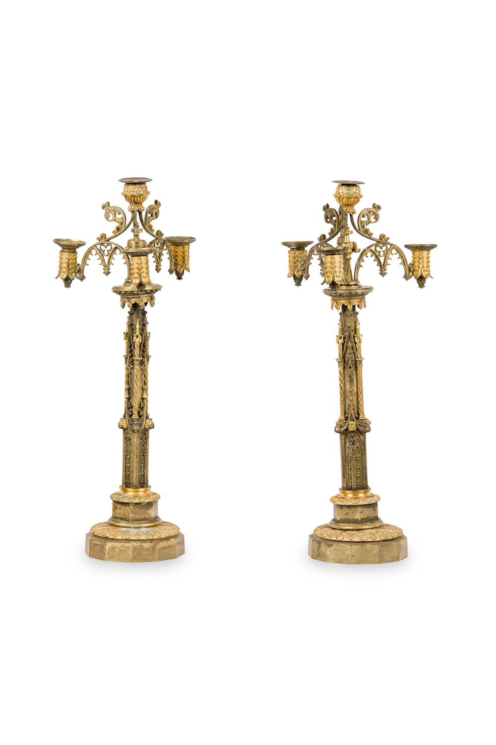 PAIR of English Gothic Revival-style (19th Century) bronze dore 3 arm candelabras with center arms. (PRICED AS PAIR)