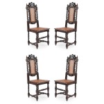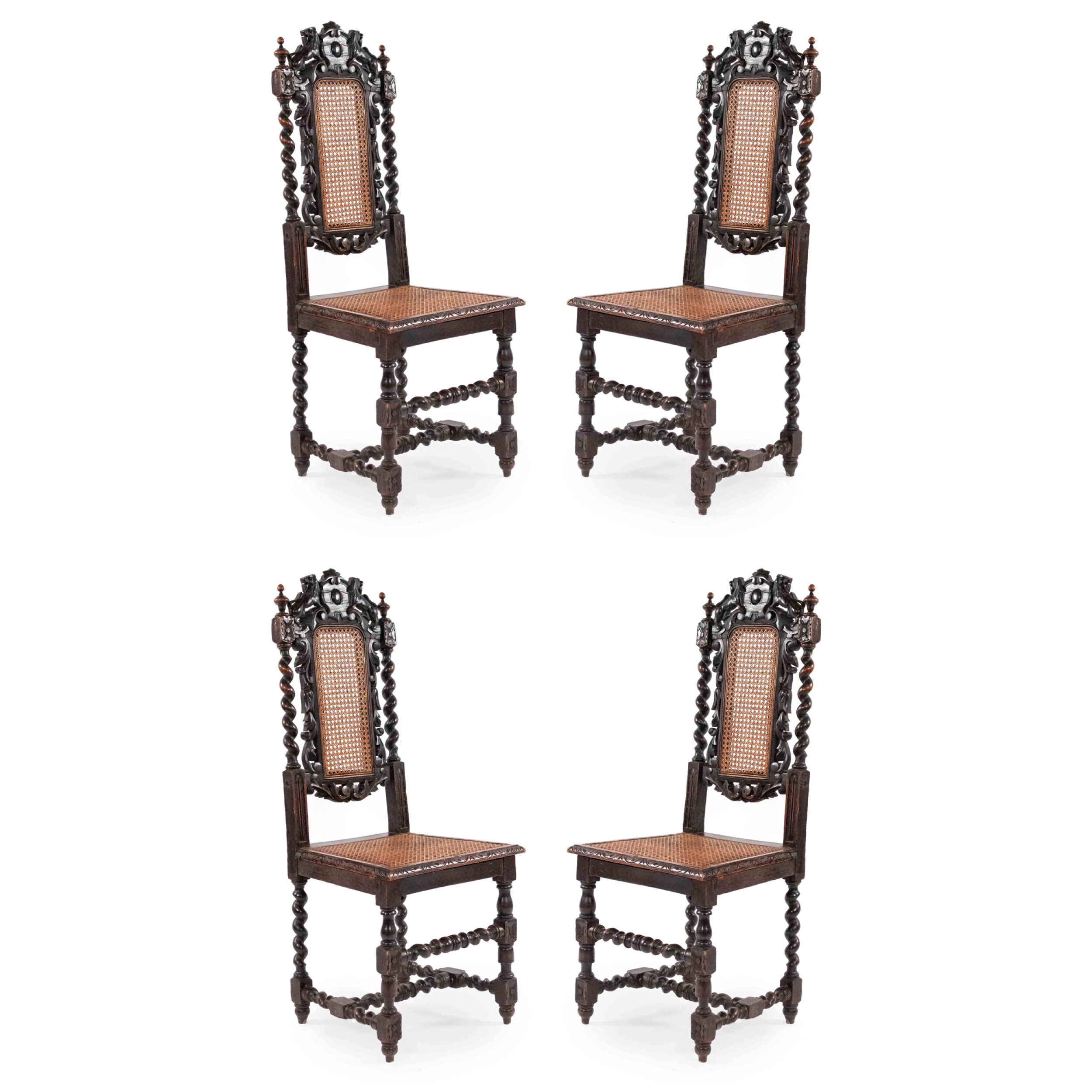SET of 4 English Jacobean style oak side chairs with cane seat and back and lions on top of back. (19/20th Cent.).