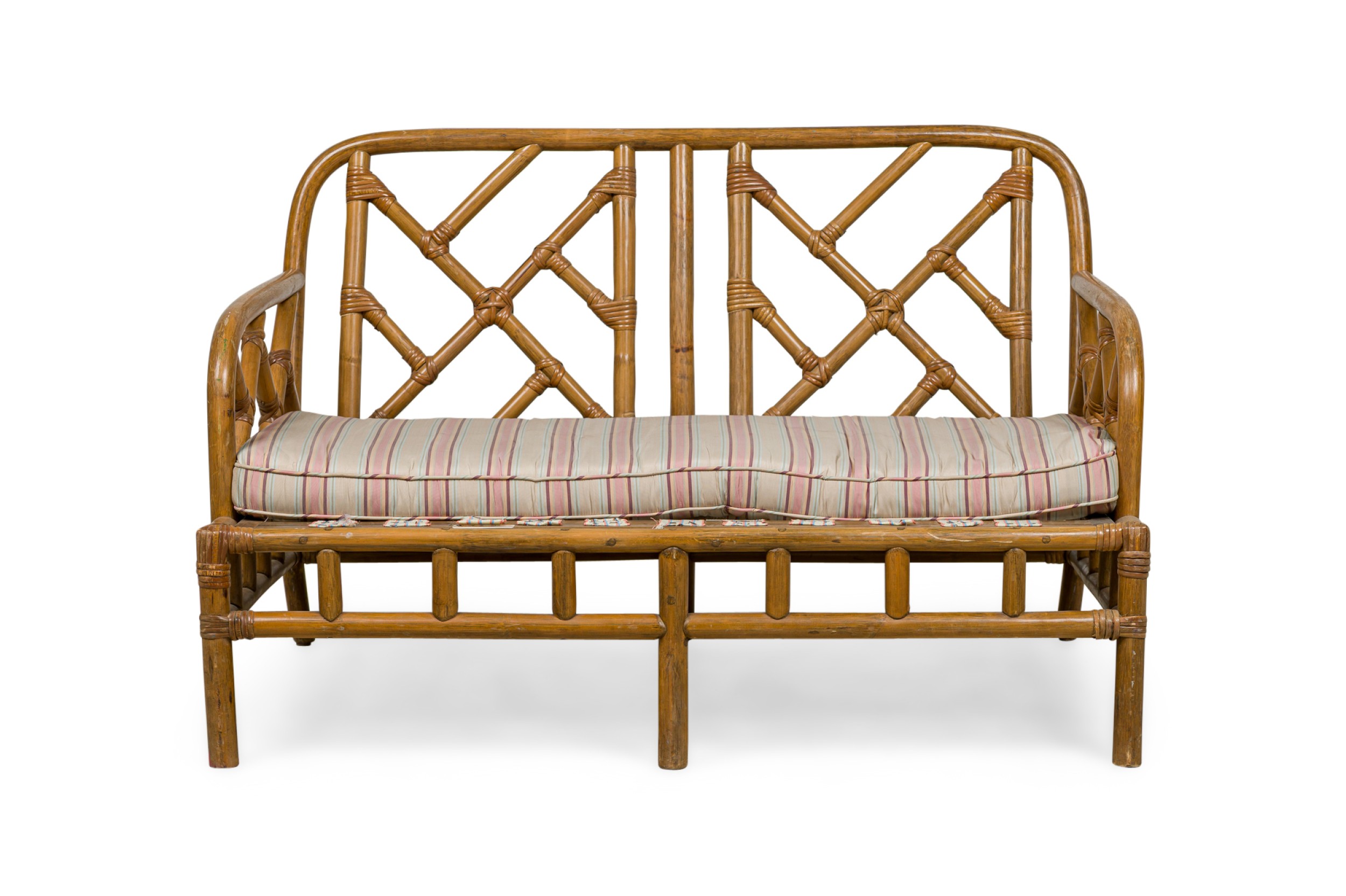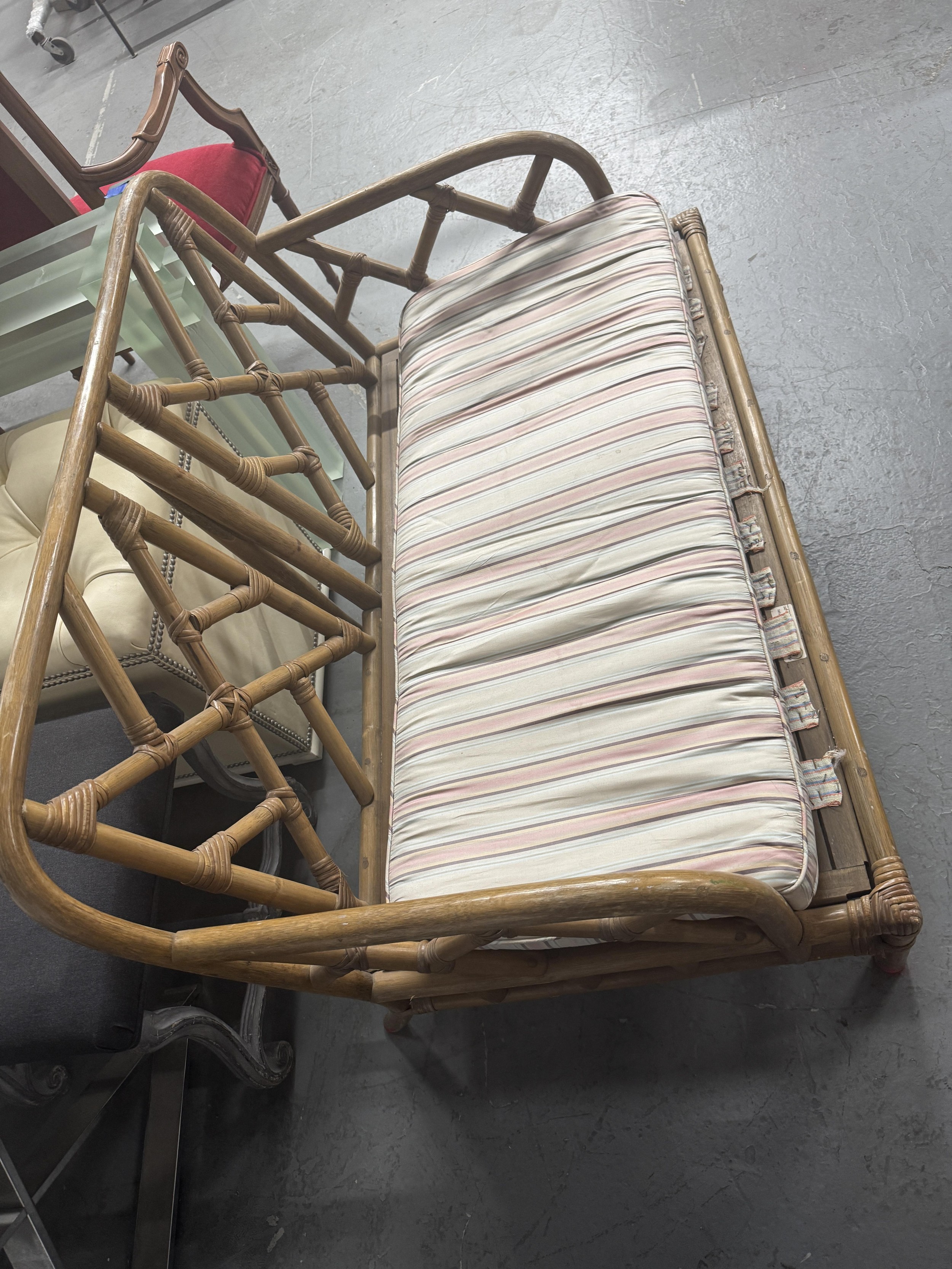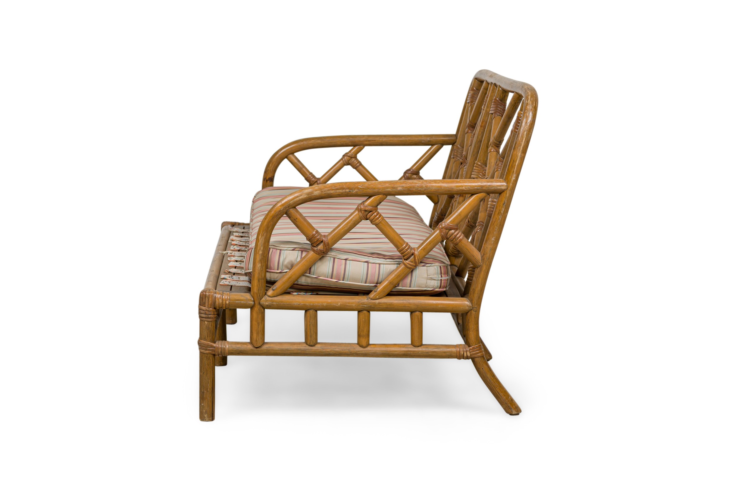 Mid-Century Bamboo loveseat with lattice design back and side arms with a yellow striped upholstered seat cushion.