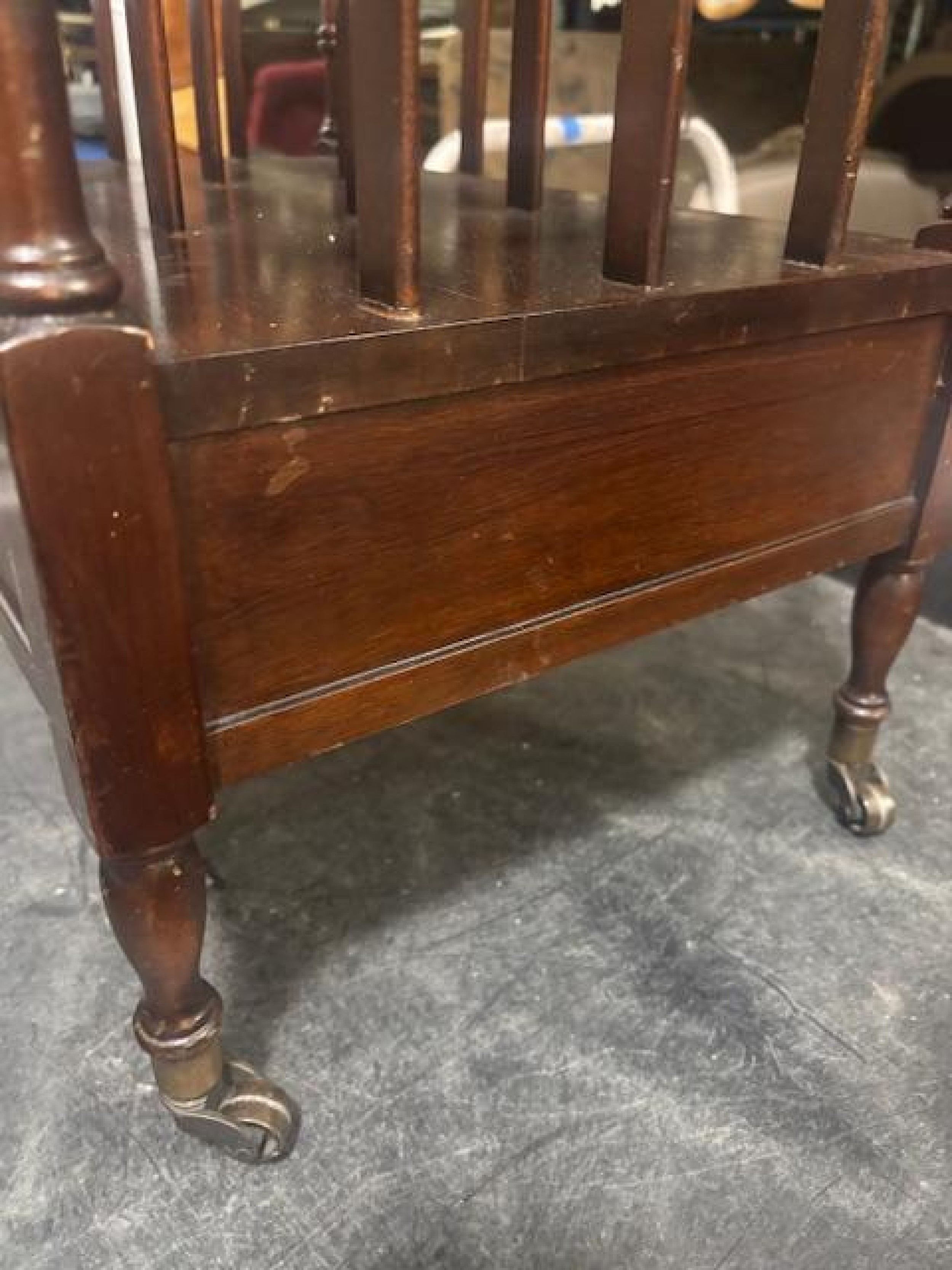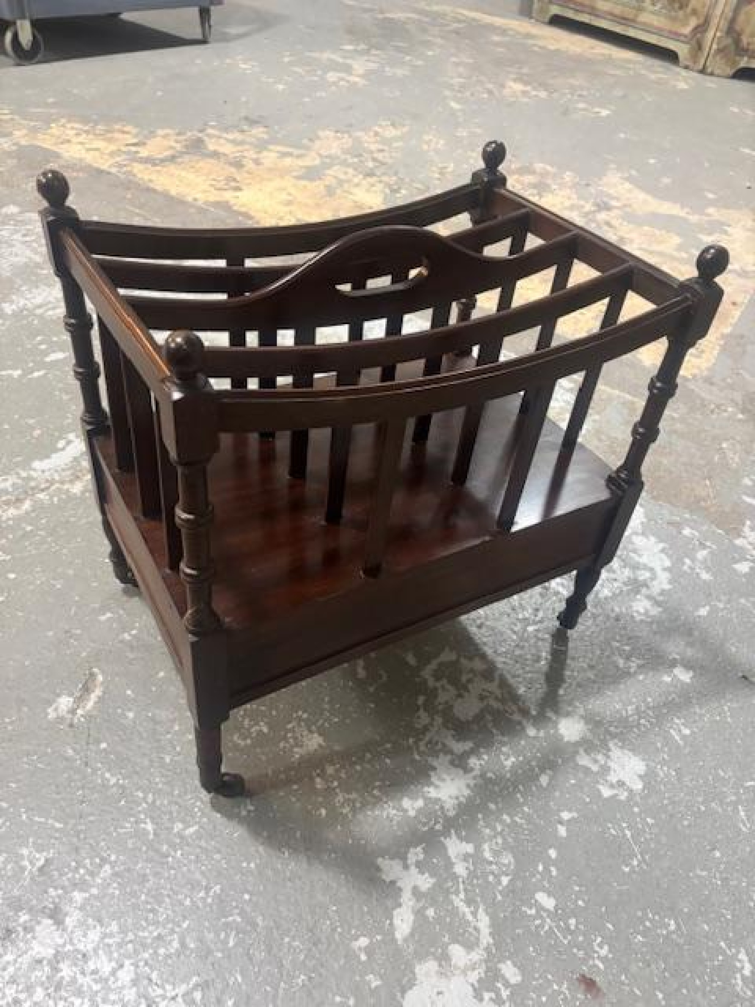 English Victorian style (20th Century) mahogany magazine / canterbury stand with 4 open slots and a handle in the middle (1 LEG replaced)