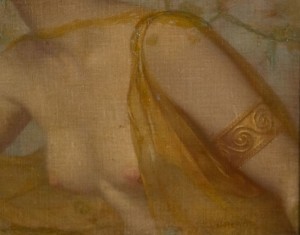English (19th Cent) Pre-Raphaelite style gold framed oil painting on board of classical dressed lady holding urn by round window (signed H. READ).