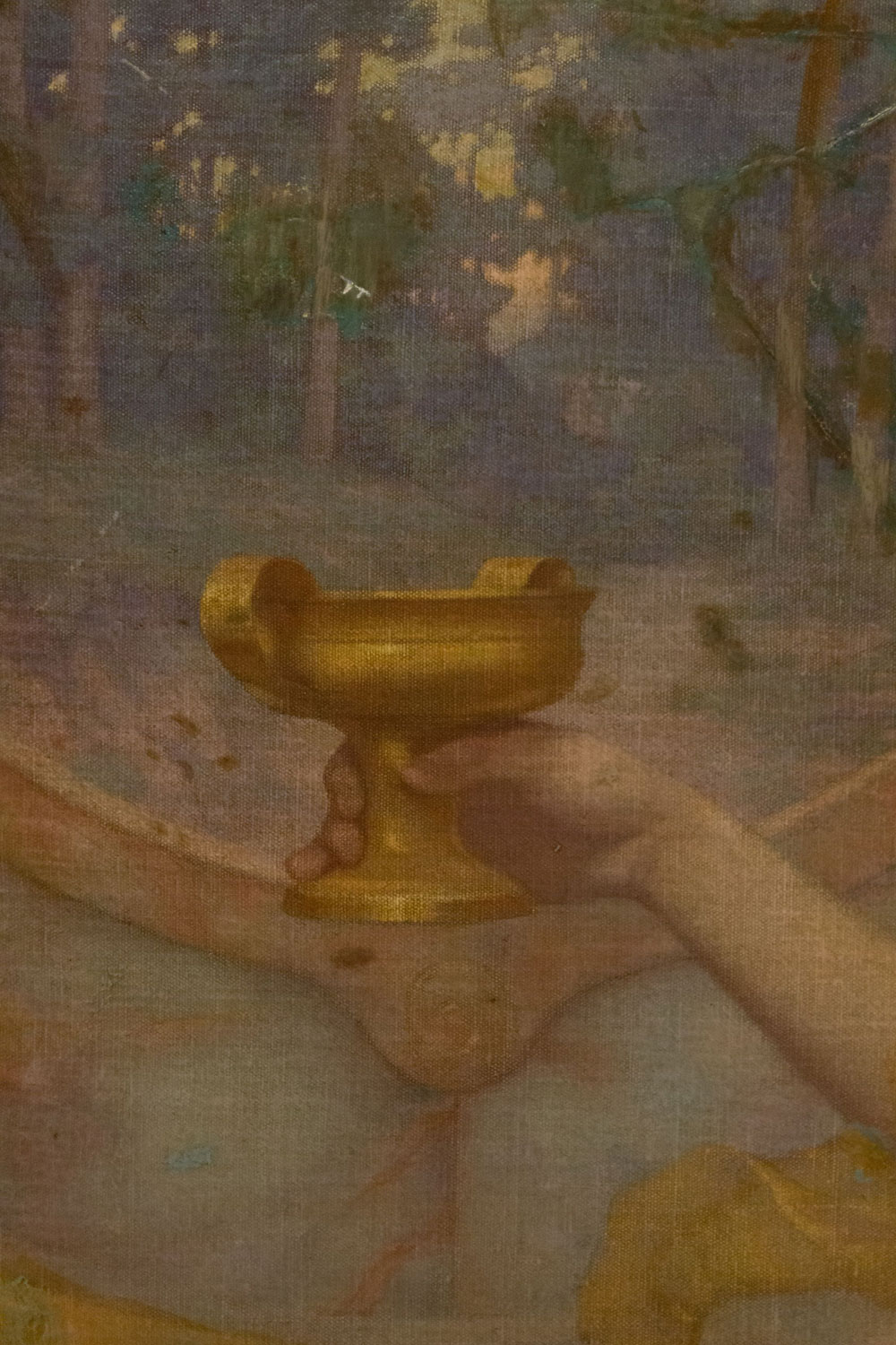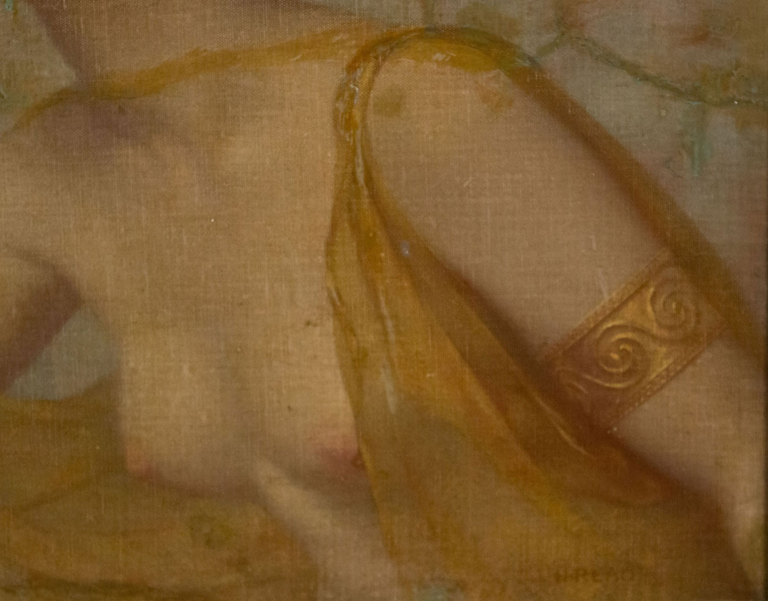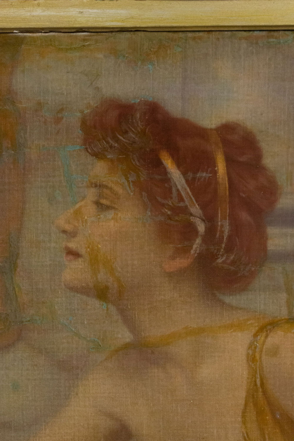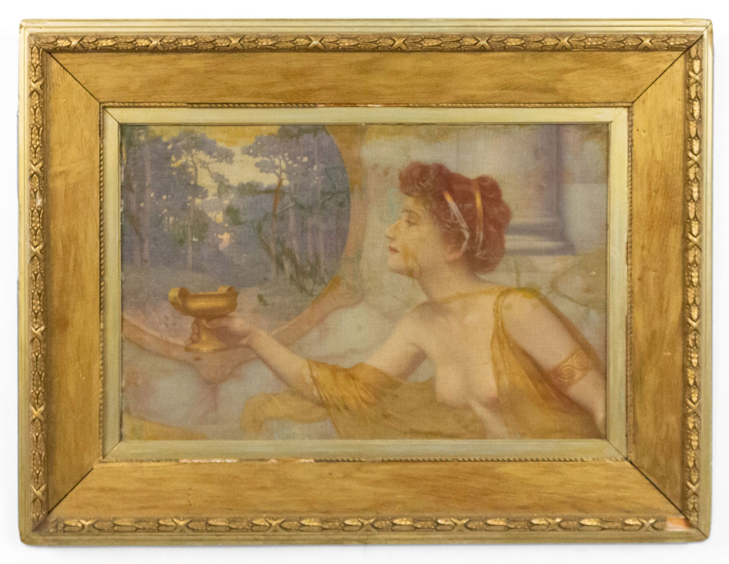 English (19th Cent) Pre-Raphaelite style gold framed oil painting on board of classical dressed lady holding urn by round window (signed H. READ)