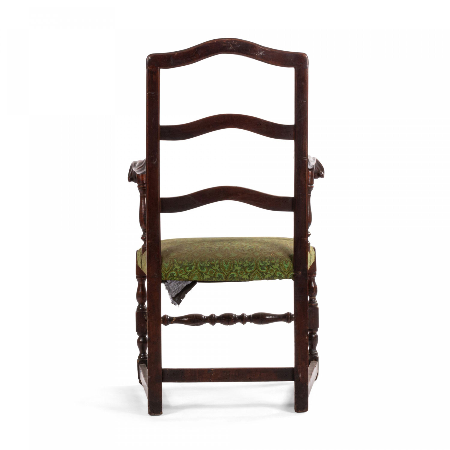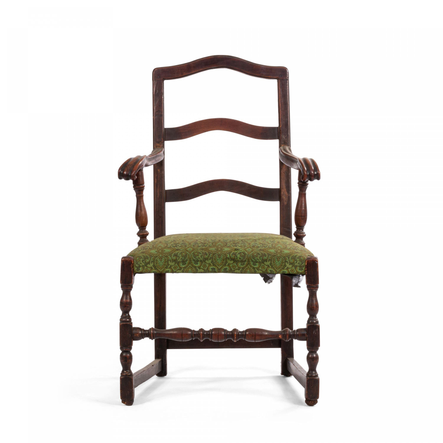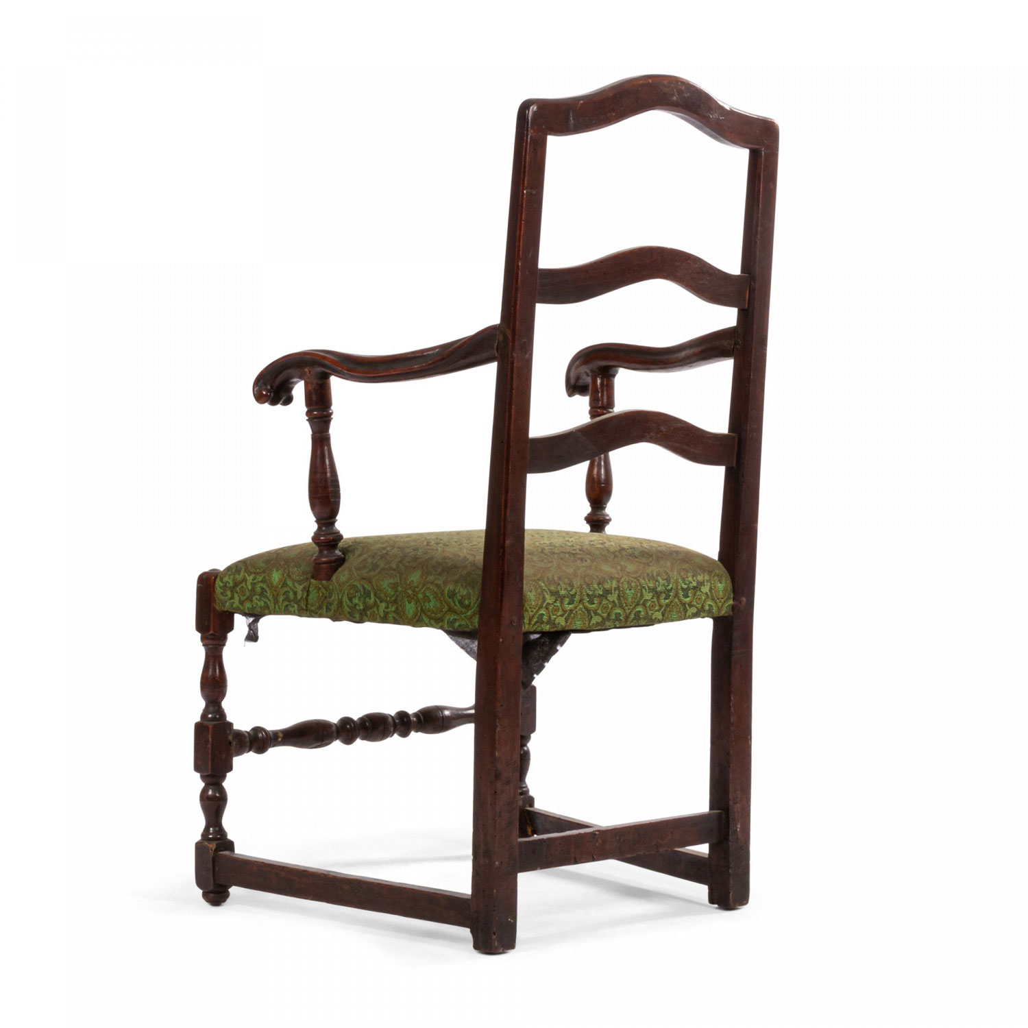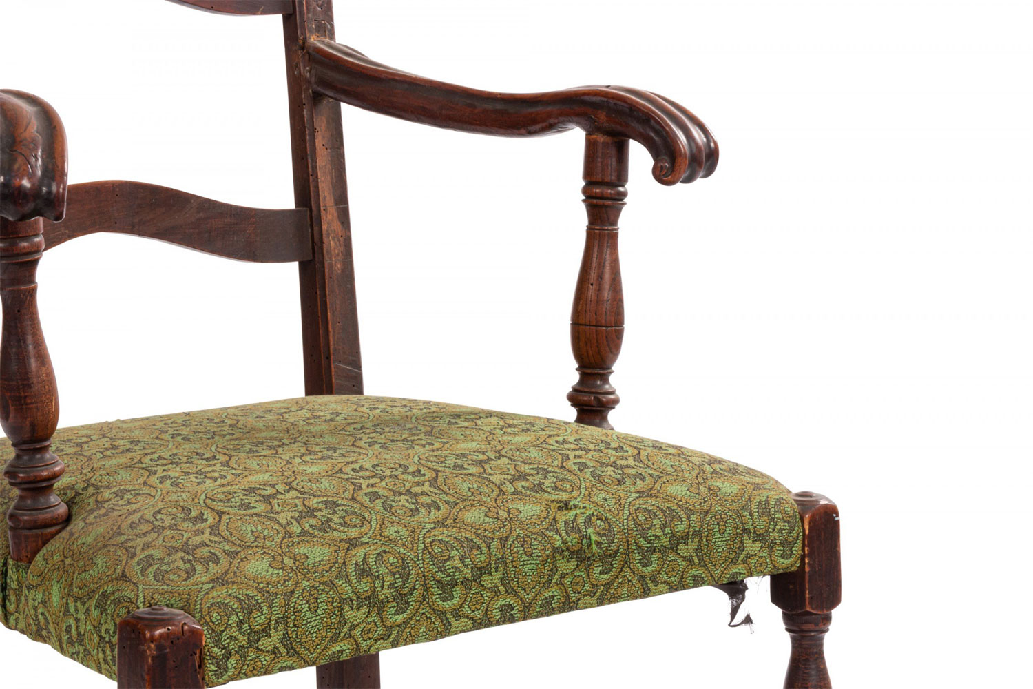 English Provincial Early Georgian (18th Century) walnut and elm ladder back armchair with turned legs joined by a box stretcher and a green upholstered seat..