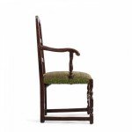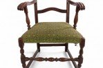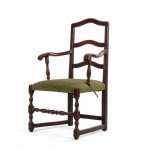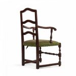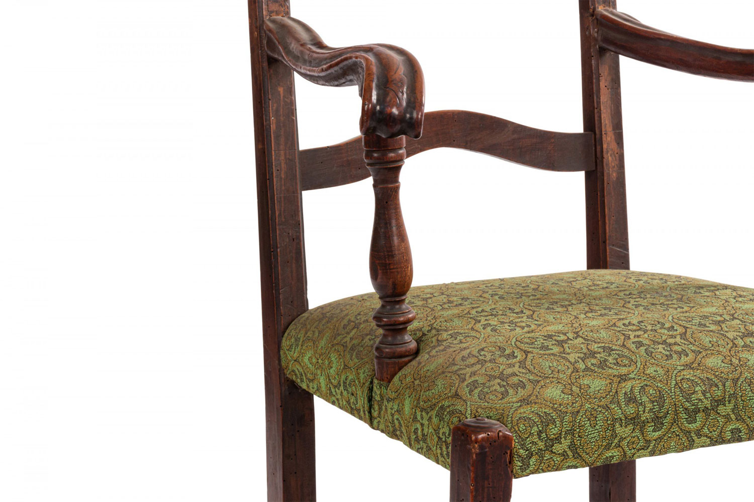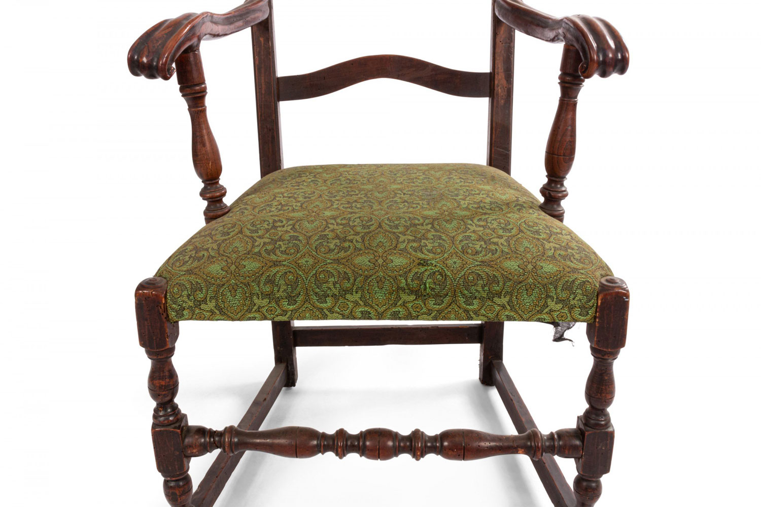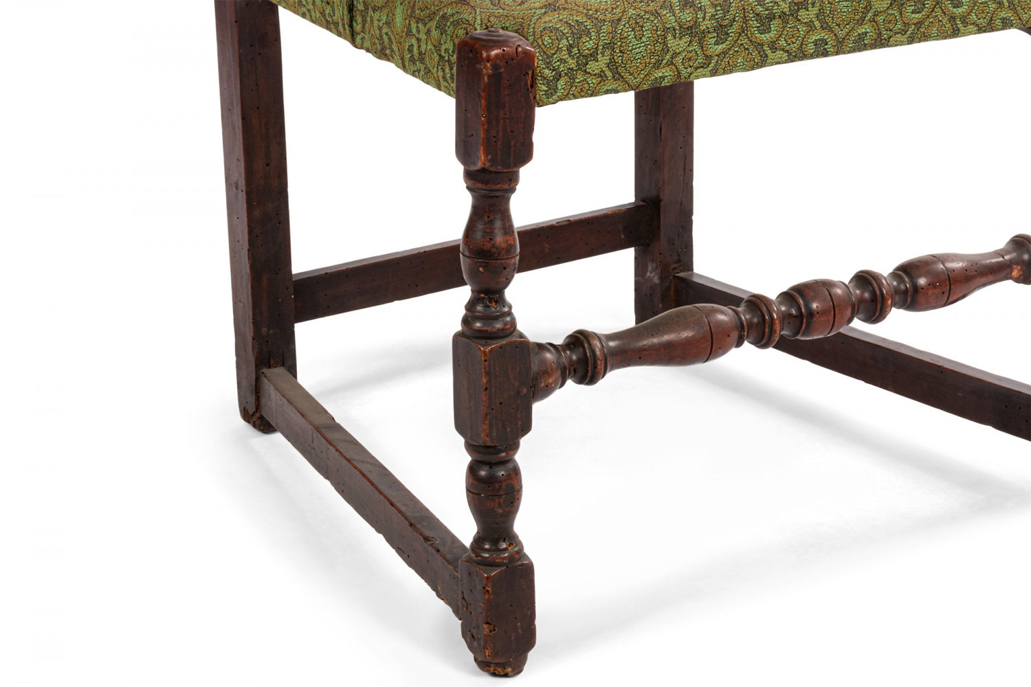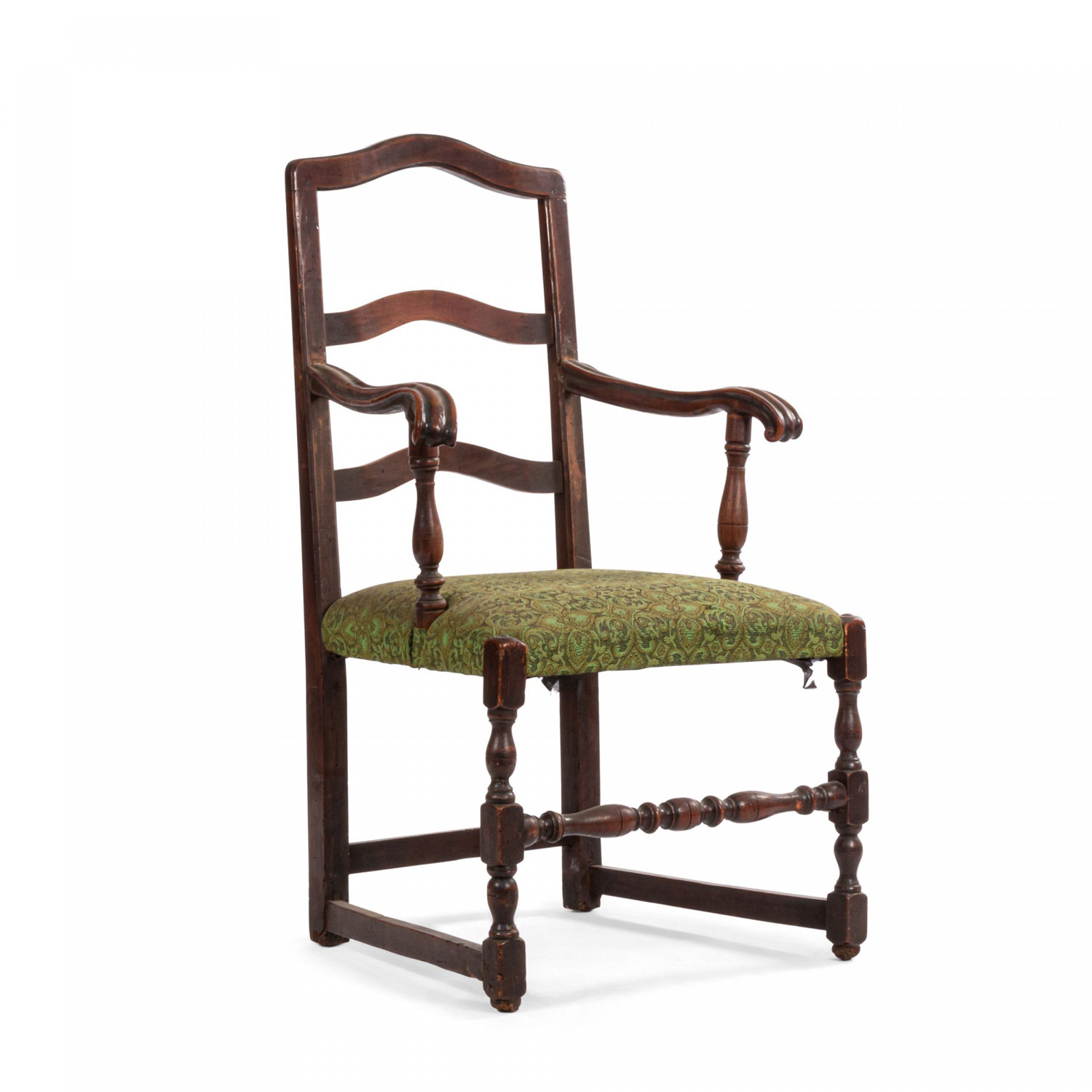 English Provincial Early Georgian (18th Century) walnut and elm ladder back armchair with turned legs joined by a box stretcher and a green upholstered seat..