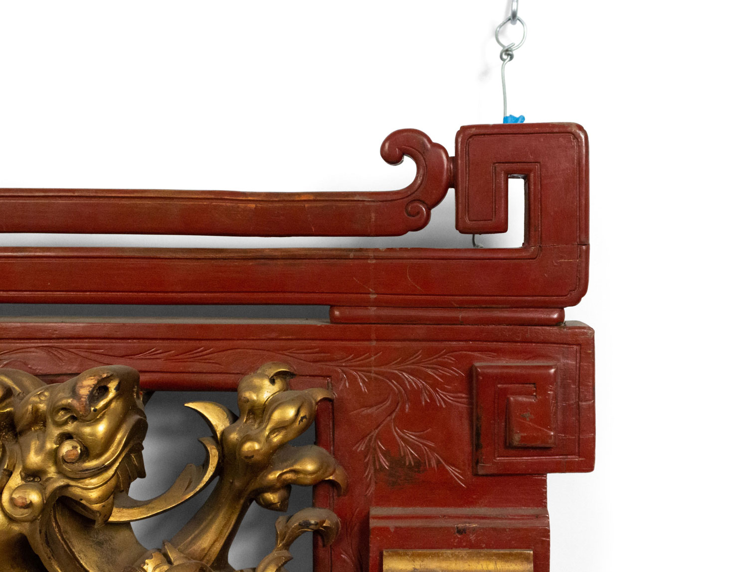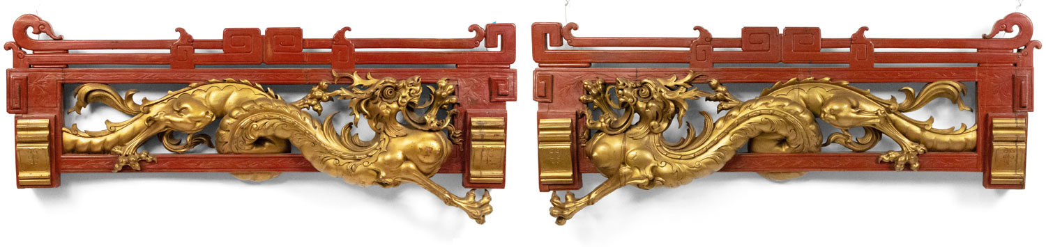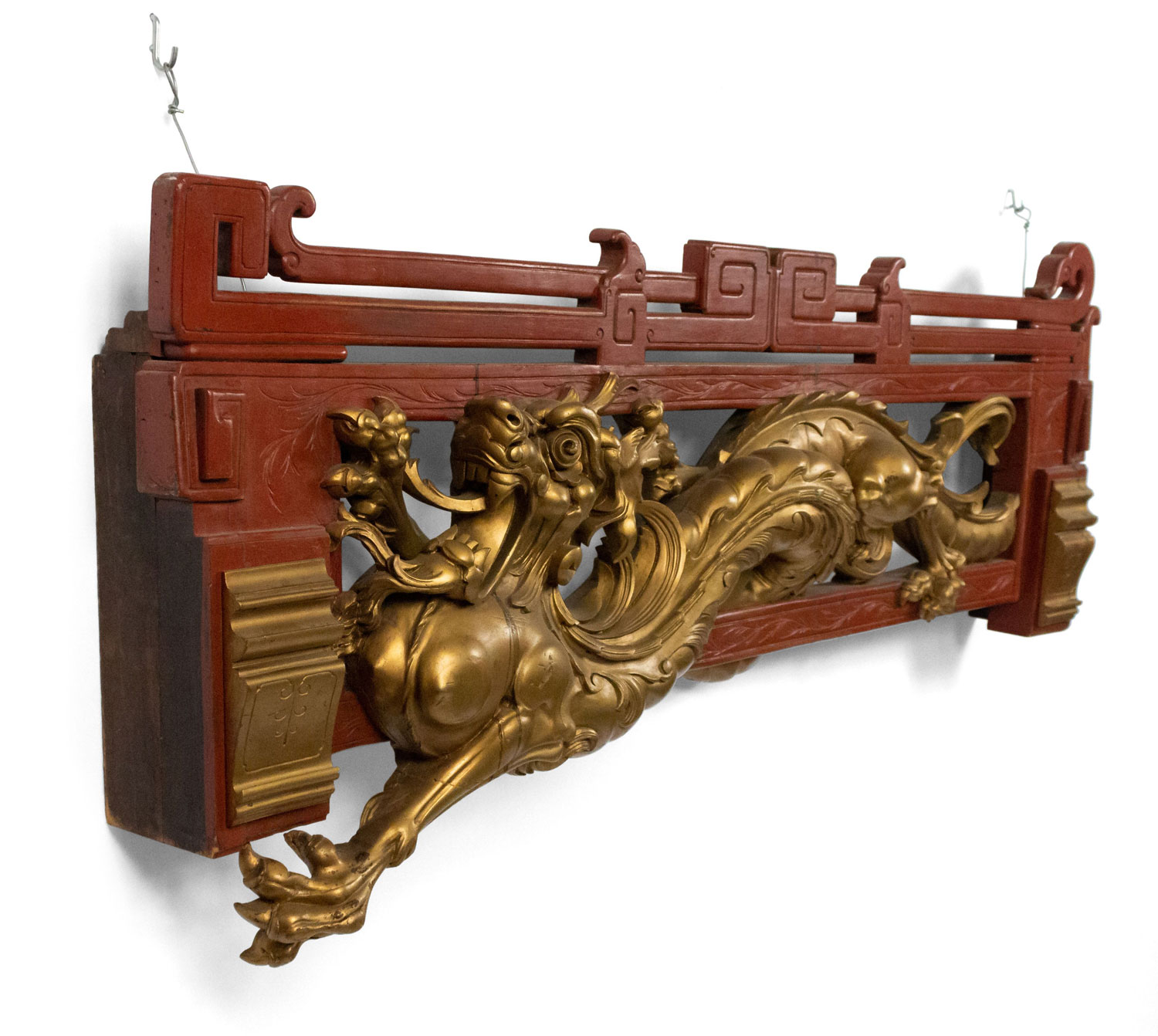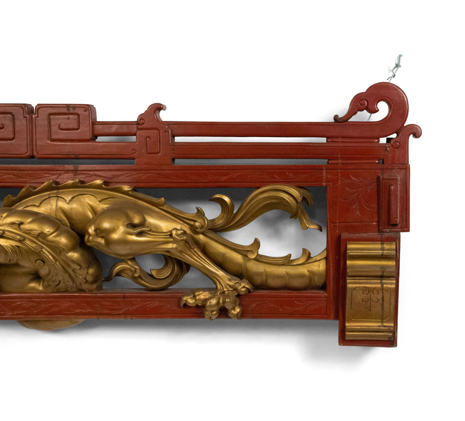 PAIR of English Regency style (19th Century) red and gold painted horizontal dragon wall plaques (PRICED AS PAIR).