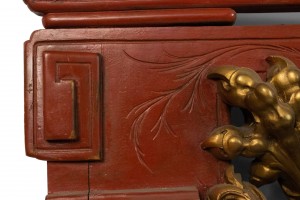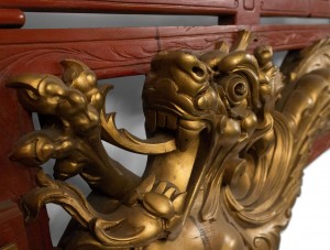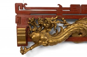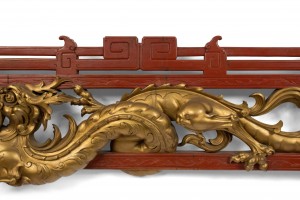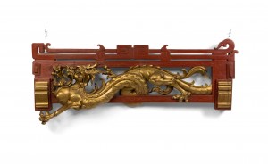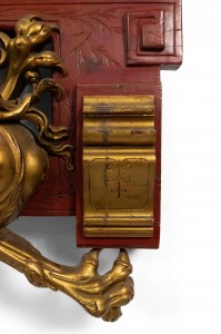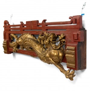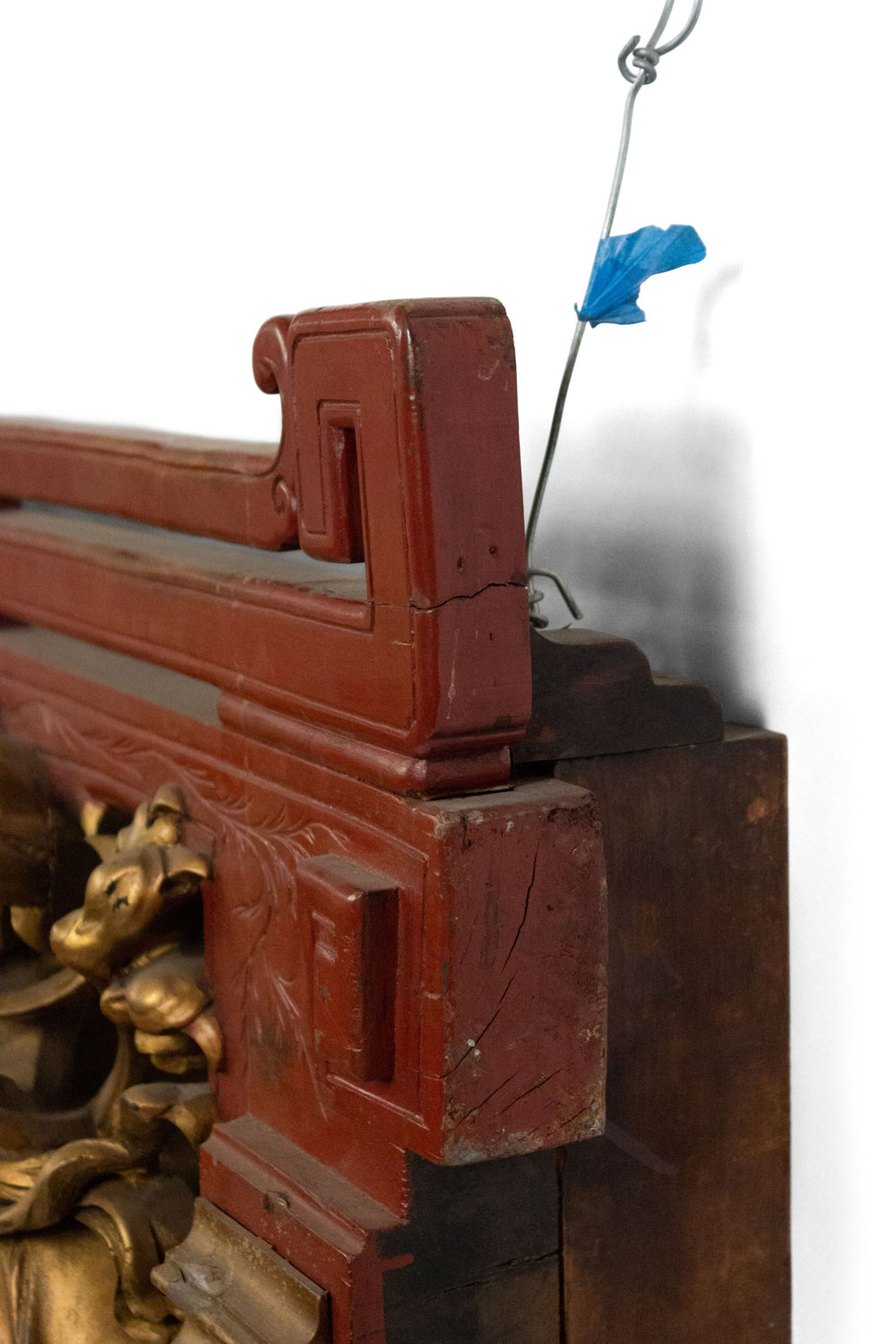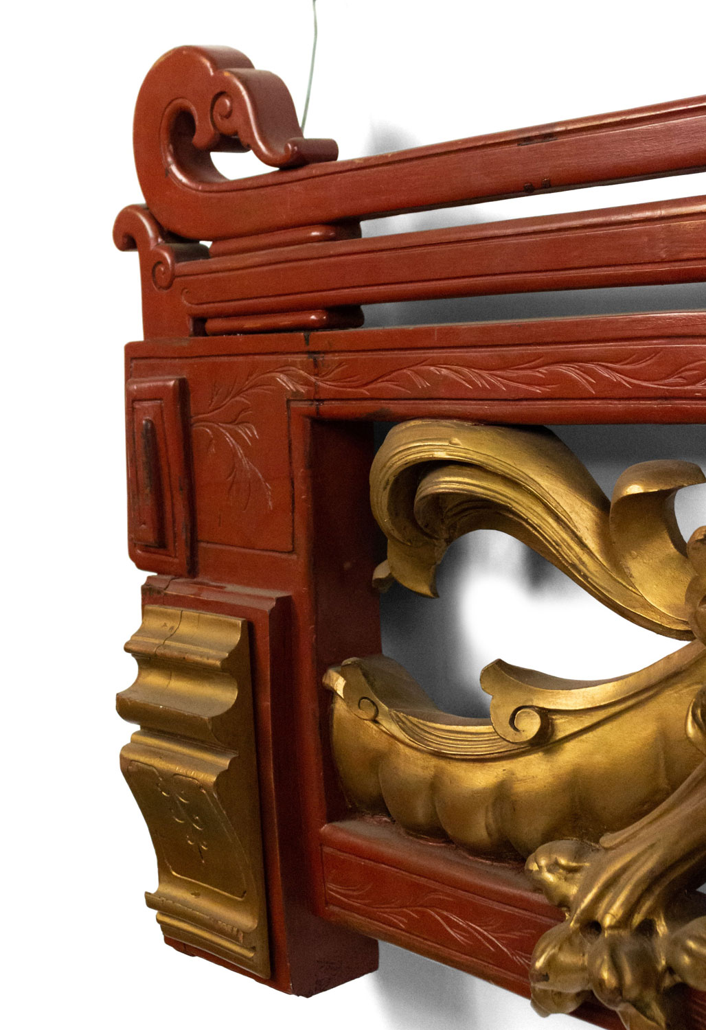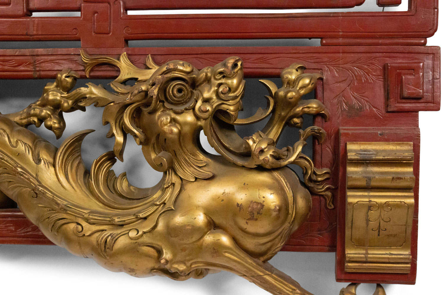 PAIR of English Regency style (19th Century) red and gold painted horizontal dragon wall plaques (PRICED AS PAIR).