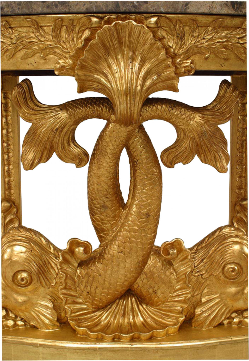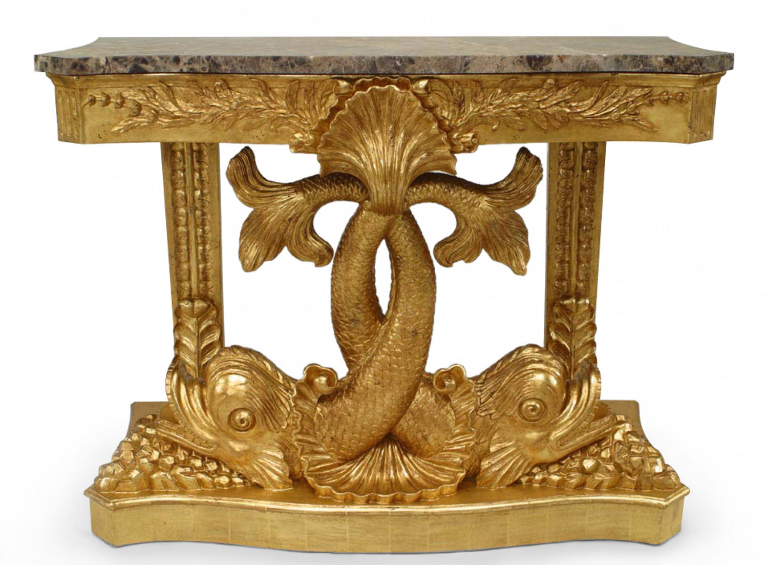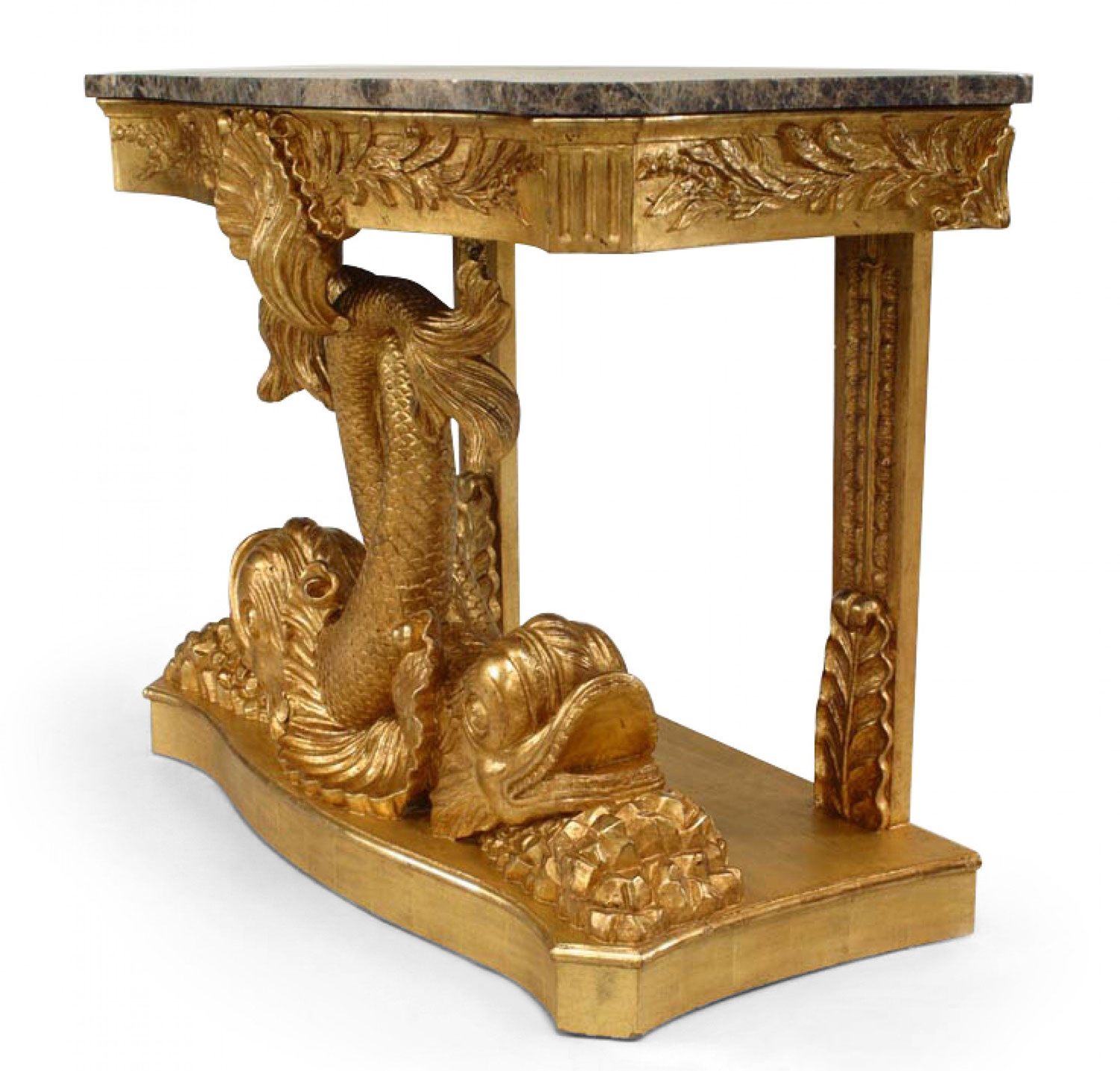 PAIR of English Regency-style (20th Century) gilt console tables with 2 entwined carved dolphins supporting a floral design apron with a mirror back and shaped brown marble top (PRICED AS PAIR)