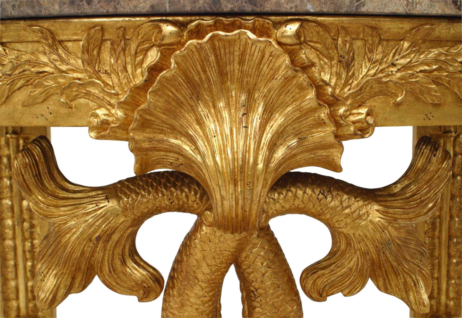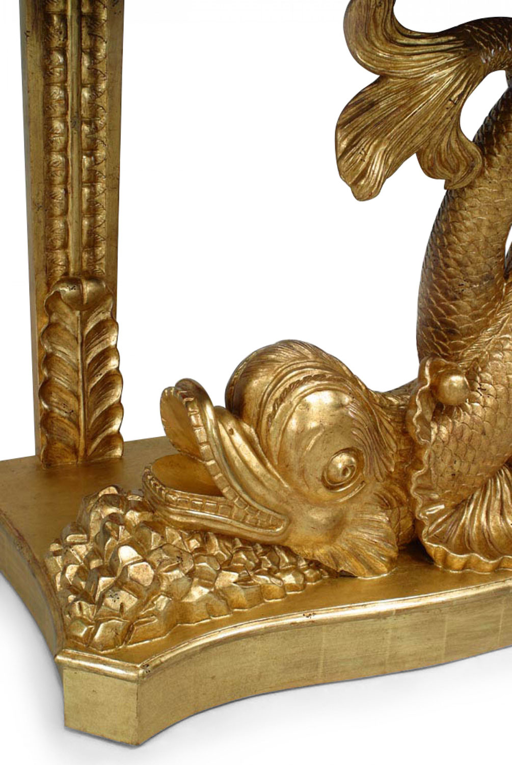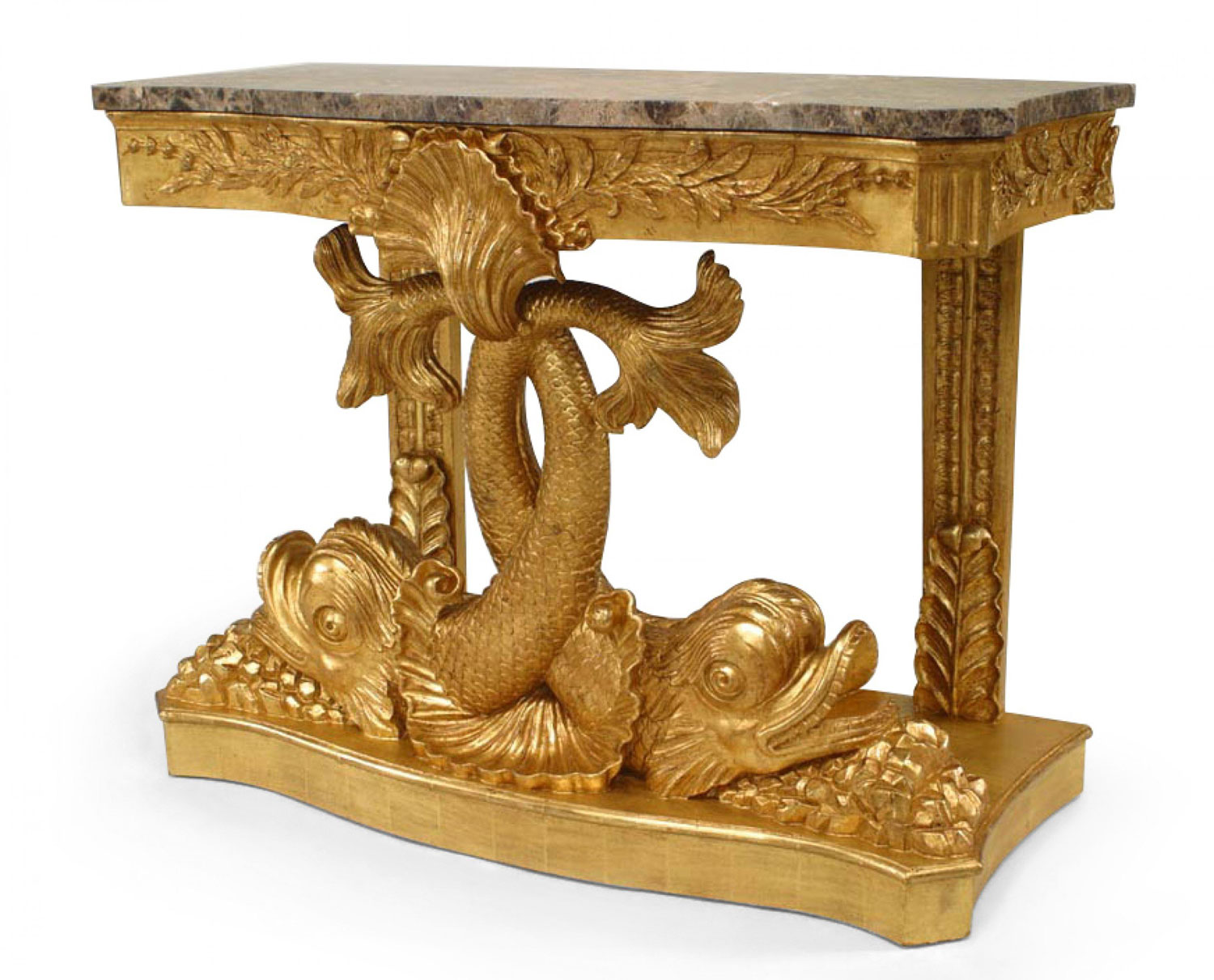 PAIR of English Regency-style (20th Century) gilt console tables with 2 entwined carved dolphins supporting a floral design apron with a mirror back and shaped brown marble top (PRICED AS PAIR).