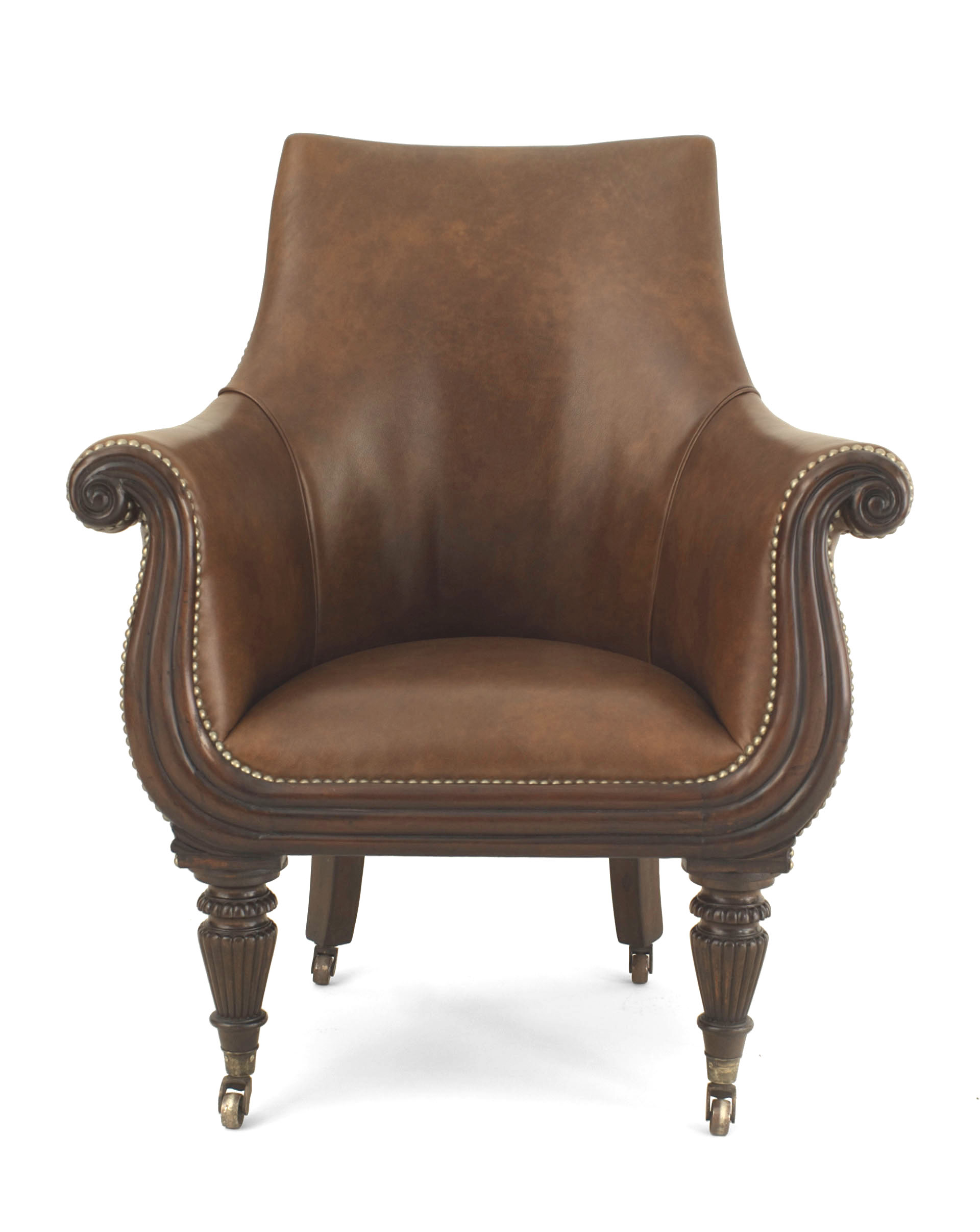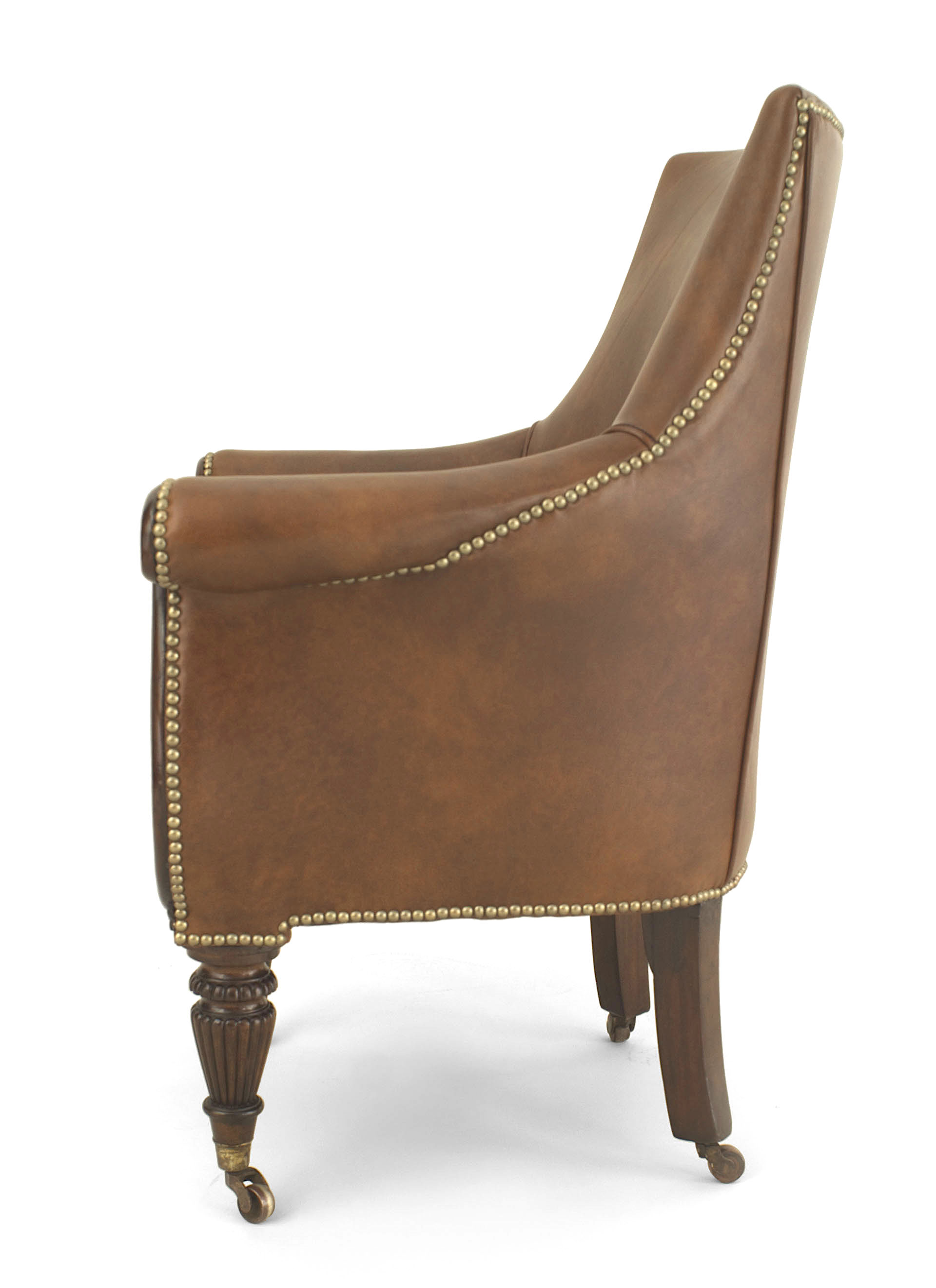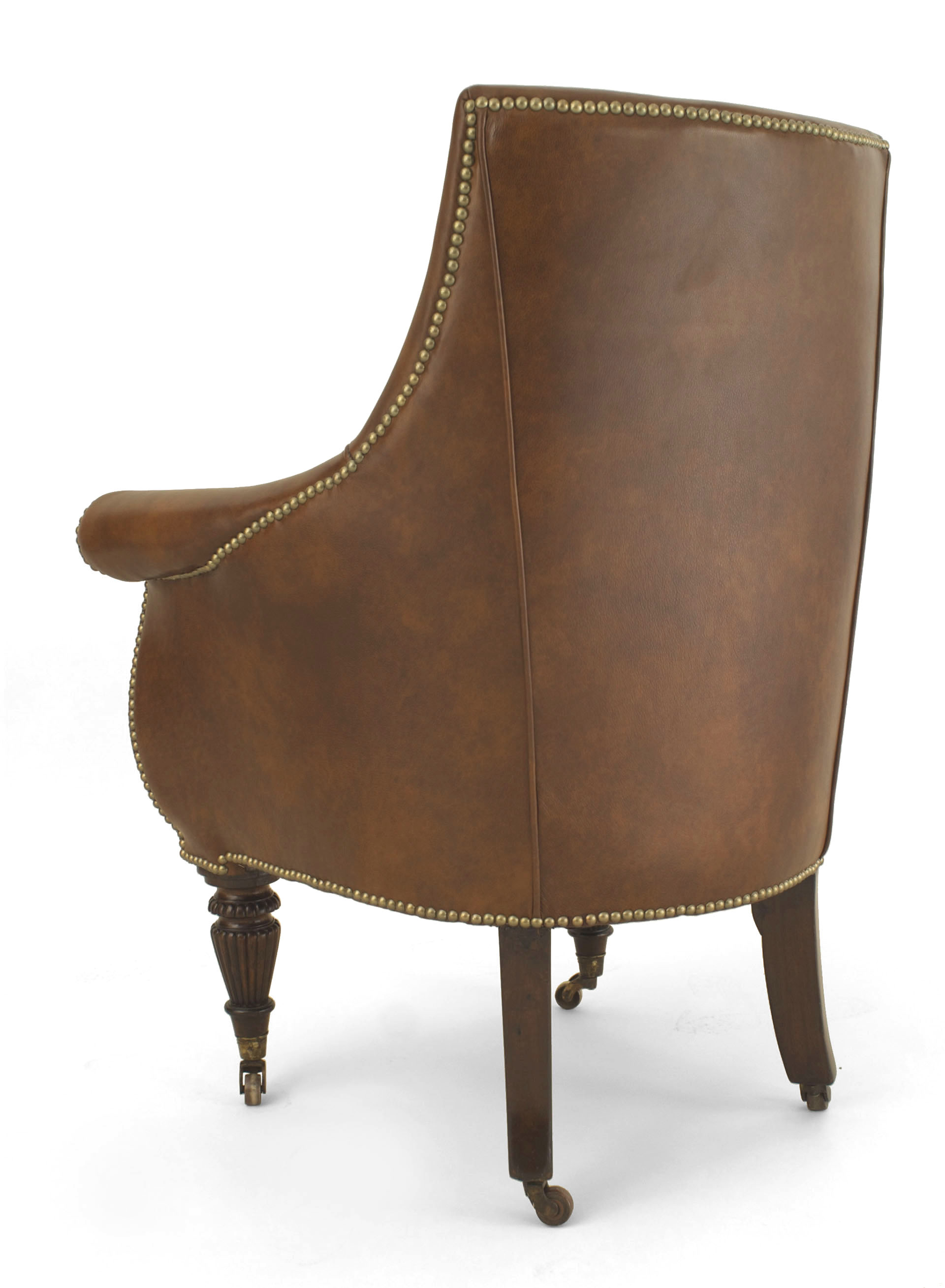 English Regency mahogany tub form library style arm chair with a brown leather upholstered seat and back having brass nail head trim.