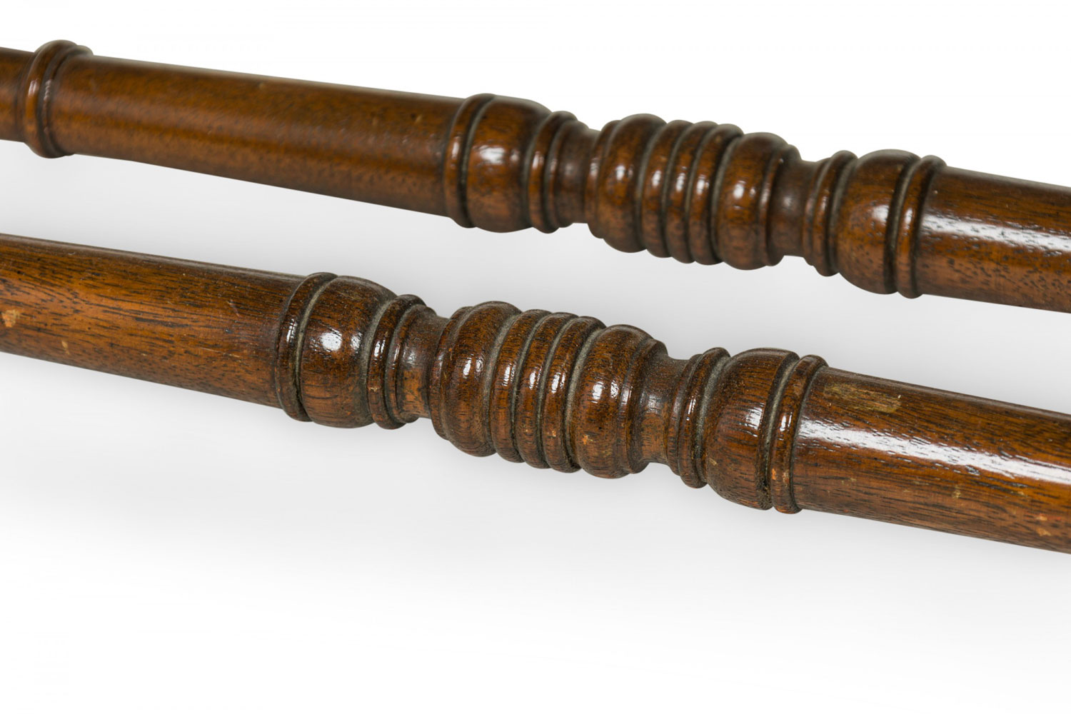 English Regency (19th Century) mahogany sofa / console table with two drawers with brass ring drawer pulls, and a drop leaf on either side, resting on two wide legs joined by a two bar stretcher..