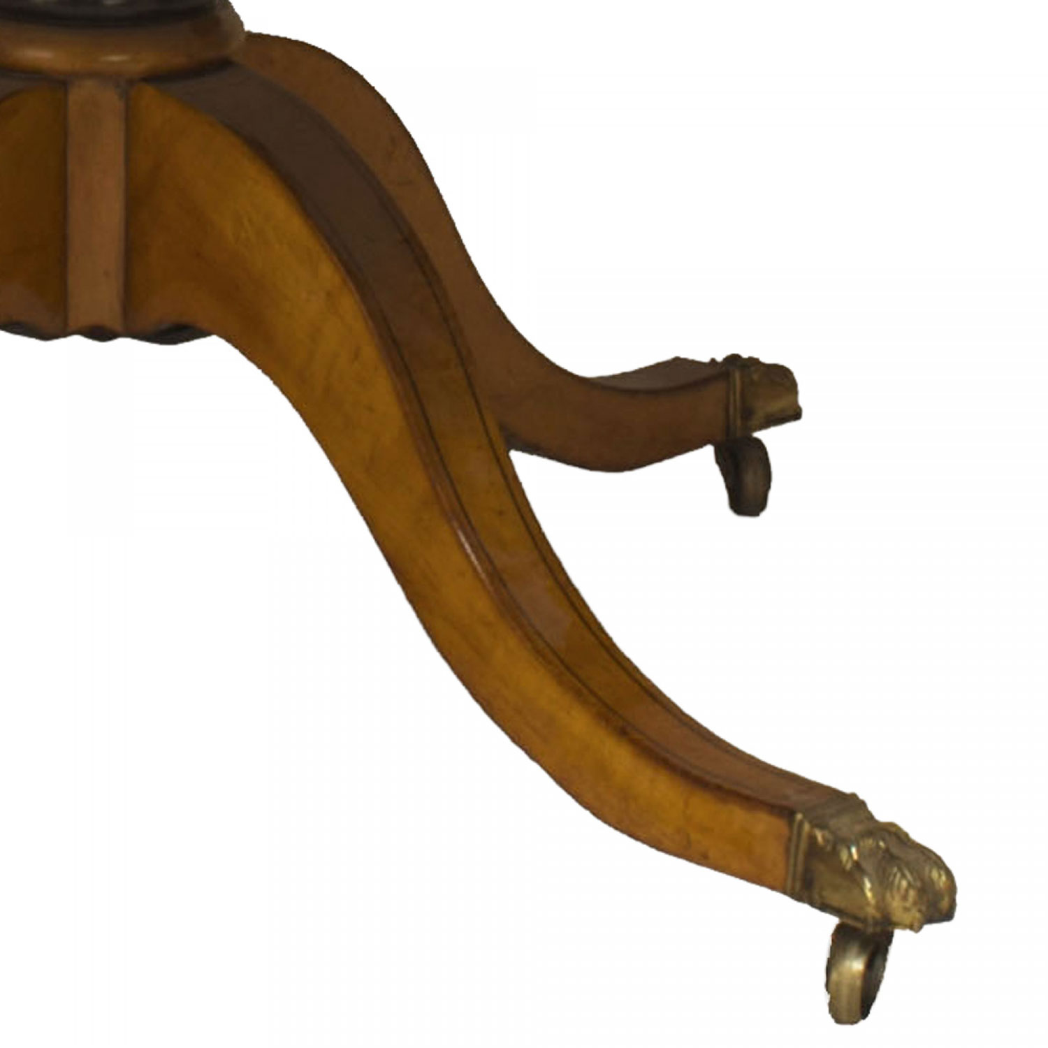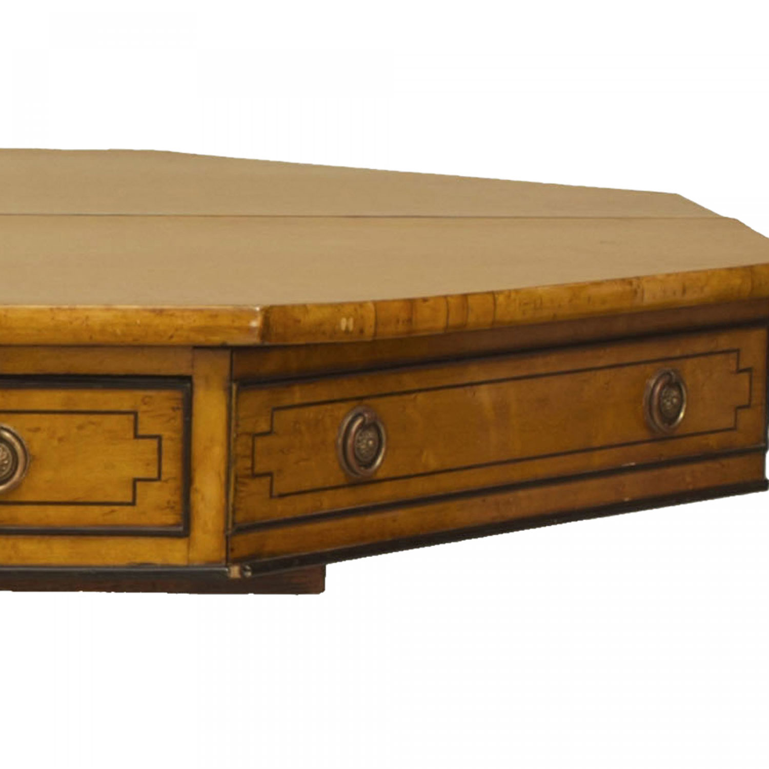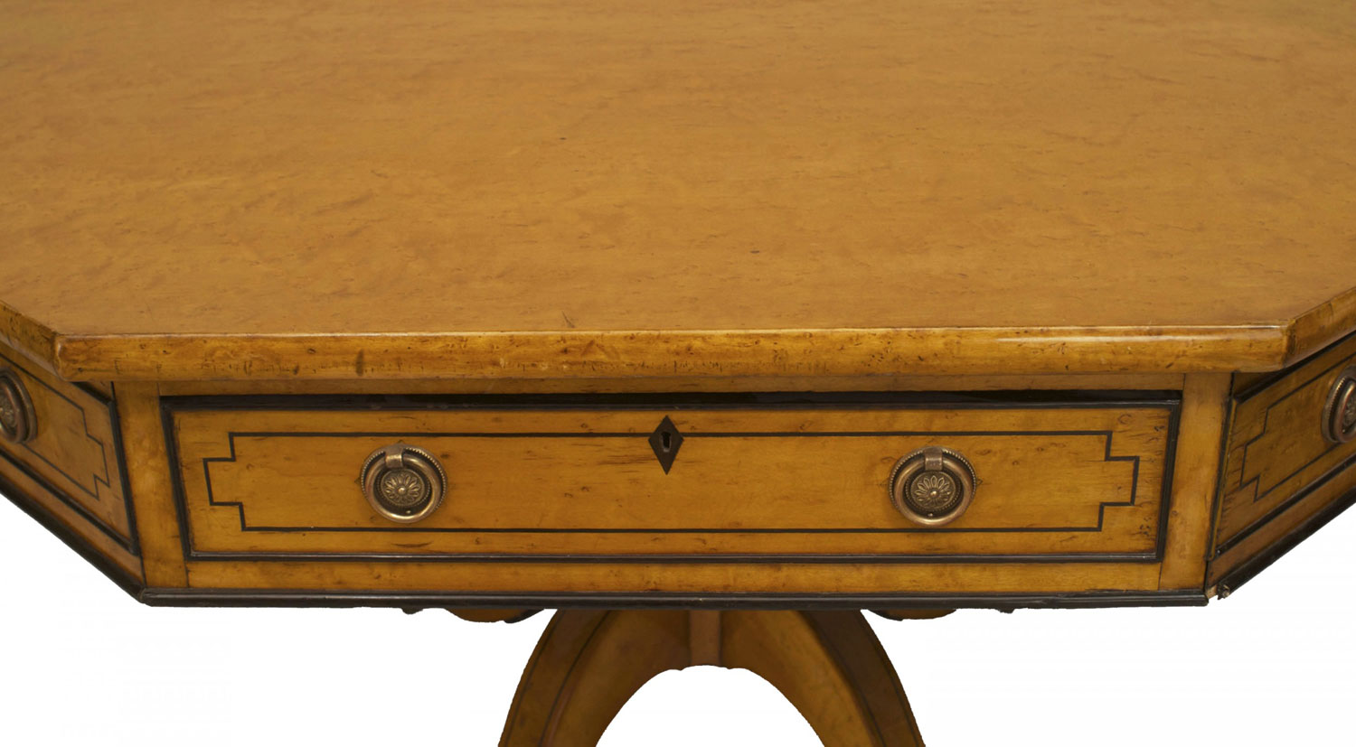 English Regency style (mid-19th Century) octagonal maple pedestal base center table with two drawers and resting on a pedestal base with 4 legs. (stamped: BLAIN & SON / LIVERPOOL)