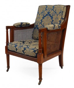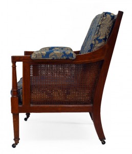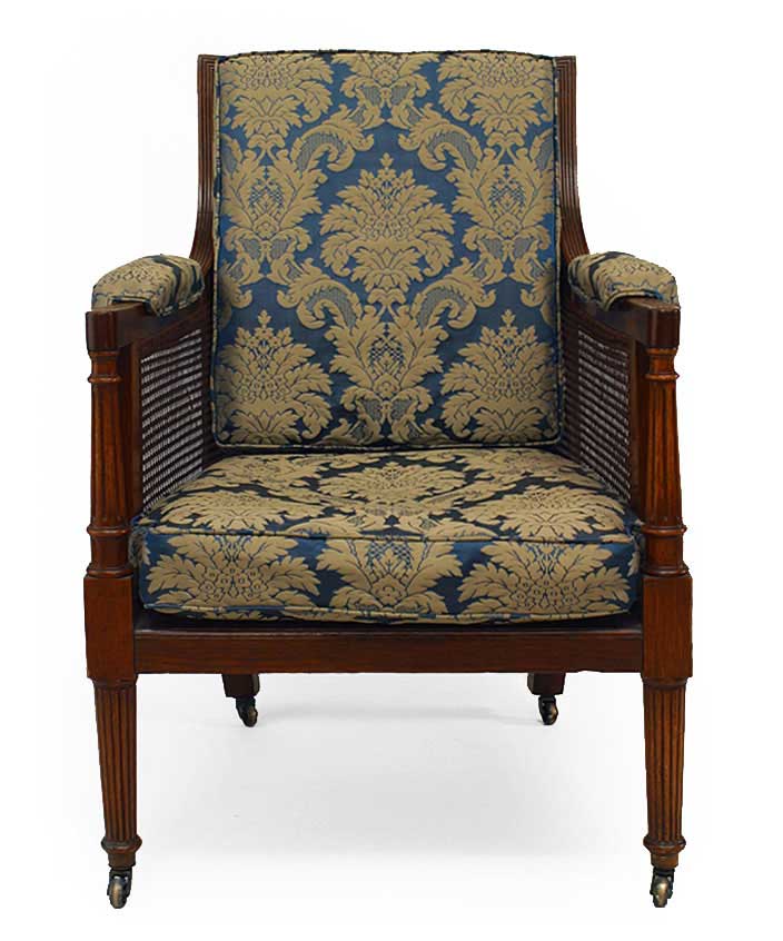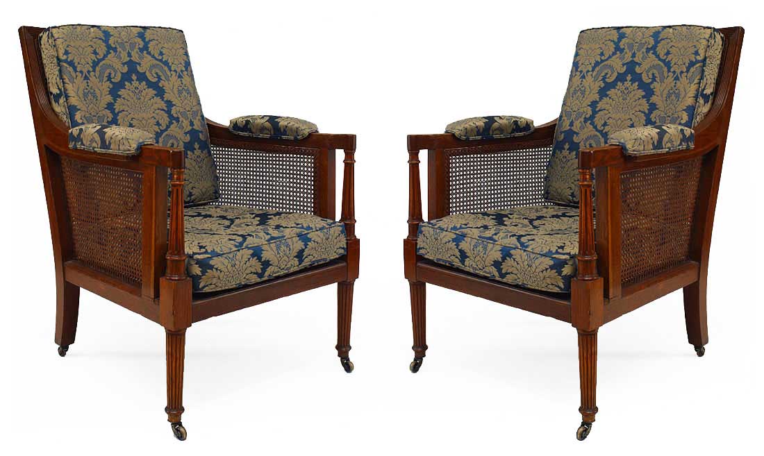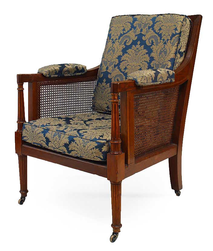 PAIR of English Regency-style (19th Century) oak library armchairs with cane side panels and fluted legs with a blue and gold cushioned seat and back (PRICED AS PAIR)..
