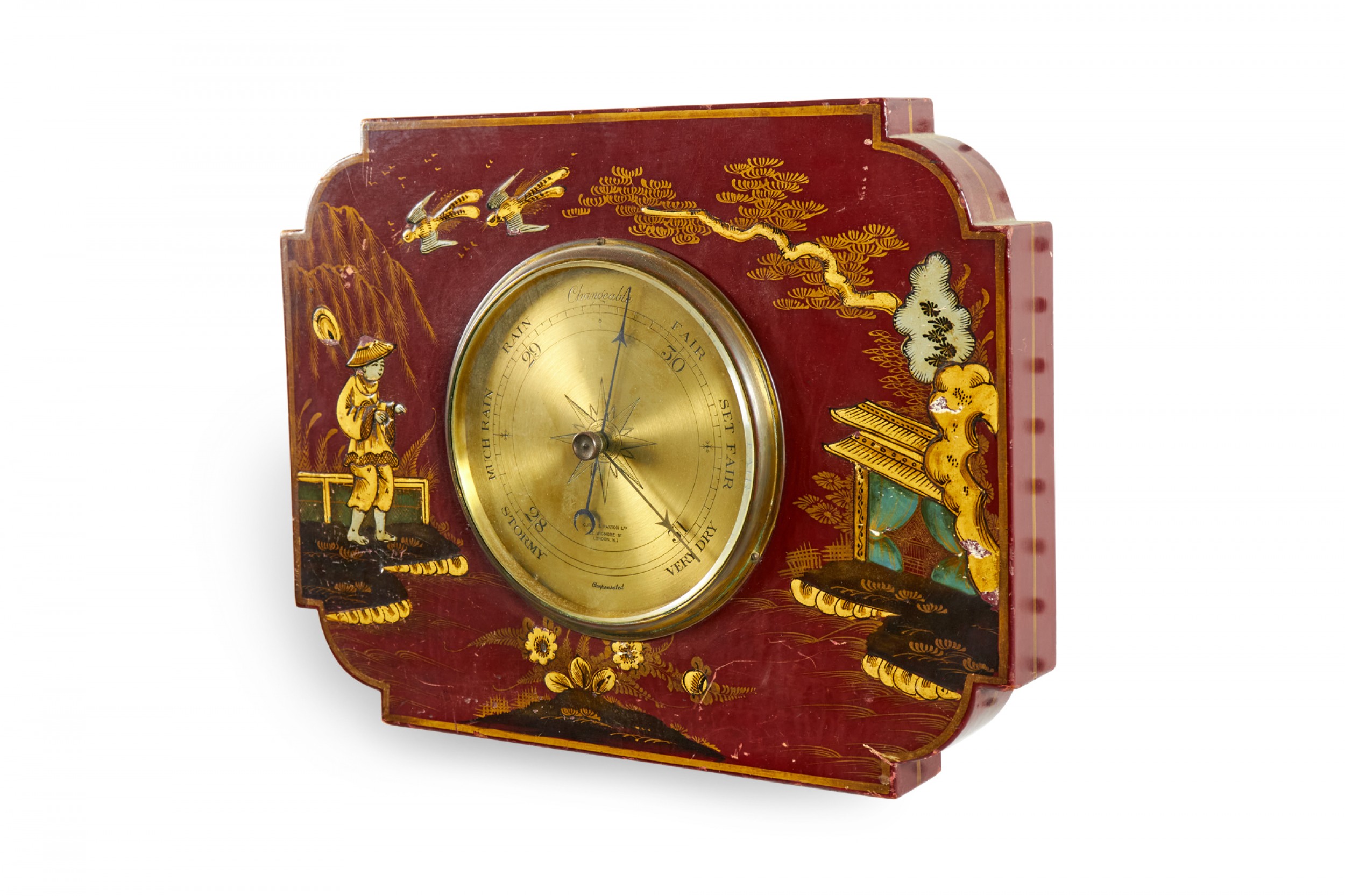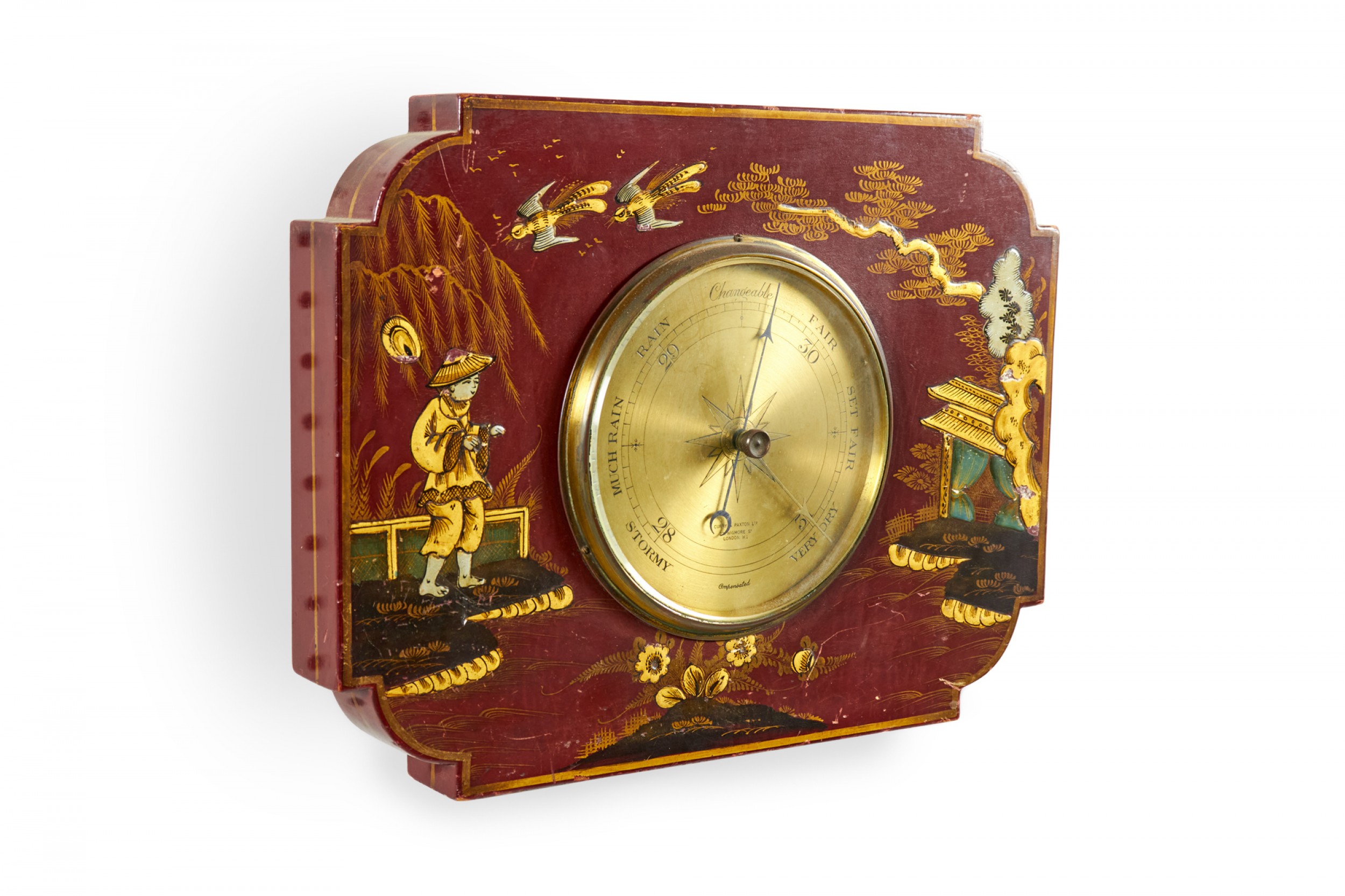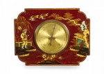 English Regency-style (19/20th Century) red lacquer small chinoiserie wall barometer..