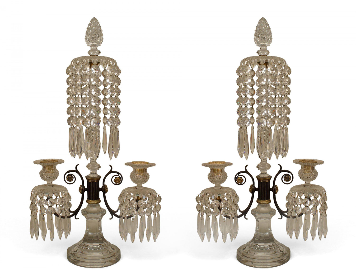 PAIR of English Regency Waterford candelabras with a pine cone finial above a swirl center post and 2 arms emanating from a metal and brass centerpost having crystal drops (PRICED AS PAIR)