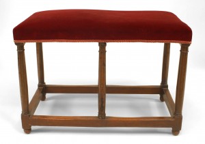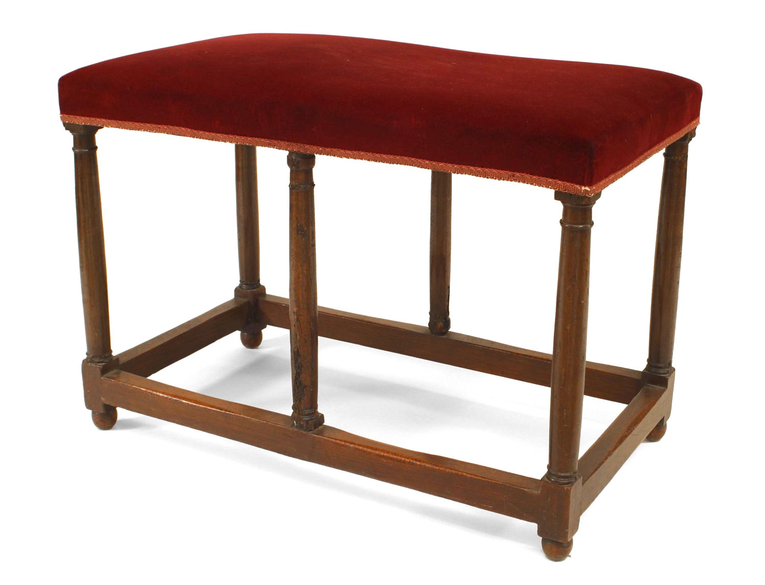 English Renaissance style (19th Century) 6 legged walnut bench with stretcher and red velvet upholstered seat.