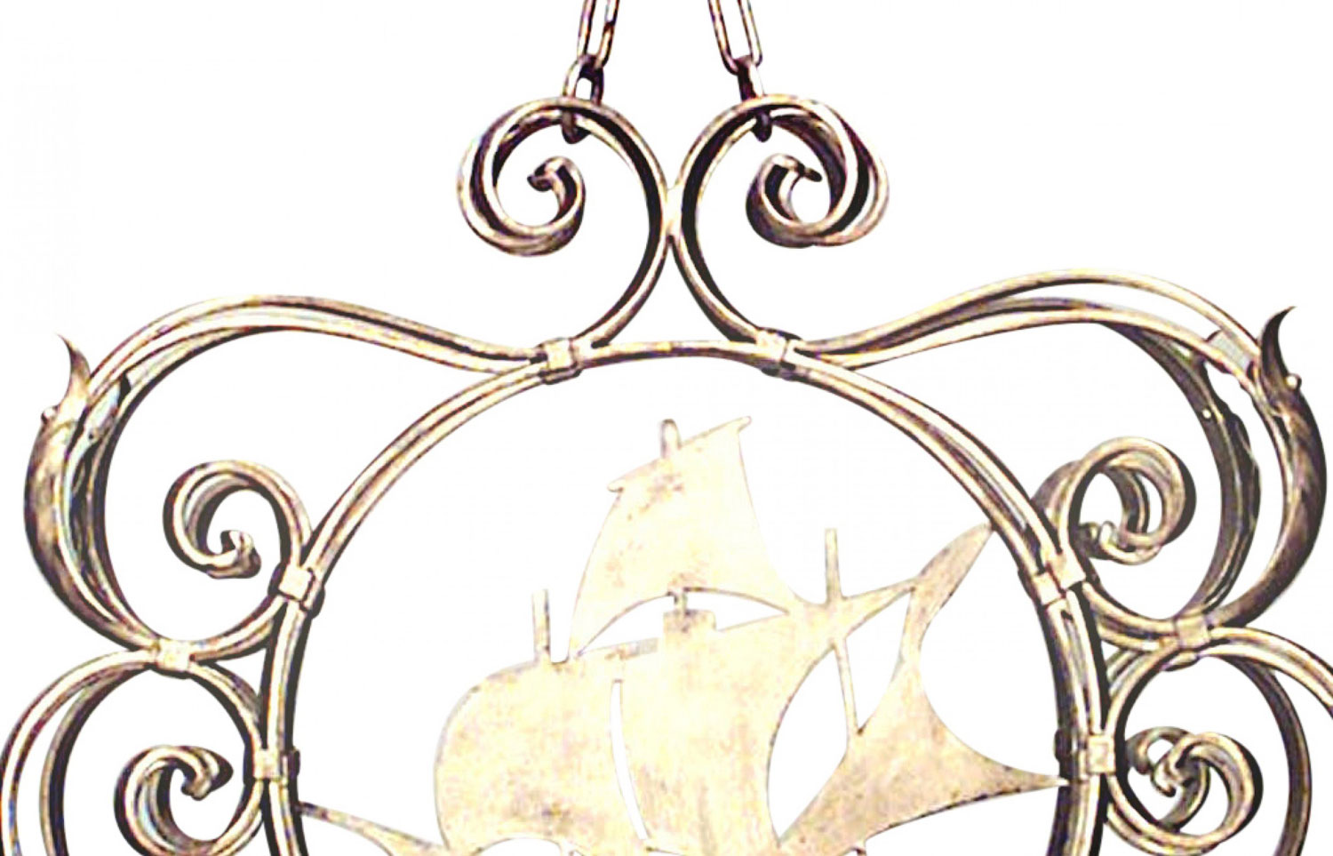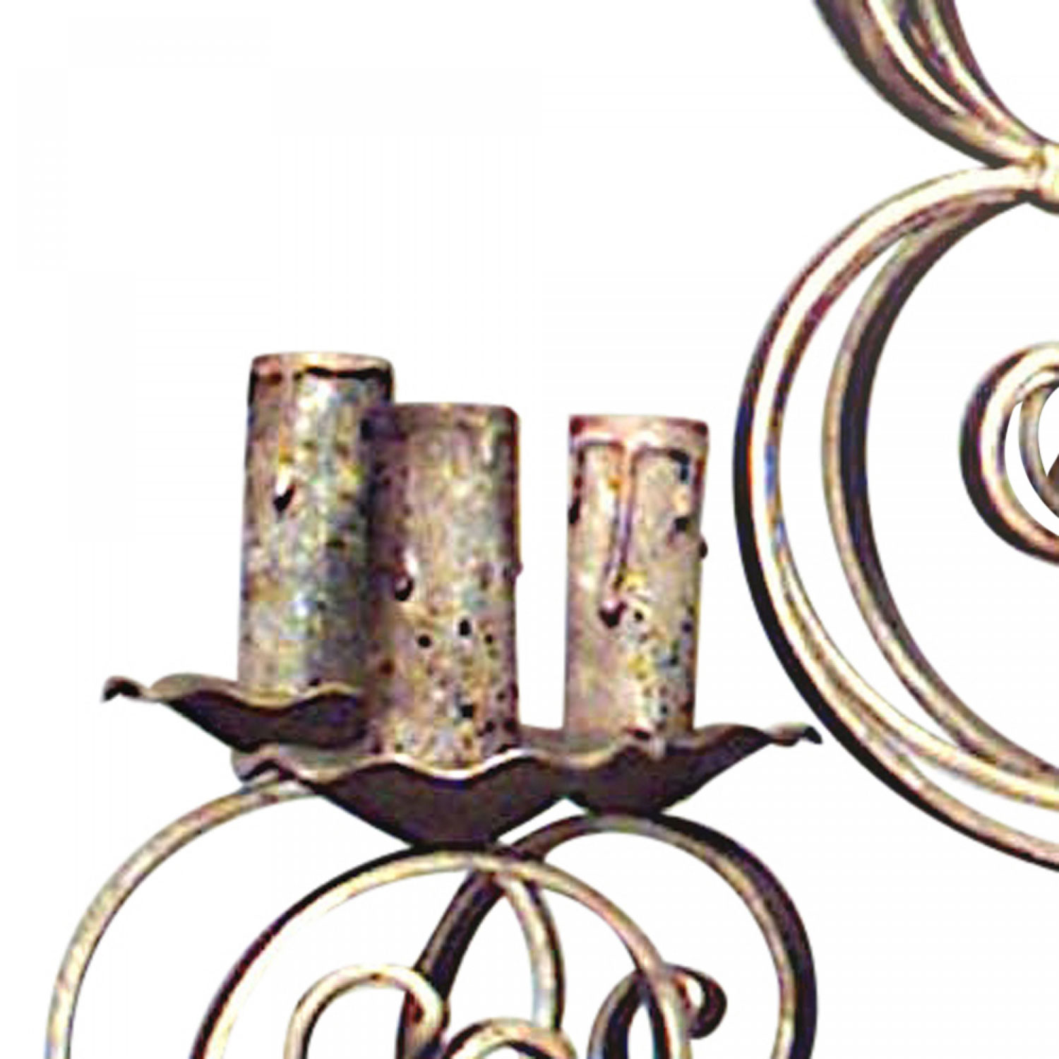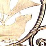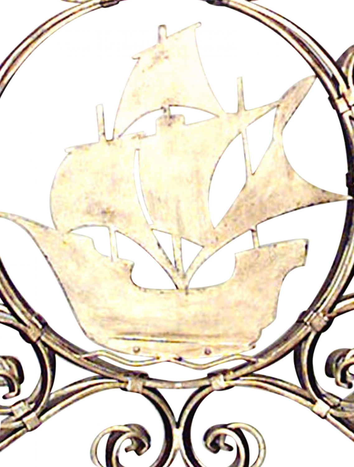 English Renaissance-style gilt iron 6 arm scroll design chandelier with 3 masted ship in center.