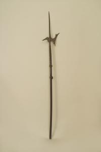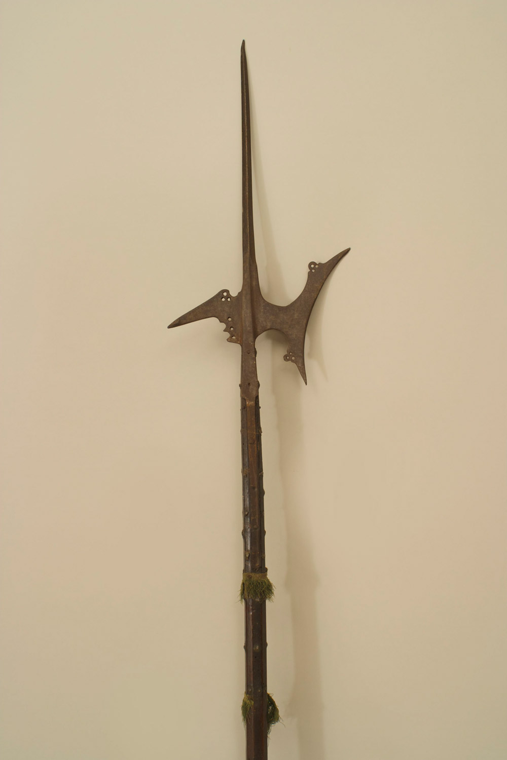 English Renaissance-style halberd spear with simple wooden shaft and 34-inch iron ax top blade with tassels..