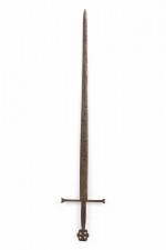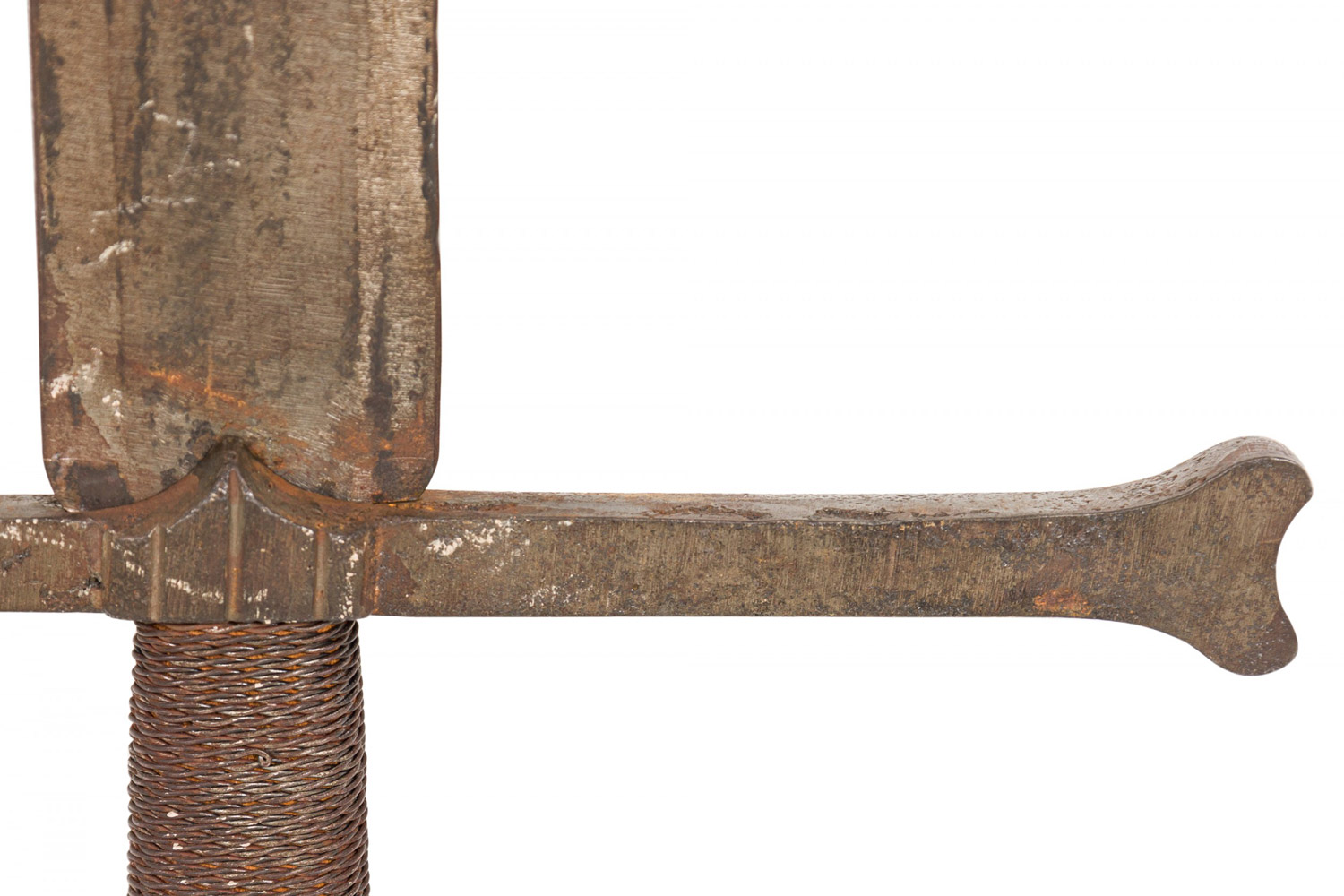English Renaissance-style large iron longsword with cross design and woven handle.