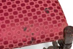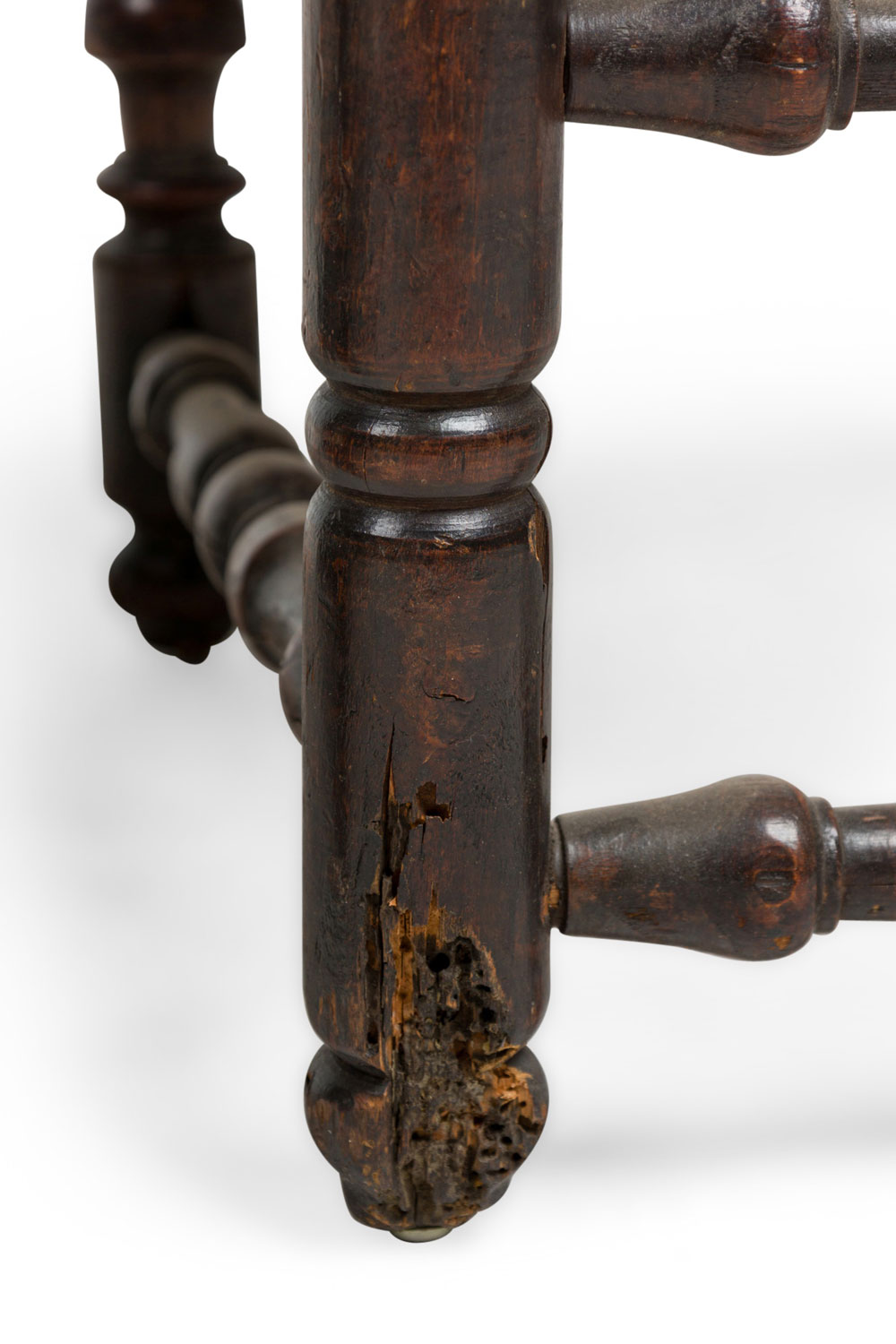 Style: English Materials & Techniques: Walnut Category: Seating Condition: There are stains to the upholstery and a modification to the back leg.