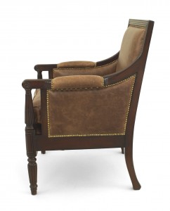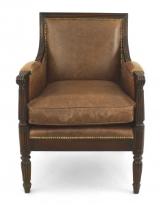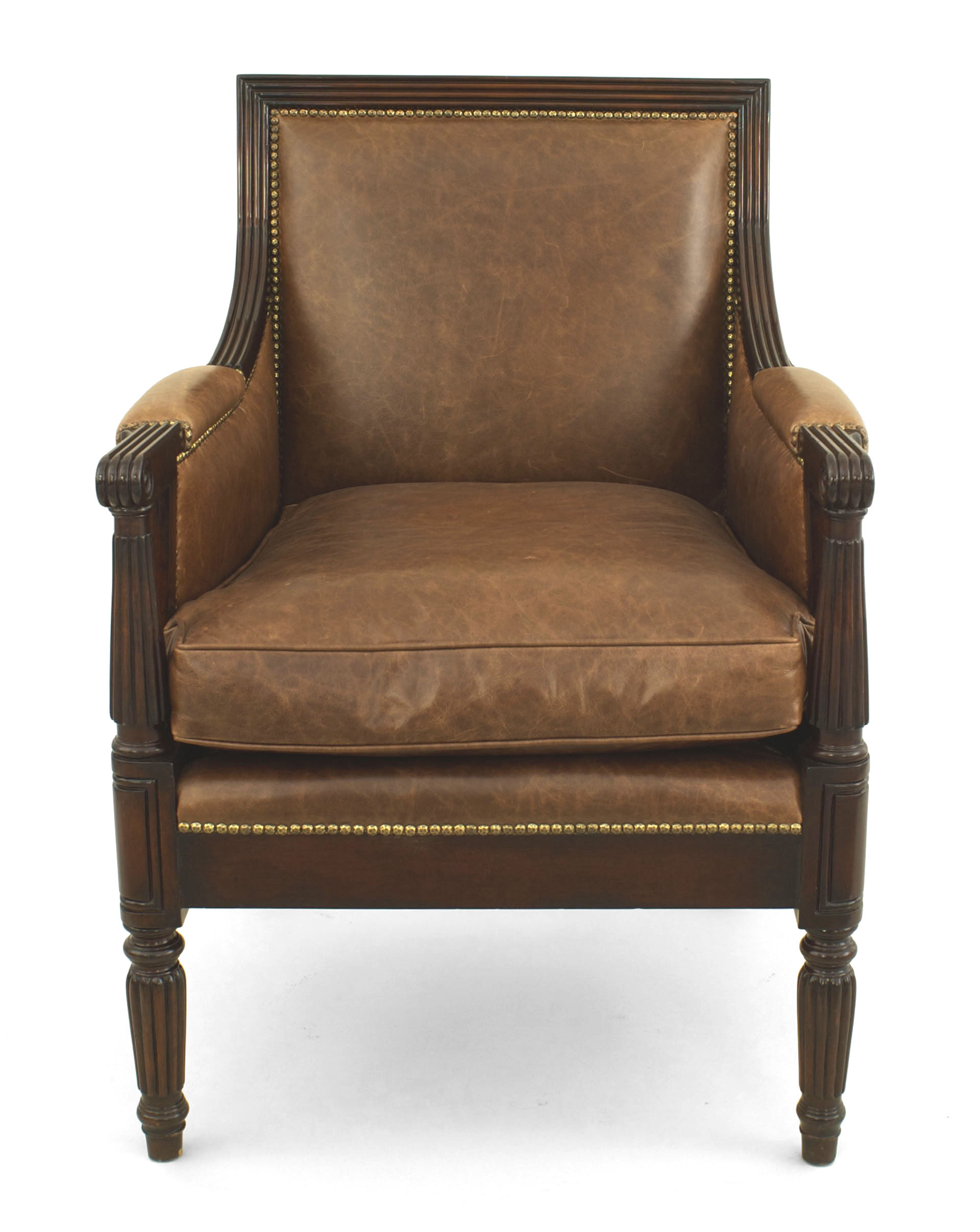 English Sheraton-style modern mahogany library arm chair with fluted carved design and upholstered in brown leather..