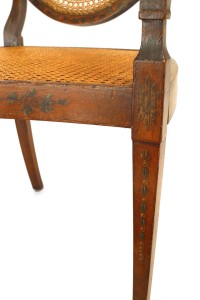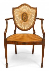 PAIR of English Sheraton style (19th Cent) satinwood shield back Armchairs with painted and cane back panels.