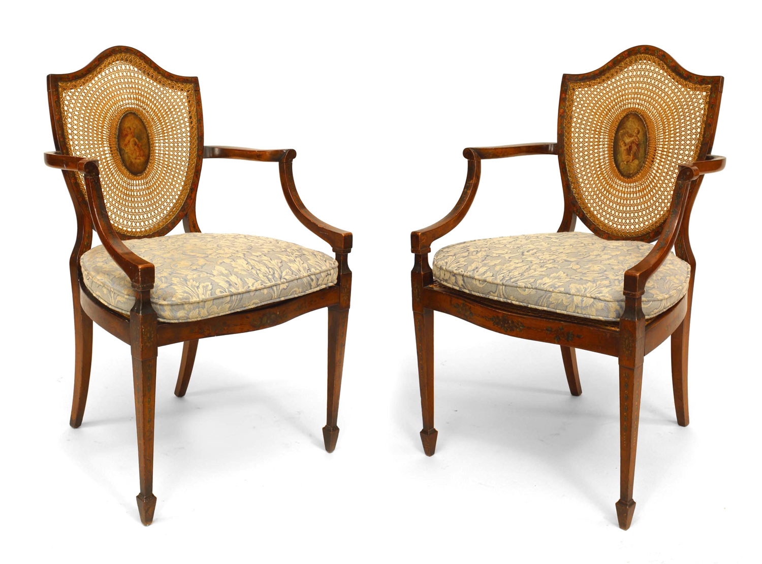 PAIR of English Sheraton style (19th Cent) satinwood shield back Armchairs with painted and cane back panels..