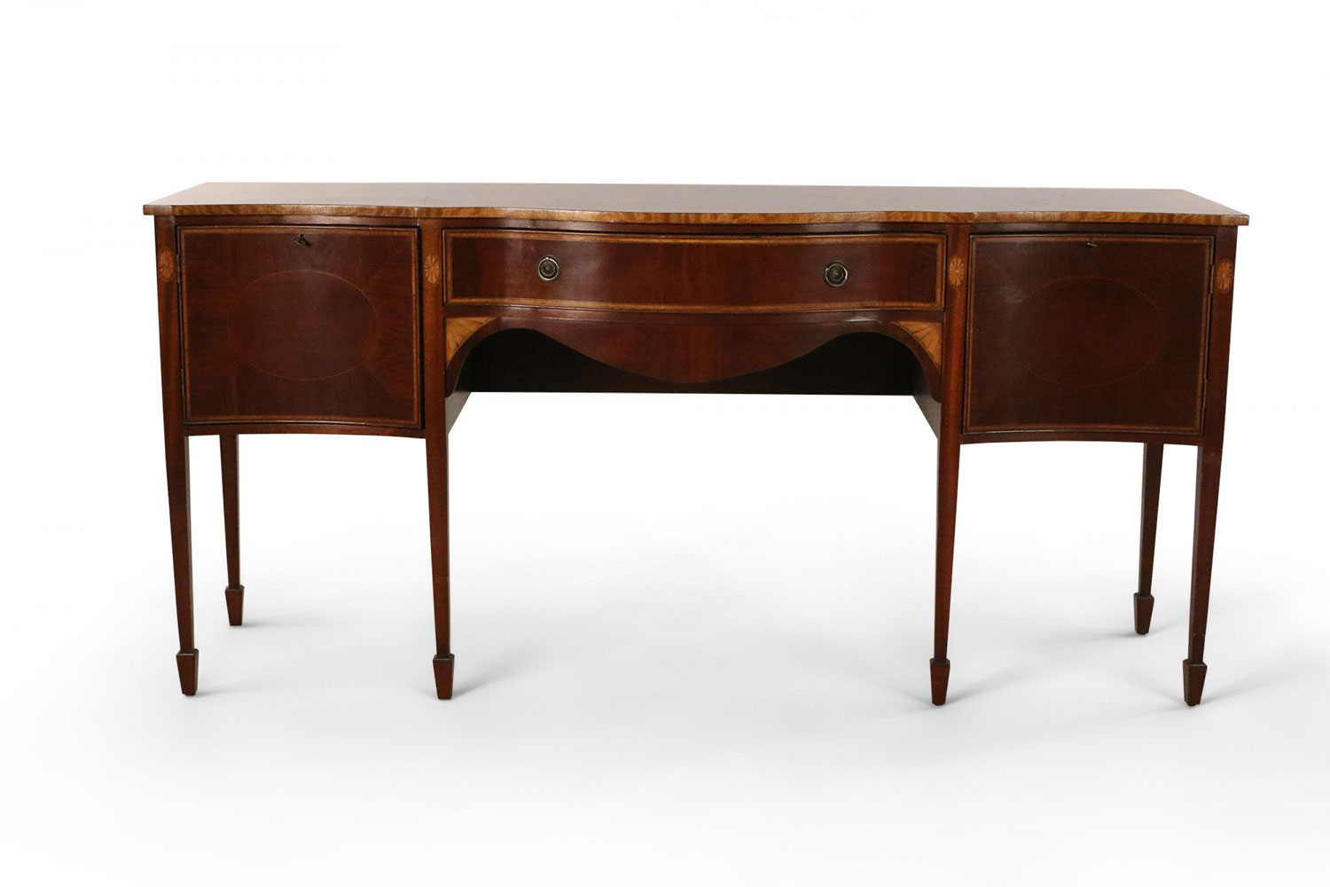 English Sheraton-style (20th Century) mahogany sideboard with a central drawer and two locking side cabinets with decorative medallion inlays and six legs ending in spade feet..