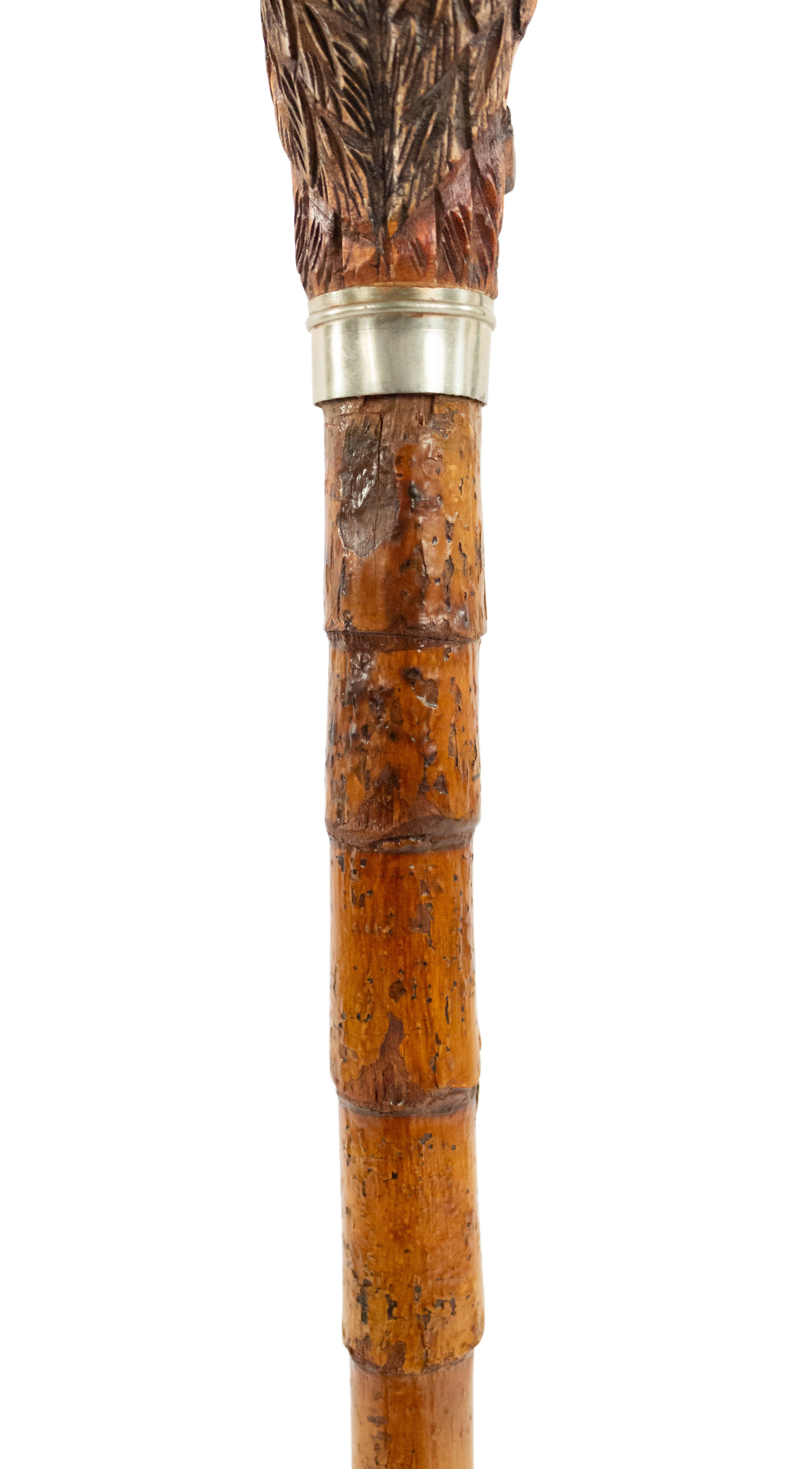 English Victorian bamboo cane having a handle carved as stylized owl with a silver collar and brass tip..