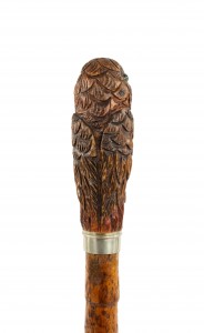 English Victorian bamboo cane having a handle carved as stylized owl with a silver collar and brass tip.