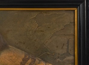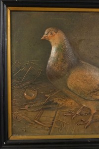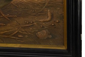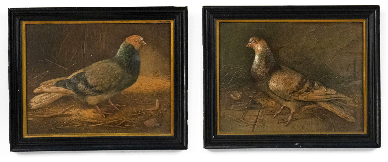 PAIR of English Victorian ebonized framed spoon work and decorated bird pictures