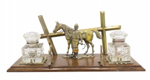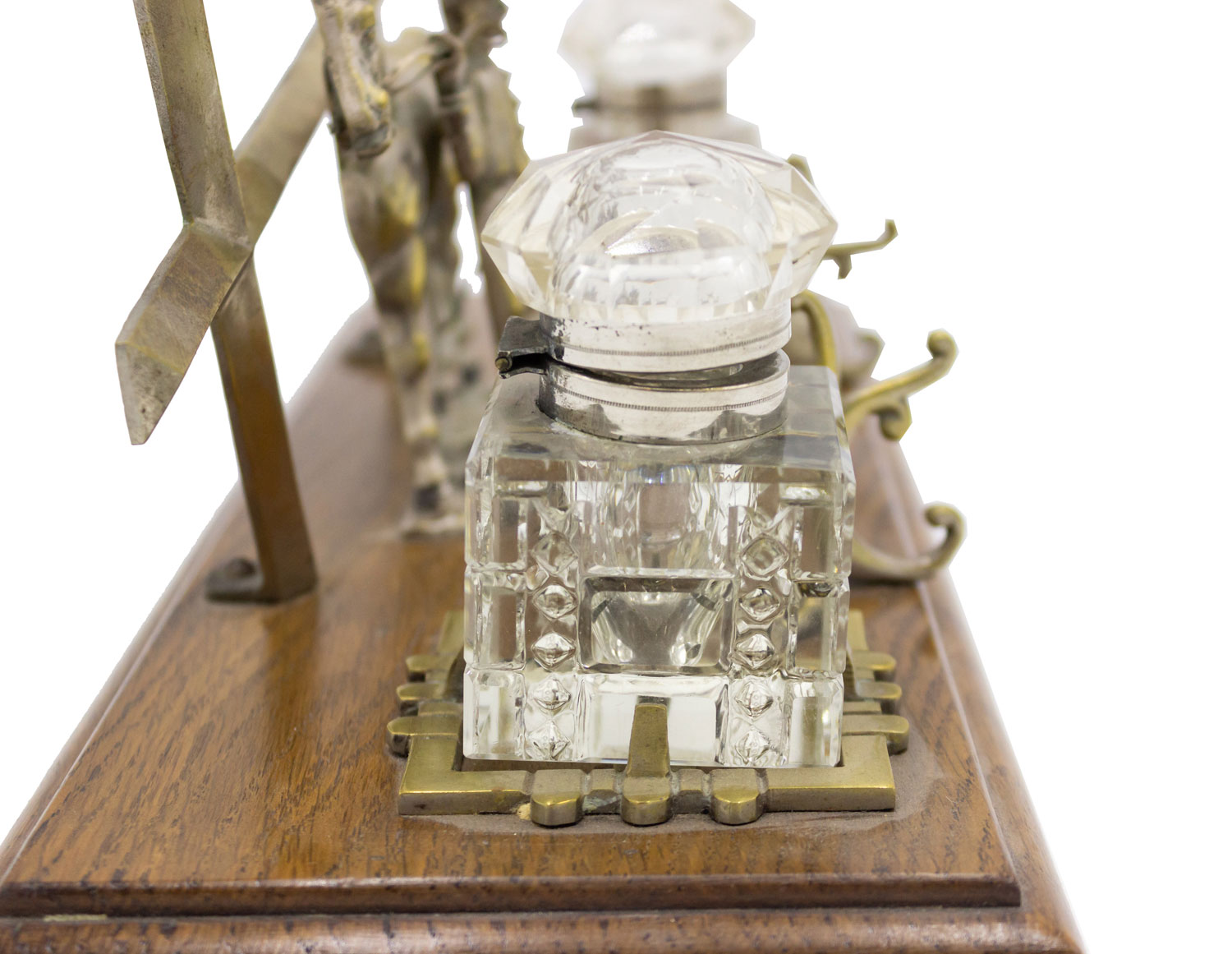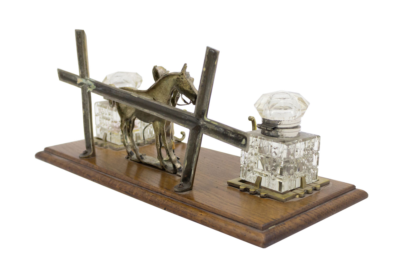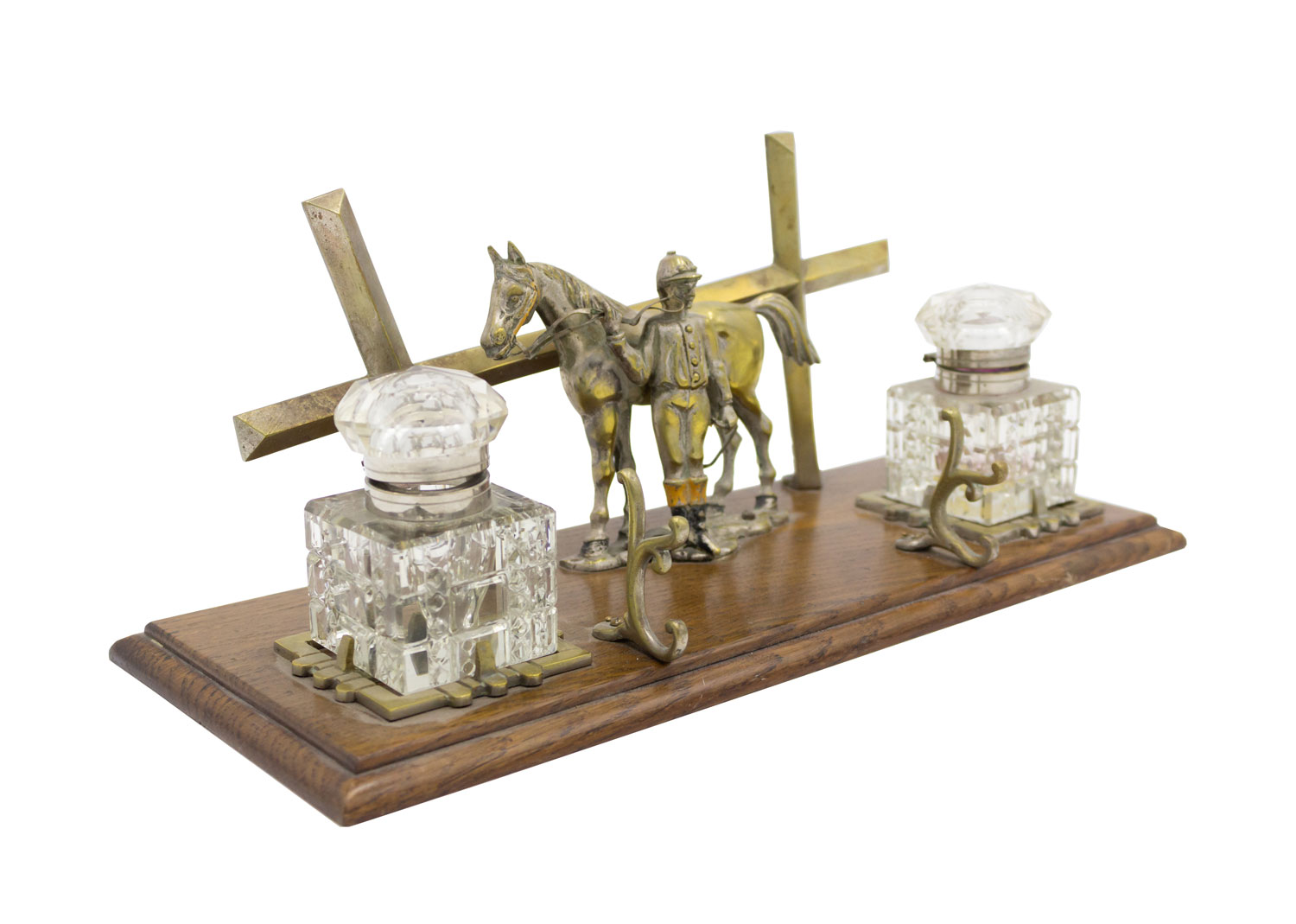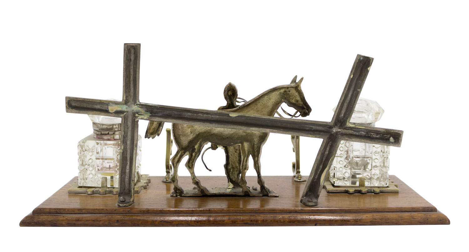 English Victorian bronze double inkwell on oak base with jockey and horse motif and crystal wells..