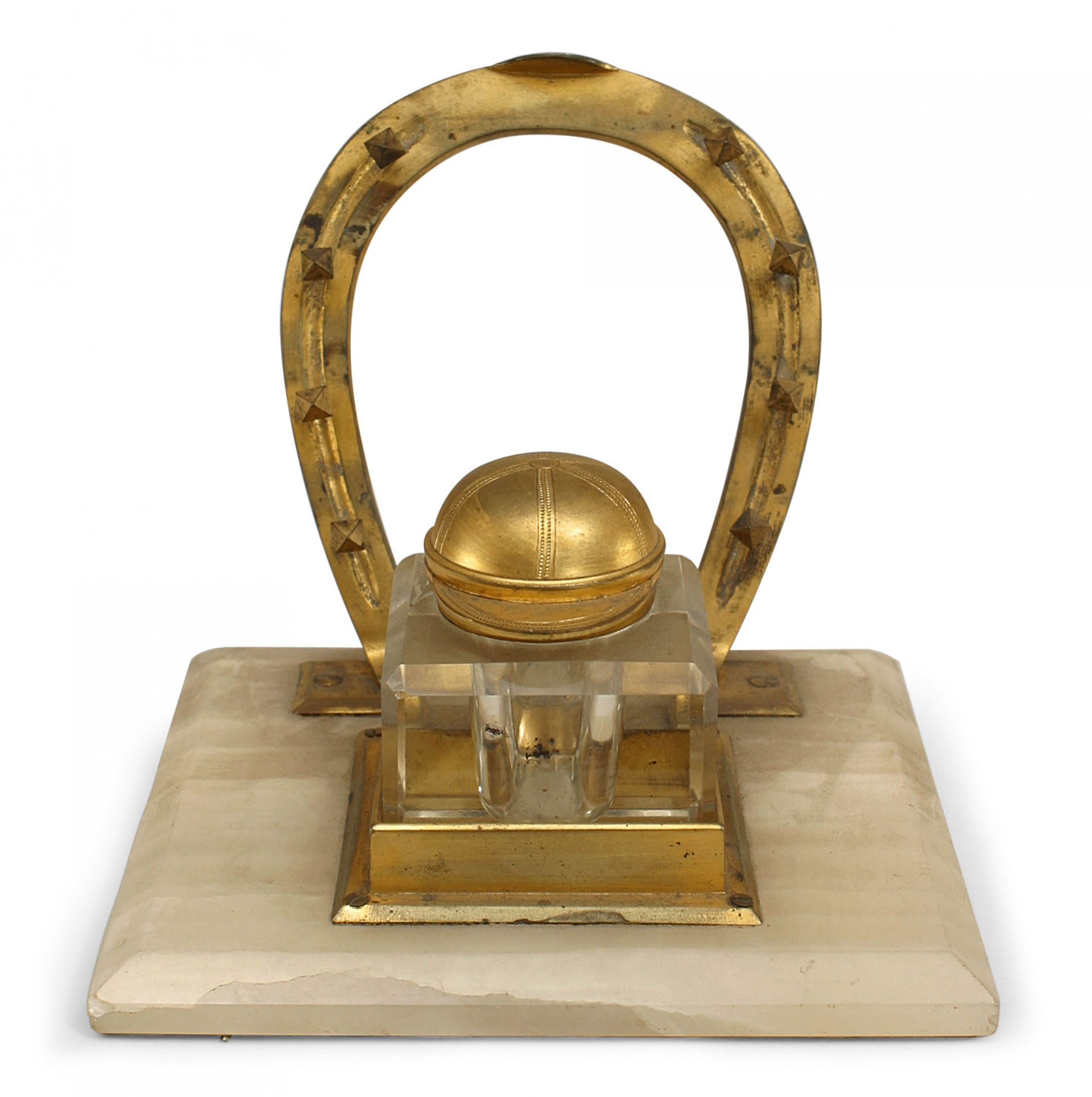English Victorian bronze inkwell with crystal horseshoe cap and square white onyx base..