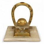 English Victorian bronze inkwell with crystal horseshoe cap and square white onyx base.