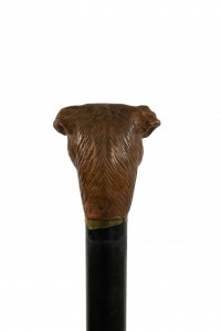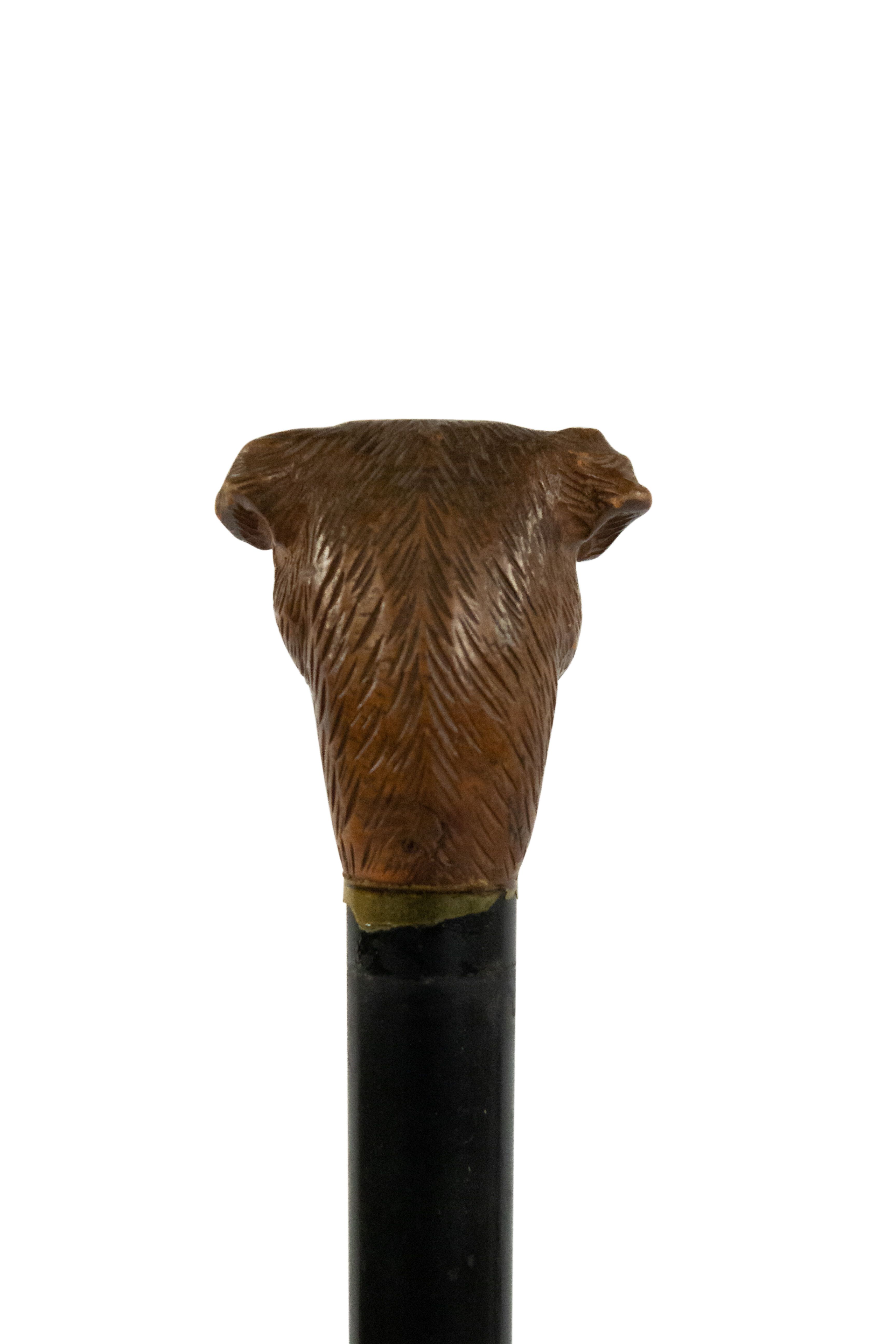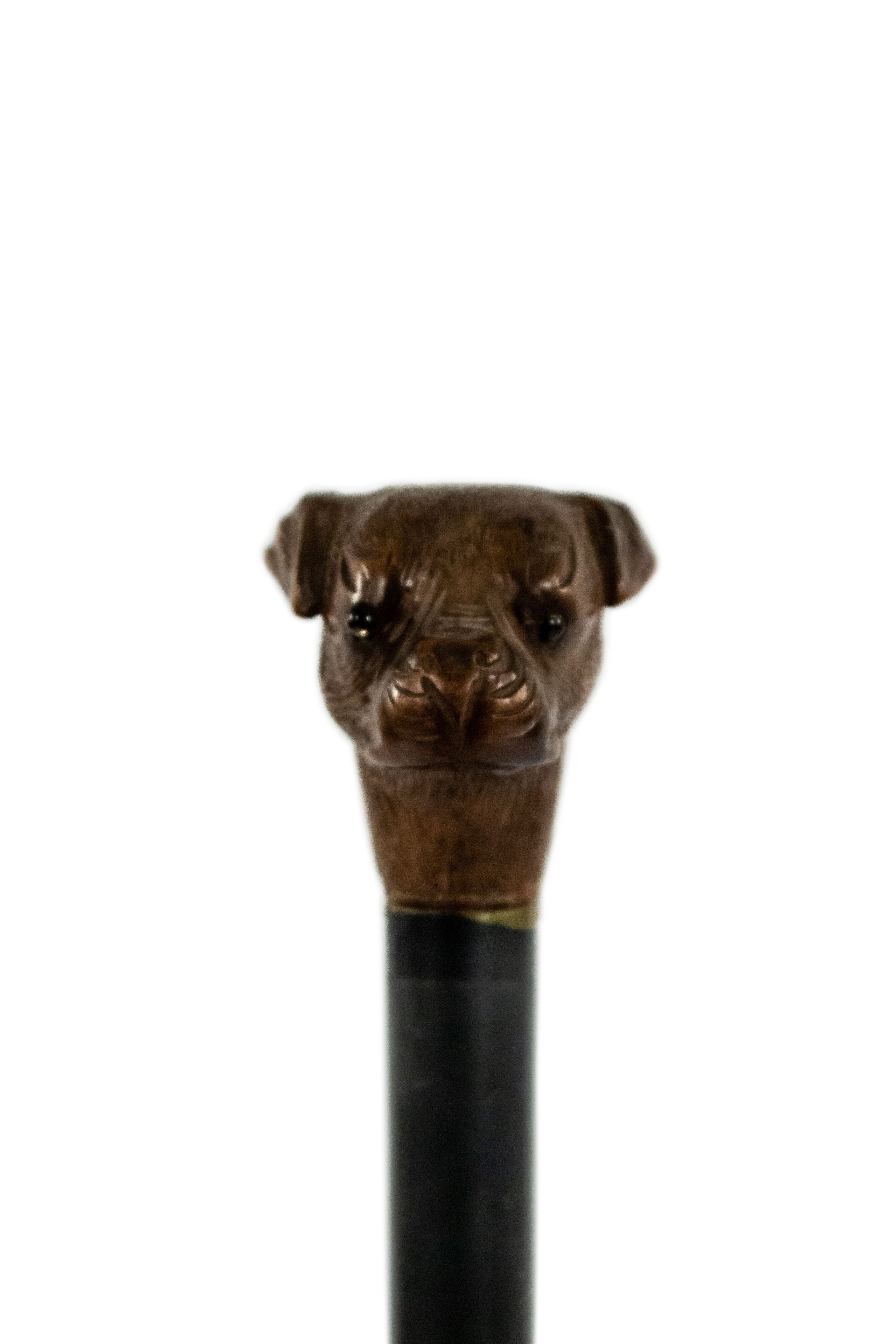 English Victorian walking cane with ebonized shaft and carved bull dog head handle and brass tip
