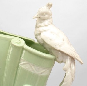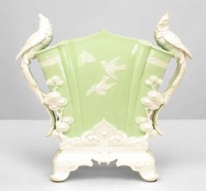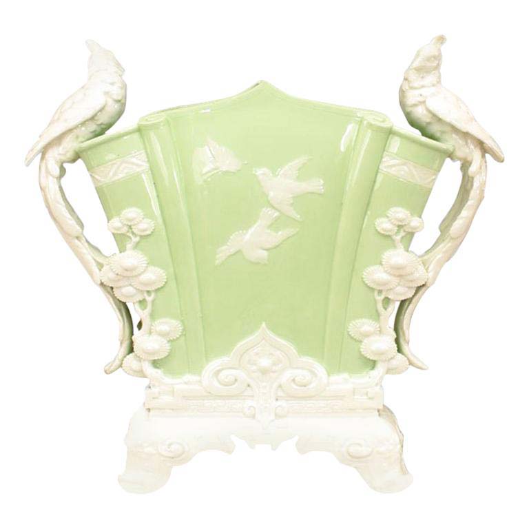 English Victorian celadon and white porcelain oval shaped vase with floral design and bird handles.