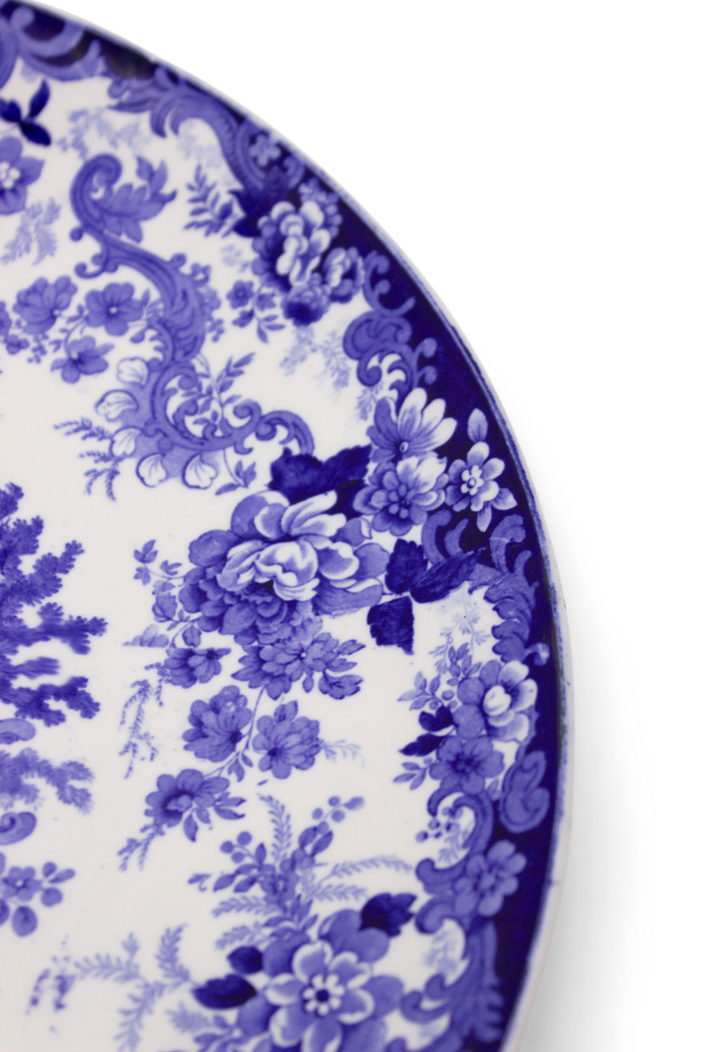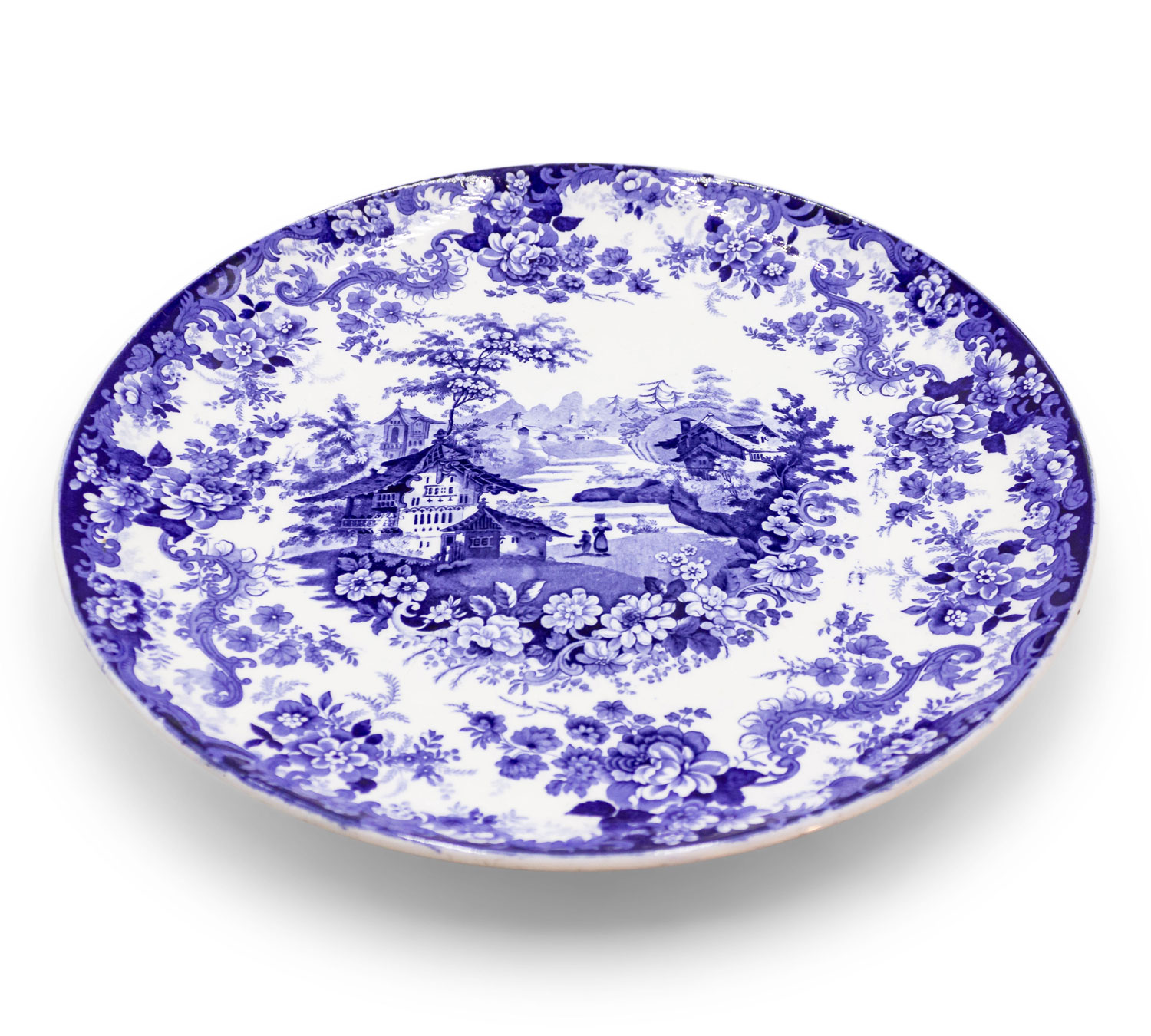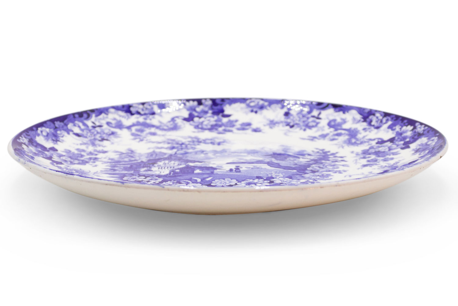PAIR of English Victorian blue and white ceramic chargers with floral design and landscape scenes. (signed MINTON, one dated 1902, the other 1895-1900) (PRICED AS PAIR).(1 has wall mounting wire back).