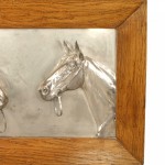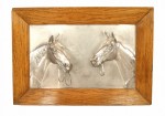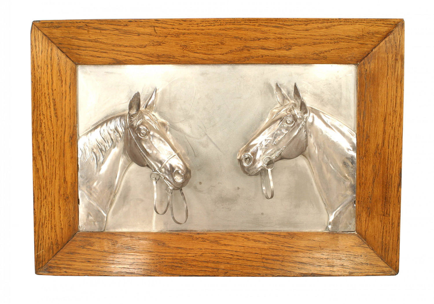 PAIR of English Victorian Country-style (19/20th Century) silver plate wall plaques of horse heads in oak frames. (PRICED AS PAIR).