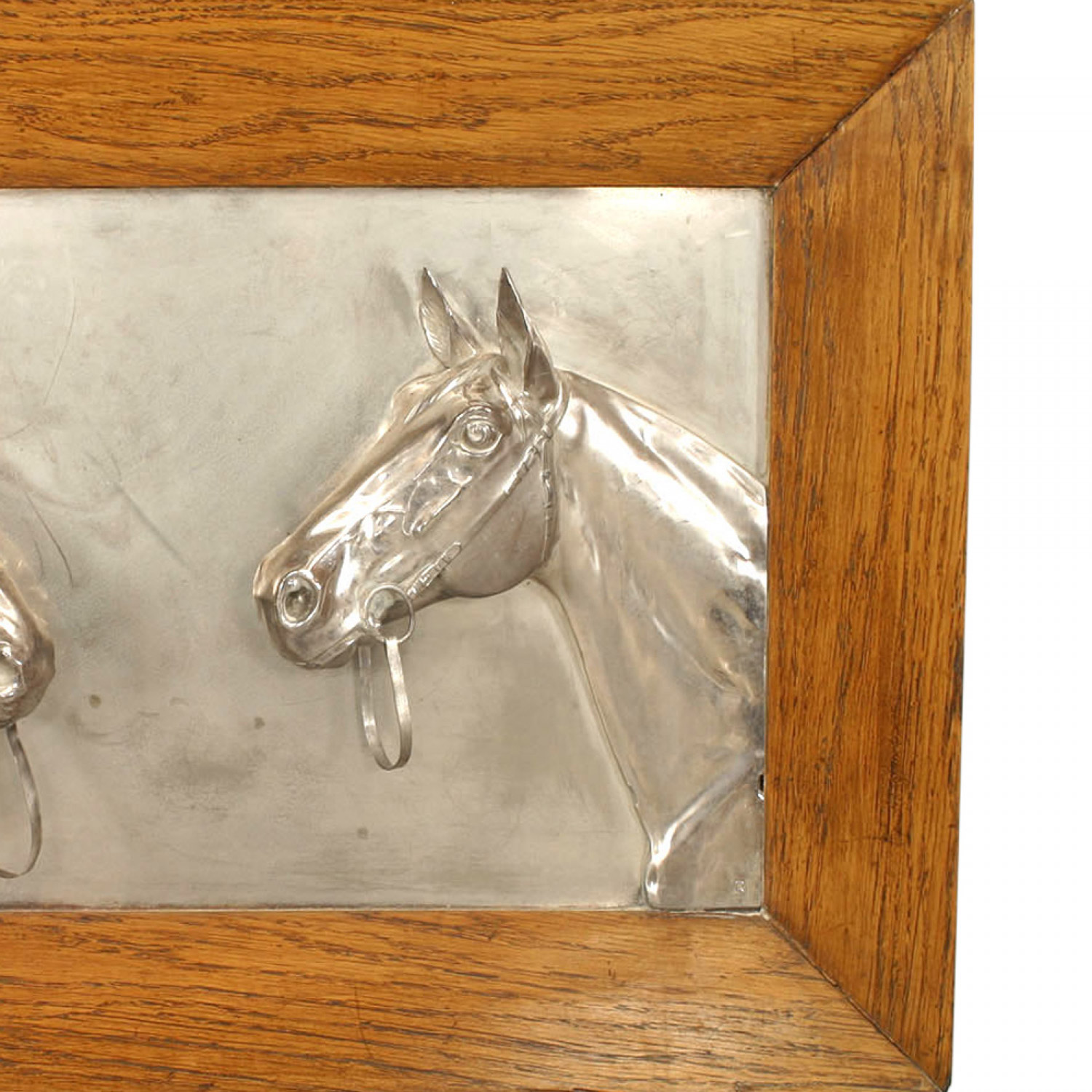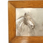 PAIR of English Victorian Country-style (19/20th Century) silver plate wall plaques of horse heads in oak frames. (PRICED AS PAIR)