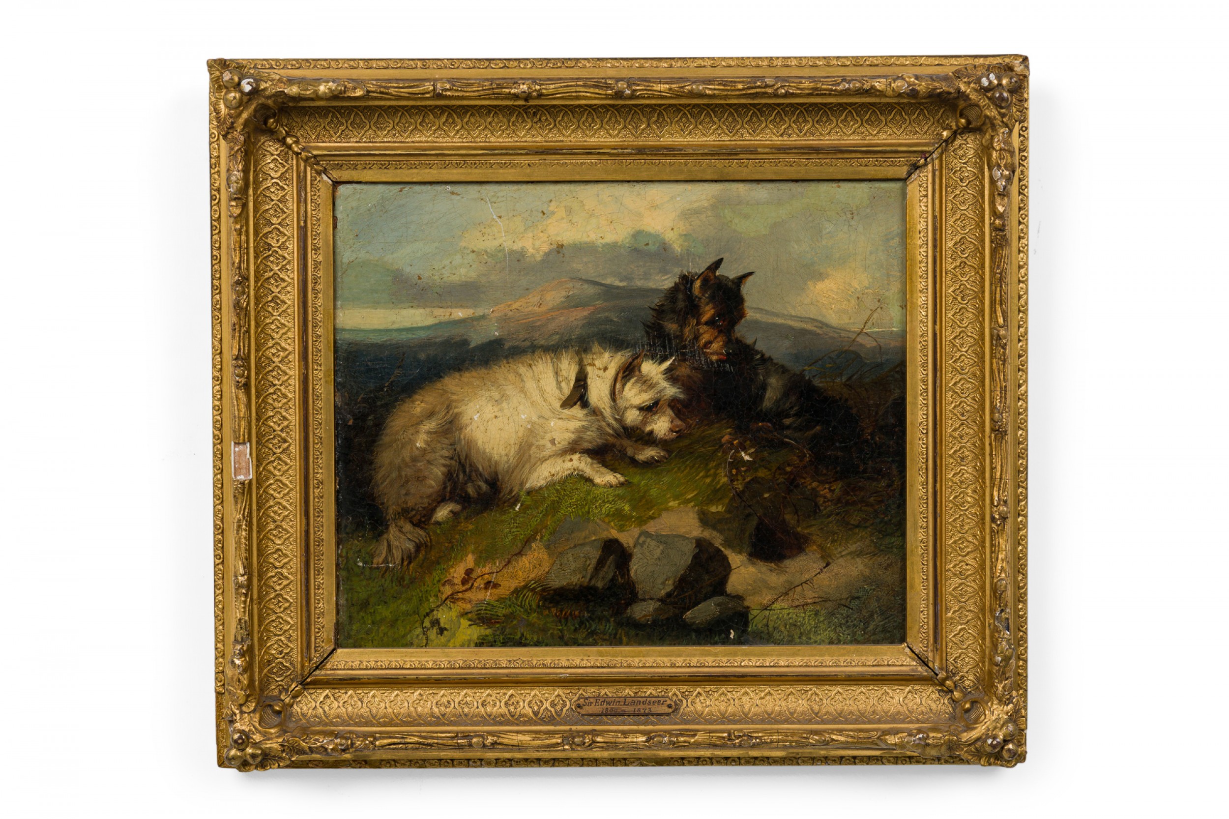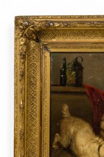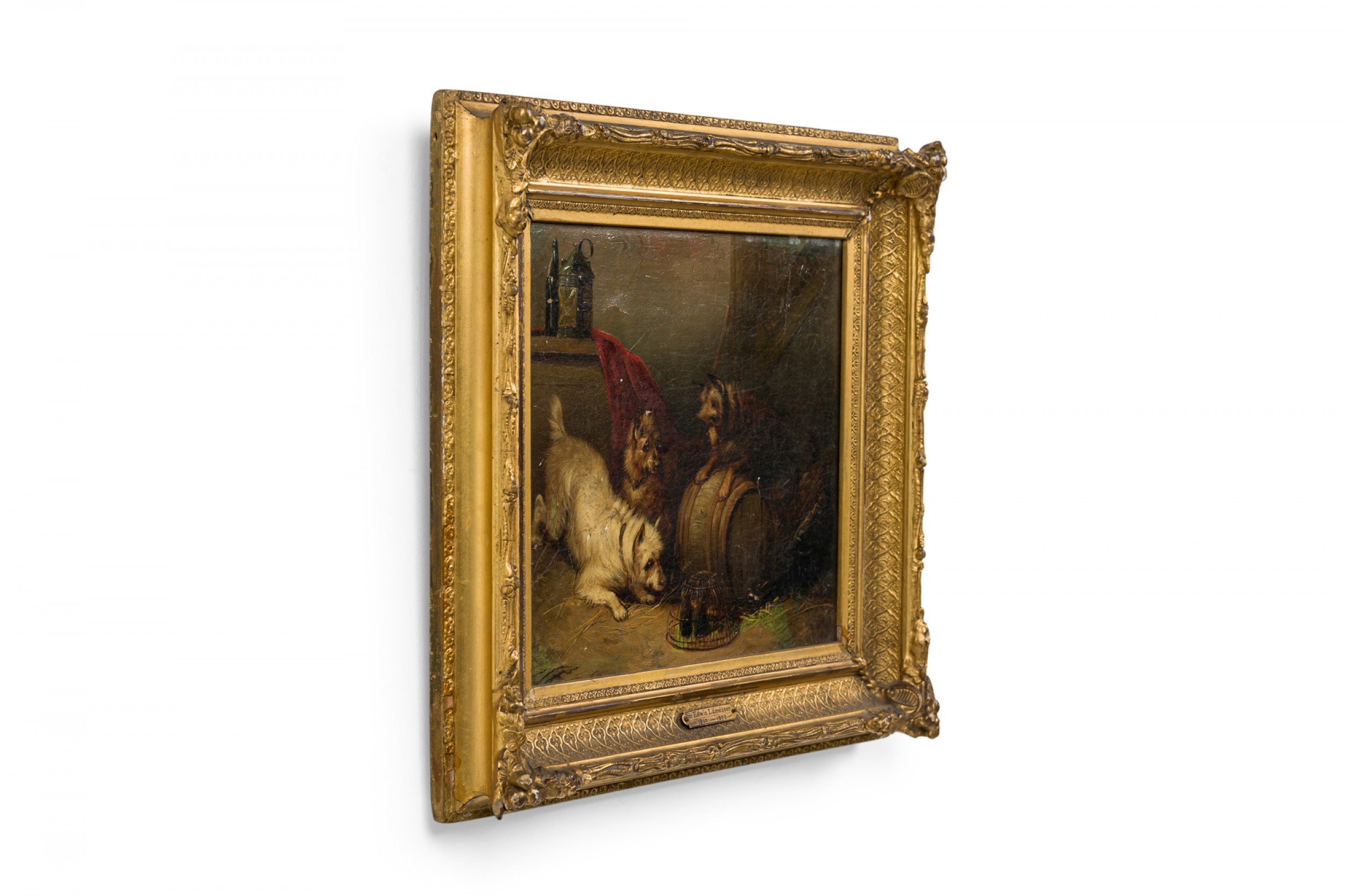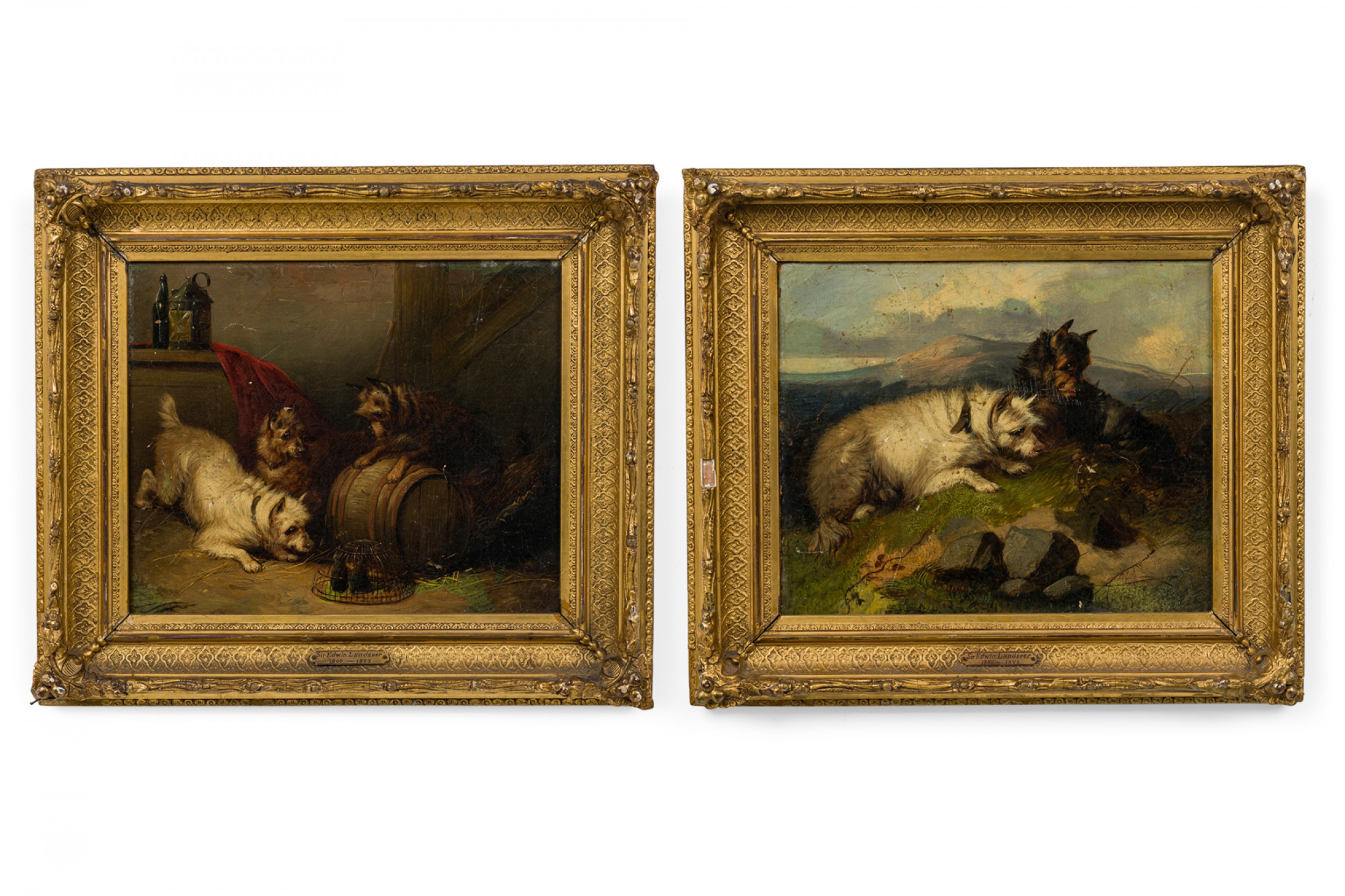 PAIR of English Victorian oil paintings in gilt carved frames of dogs stalking mice in a cage/animal in a hole in the ground. (by EDWIN LANDSEER) (repairs to canvas).