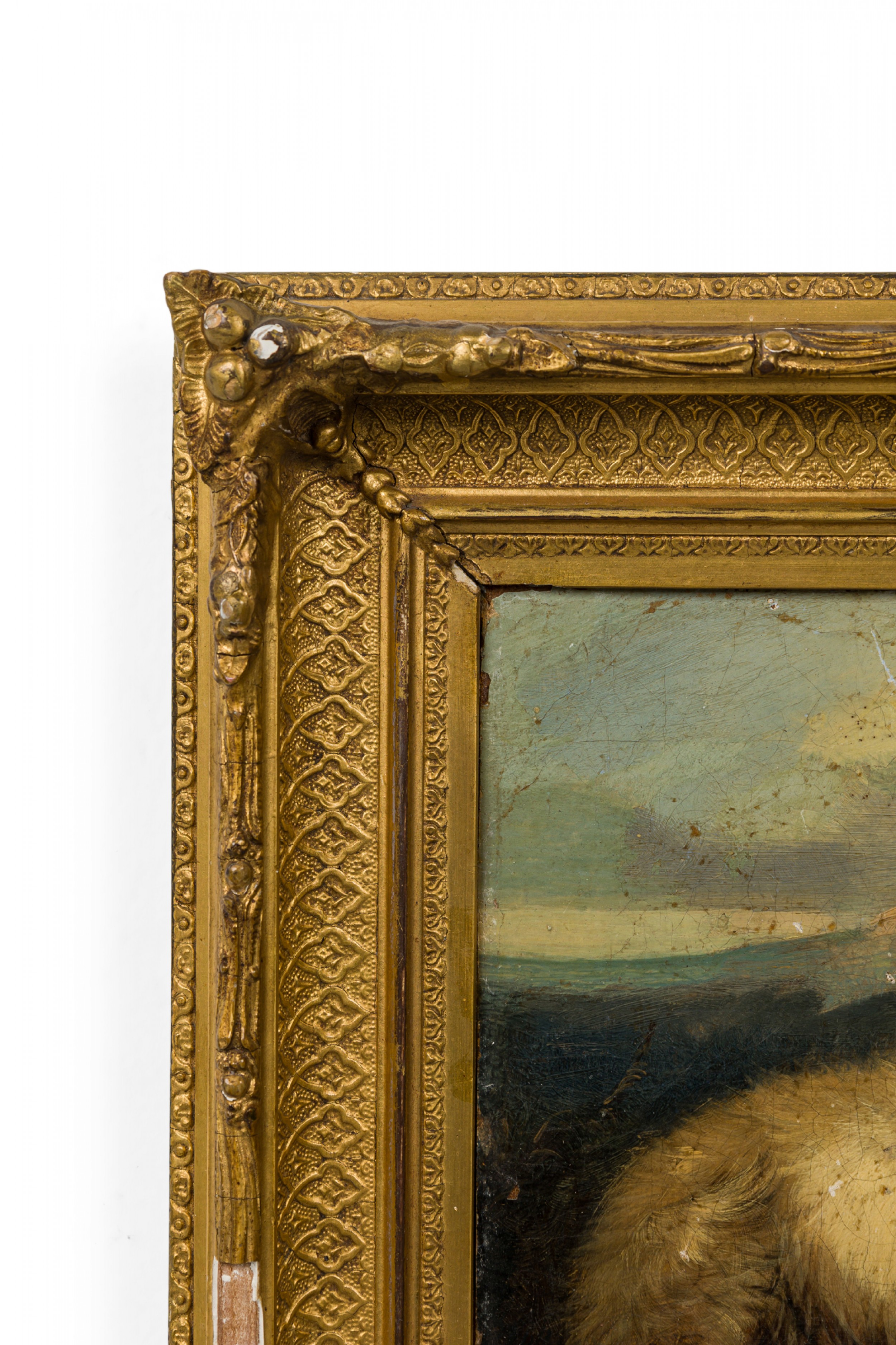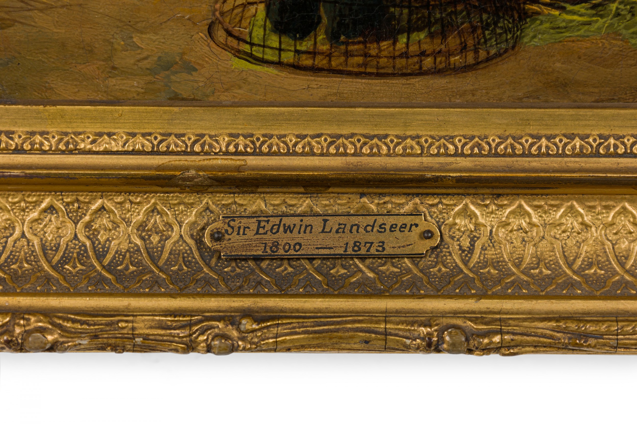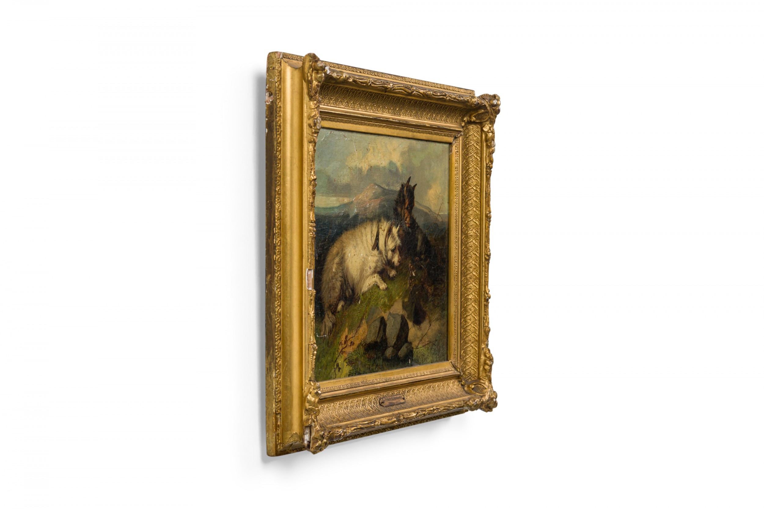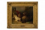 PAIR of English Victorian oil paintings in gilt carved frames of dogs stalking mice in a cage/animal in a hole in the ground. (by EDWIN LANDSEER) (repairs to canvas).